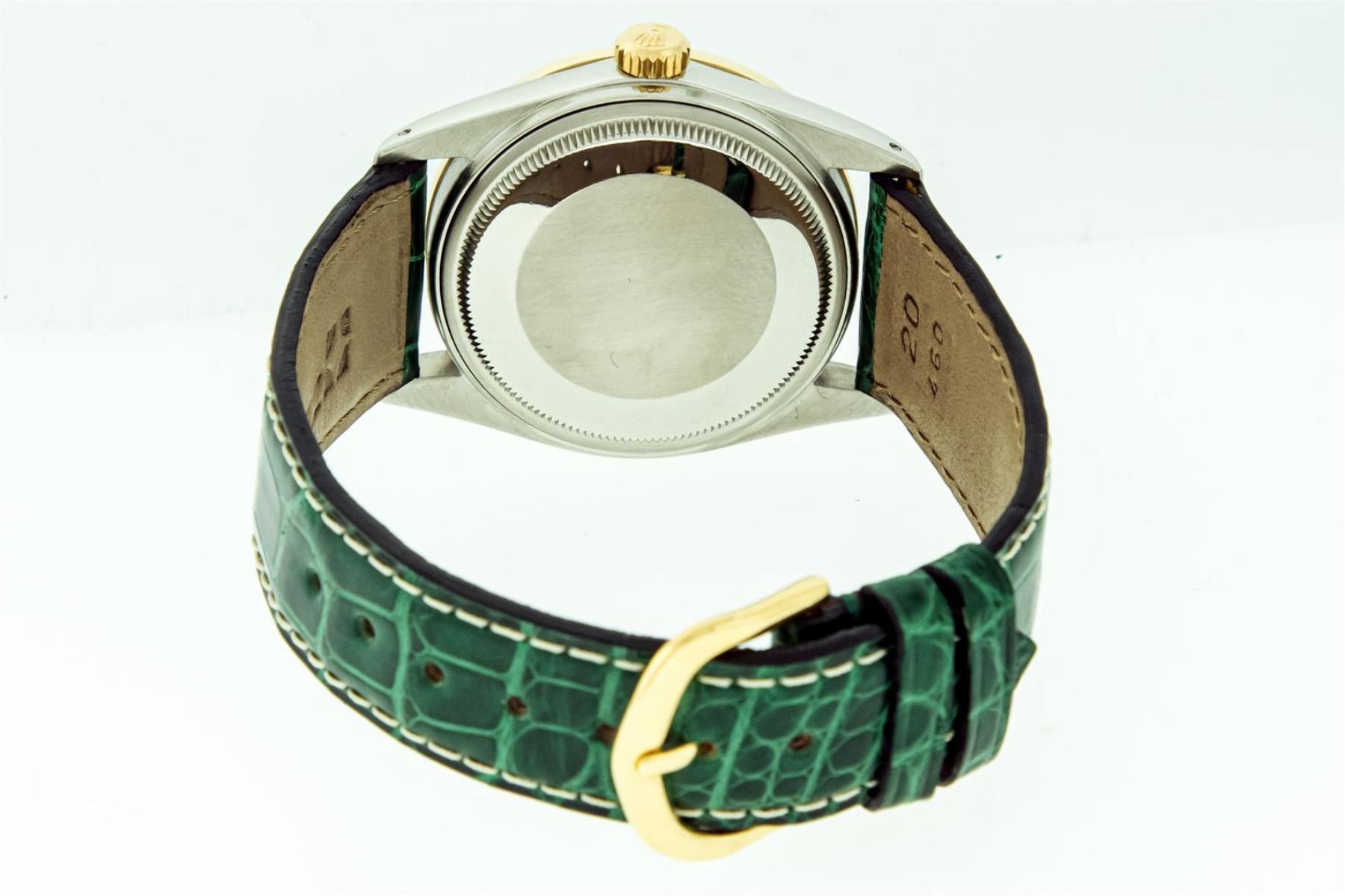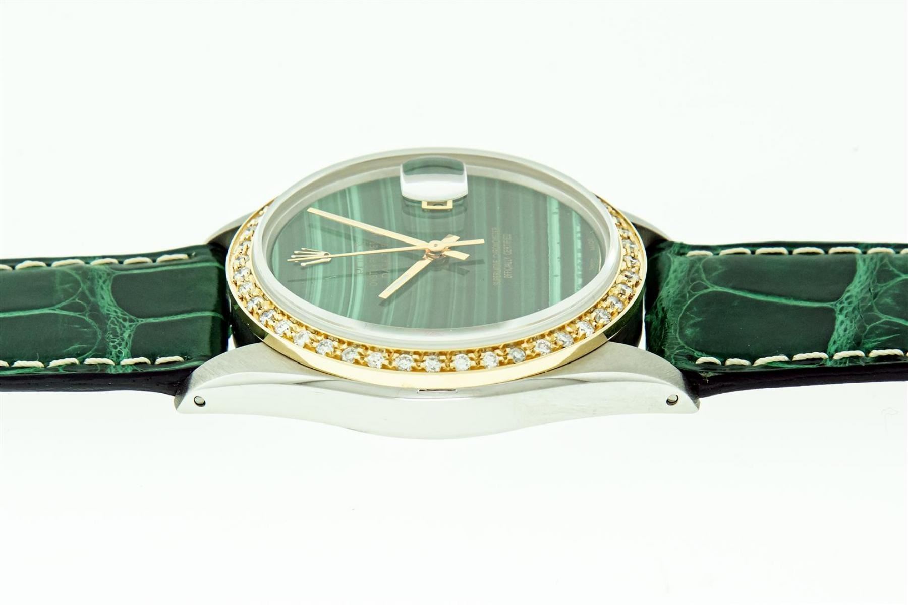 One Mens Yellow Gold Two Tone Rolex Datejust Polished, Serviced & Electronically Tested, Yellow Gold & Stainless Steel Case: 36mm, Yellow Gold Crown, Custom Bezel: 18K Yellow Gold Beadset Diamond Bezel, Diamond Count: 44 Diamonds In Bezel, Total Bezel Weight 1.00 Carat, Clarity: SI-VS, Color: G to H. Custom Crystal: New Scratch Resistant Synthetic Sapphire Cyclops Lens. Custom Hands: New Luminecent Hands. Movement: Automatic Winding Movement. Custom Dial: Green Malachite Dial. Date Window: 3 O'Clock Position Date Display, Quickset, Model: Datejust. Condition: G-6 Extra Fine. Custom Band: New Green Leather Band With White Stitching. 7.0 Inch Length. New Custom Pink Buckle Clasp. This Watch Has Been Serviced Time Tested And Is In Excellent Condition It Is Free Of All Scratches And Dents.