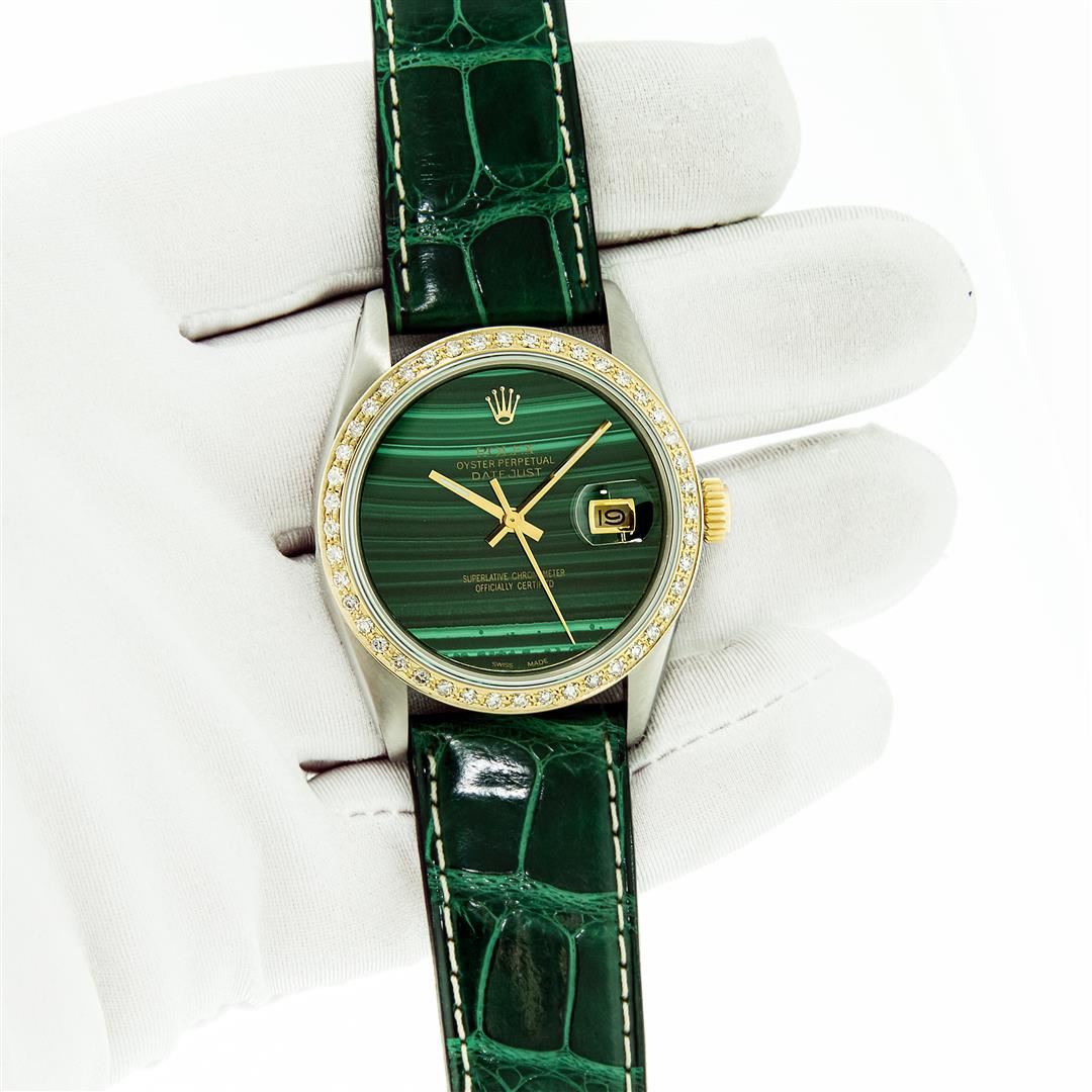 One Mens Yellow Gold Two Tone Rolex Datejust Polished, Serviced & Electronically Tested, Yellow Gold & Stainless Steel Case: 36mm, Yellow Gold Crown, Custom Bezel: 18K Yellow Gold Beadset Diamond Bezel, Diamond Count: 44 Diamonds In Bezel, Total Bezel Weight 1.00 Carat, Clarity: SI-VS, Color: G to H. Custom Crystal: New Scratch Resistant Synthetic Sapphire Cyclops Lens. Custom Hands: New Luminecent Hands. Movement: Automatic Winding Movement. Custom Dial: Green Malachite Dial. Date Window: 3 O'Clock Position Date Display, Quickset, Model: Datejust. Condition: G-6 Extra Fine. Custom Band: New Green Leather Band With White Stitching. 7.0 Inch Length. New Custom Pink Buckle Clasp. This Watch Has Been Serviced Time Tested And Is In Excellent Condition It Is Free Of All Scratches And Dents.