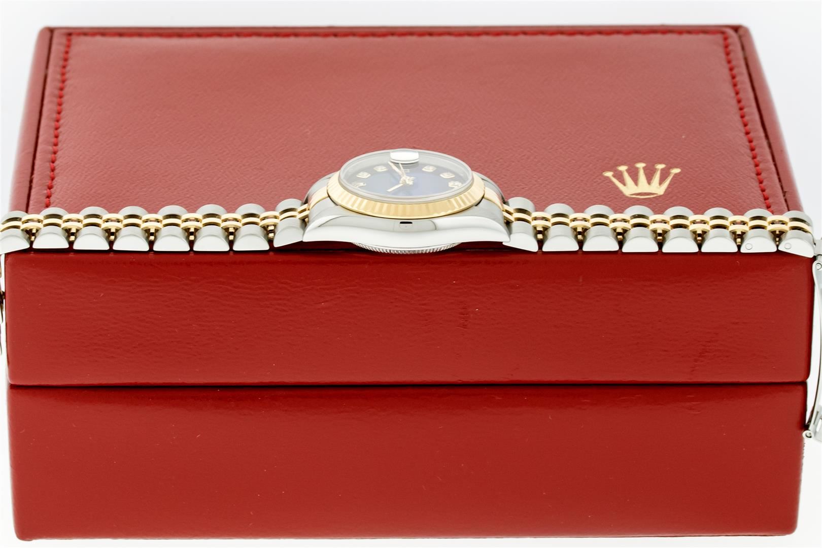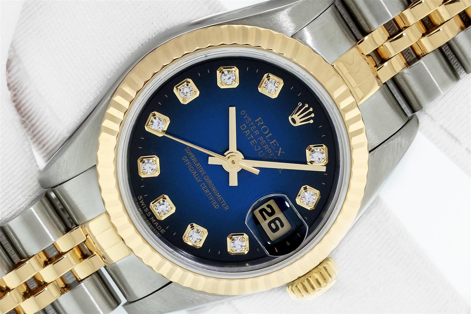 Rolex Ladies Quickset 18K Yellow Gold and Stainless Steel Two Tone Oyster Perpetual Datejust Polished Bright with Satin Finish, Serviced & Electronically Tested, Stainless Steel Case: 26mm, 18K Yellow Gold Crown, Bezel: Original Rolex 18K Yellow Gold Fluted Bezel. Custom Crystal: New Scratch Resistant Sapphire Cyclops Lens. Hands: Genuine Rolex None luminous hands. Movement: Automatic Winding Movement 2135. Original Dial: Rare Rolex Factory Blue Vignette Diamond Dial, Diamond Count: 10 Diamonds In Dial, Clarity:VVS, Date Window: 3 O'Clock Position Date Display, Model: Quickset Datejust 69173, Condition: G-6 Extra Fine. Original Bracelet: Nice Tight Stainless Steel and 18K Yellow Gold Jubilee Band. Bright Polish & Satin Finish. 6.25 Inch Length, Adjustable. Standard Clasp, With Rolex Logo. This Watch Has Been Serviced Time Tested And Is In Excellent Condition It Is Free Of All Scratches And Dents. This Rolex Complete Set Comes With The Following Accessories: Rolex Box, Rolex Booklets, Rolex Original Warranty Papers, Rolex Hang Tag, Rolex Wallet and Polishing Cloth.