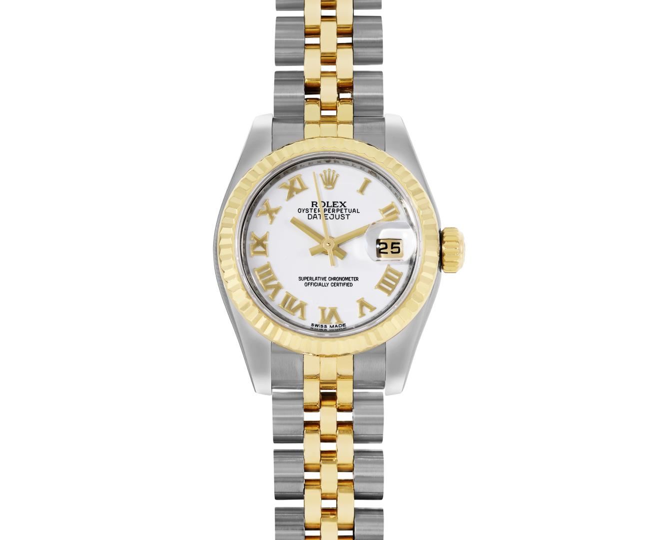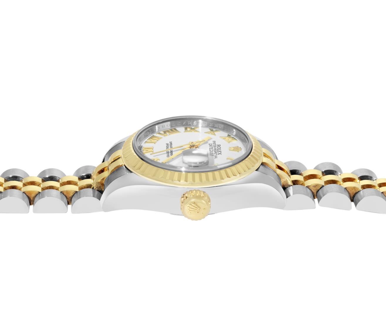 One Rolex Ladies Pre Owned Two Tone 18K Yellow Gold And Stainless Steel Rolex Datejust Polished, Serviced & Electronically Tested, Rolex Yellow Gold And Stainless Steel Case: 26mm, Rolex Yellow Gold Crown. Rolex 18K Yellow Gold Fluted Bezel. Crystal: Sapphire Crystal With Date Window. Hands: Solid Hands. Rolex Movement: 2235 Automatic Winding Movement. Rolex Factory Dial: Factory White Roman Dial. Date Window: 3 O'Clock Position Date Display, Condition: G-6 Extra Fine. Rolex Bracelet: Two Tone 18K Yellow Gold And Stainless Steel Jubilee Band. Bright Polish And Satin Finish. 6.0 Inch Length, Adjustable. Hidden Clasp, With Rolex Logo. This Watch Has Been Serviced Time Tested And Is In Excellent Condition It Is Free Of All Scratches And Dents. This Watch Comes With A Rolex Box.