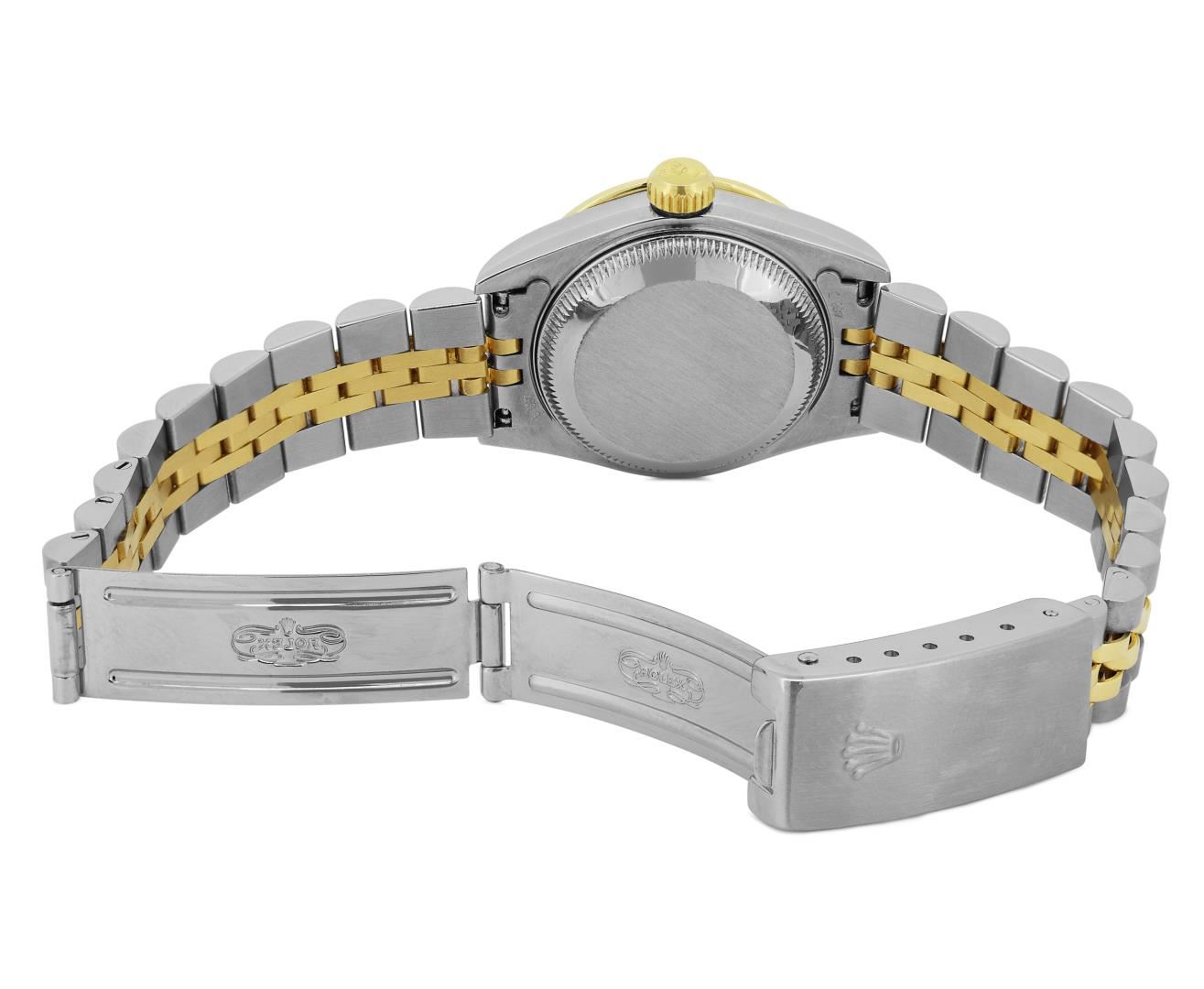 One Ladies Pre Owned Sapphire Rolex Two Tone 18K Yellow Gold And Stainless Steel Rolex Datejust Polished, Serviced & Electronically Tested, Rolex Yellow Gold And Stainless Steel Case: 26mm, Custom Diamond Lugs: 24 Added Diamonds On Lugs. Rolex Yellow Gold Crown. Custom Bezel: New 18K Yellow Gold Emerald Beadset Diamond Bezel, Diamond + Gem Count: 36 Diamonds + 4 Emeralds. Crystal: Sapphire Crystal With Date Window. Custom Hands: New Luminescent Hands. Rolex Movement: Automatic Winding Movement 2235. Rolex Factory Dial: Silver With Index Markers And Dash Track and Lumi Dots. Date Window: 3 O'Clock Position Date Display, Condition: G-6 Extra Fine. Rolex Bracelet: Two Tone 18K Yellow Gold And Stainless Steel Jubilee Band. Bright Polish & Satin Finish. 6.0 Inch Length, Adjustable. Standard Clasp, With Rolex Logo. This Watch Has Been Serviced And Time Tested. It Is In Excellent Condition, Free Of All Scratches And Dents.
