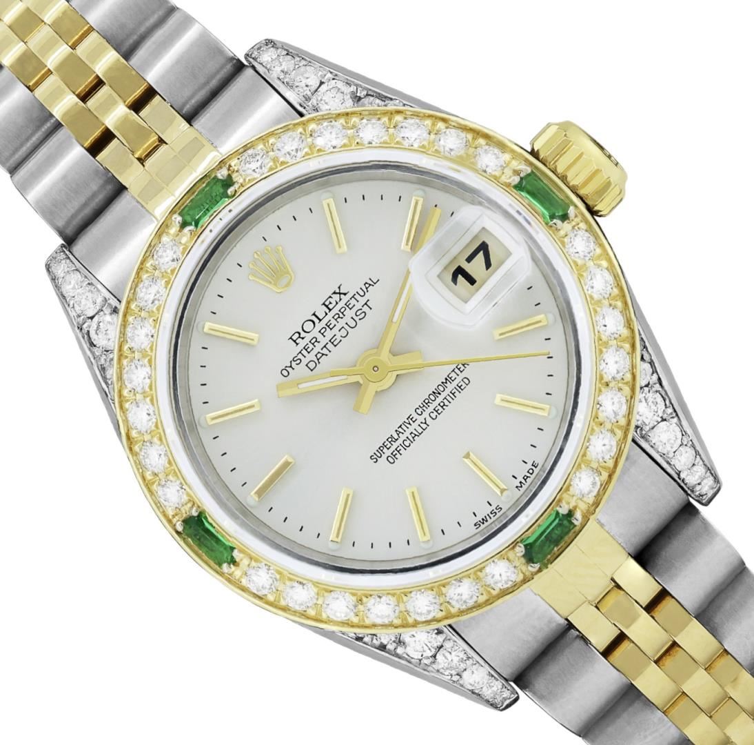 One Ladies Pre Owned Sapphire Rolex Two Tone 18K Yellow Gold And Stainless Steel Rolex Datejust Polished, Serviced & Electronically Tested, Rolex Yellow Gold And Stainless Steel Case: 26mm, Custom Diamond Lugs: 24 Added Diamonds On Lugs. Rolex Yellow Gold Crown. Custom Bezel: New 18K Yellow Gold Emerald Beadset Diamond Bezel, Diamond + Gem Count: 36 Diamonds + 4 Emeralds. Crystal: Sapphire Crystal With Date Window. Custom Hands: New Luminescent Hands. Rolex Movement: Automatic Winding Movement 2235. Rolex Factory Dial: Silver With Index Markers And Dash Track and Lumi Dots. Date Window: 3 O'Clock Position Date Display, Condition: G-6 Extra Fine. Rolex Bracelet: Two Tone 18K Yellow Gold And Stainless Steel Jubilee Band. Bright Polish & Satin Finish. 6.0 Inch Length, Adjustable. Standard Clasp, With Rolex Logo. This Watch Has Been Serviced And Time Tested. It Is In Excellent Condition, Free Of All Scratches And Dents.