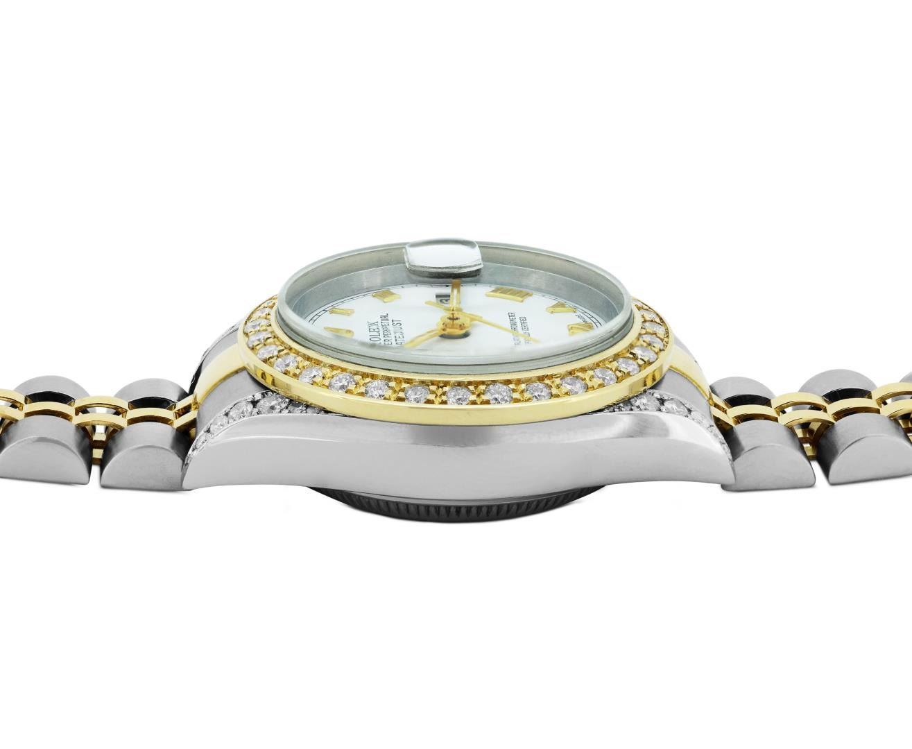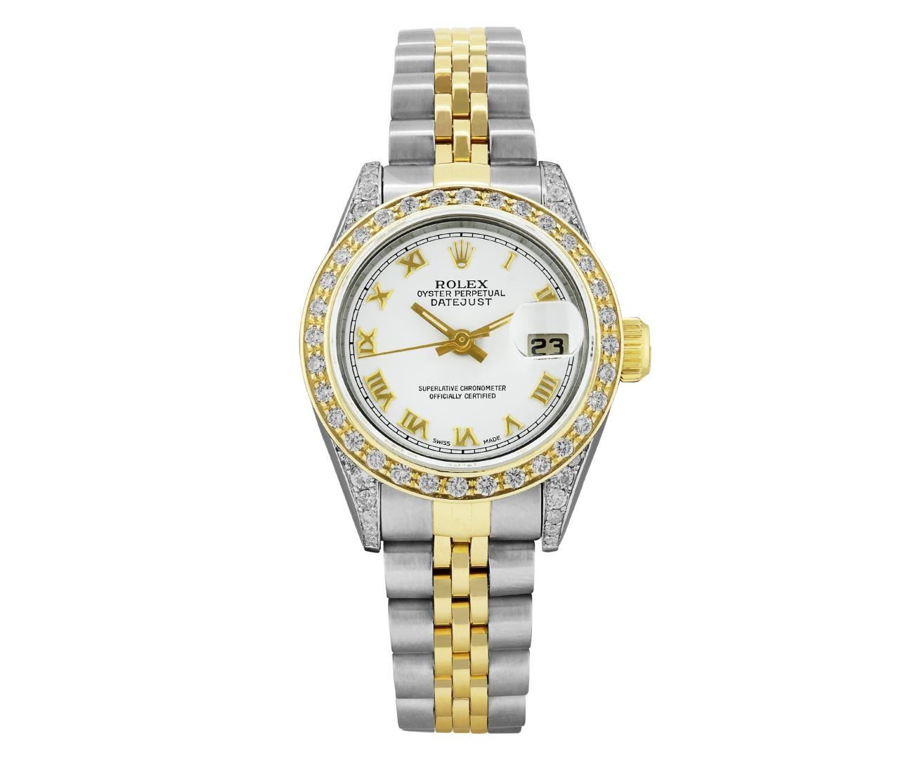 One Rolex Ladies Pre Owned Sapphire Two Tone 18K Yellow Gold And Stainless Steel Rolex Datejust Polished, Serviced And Electronically Tested, Rolex Yellow Gold And Stainless Steel Case: 26mm, Custom Diamond Lugs: 24 Added Diamonds On Lugs. Rolex Yellow Gold Crown. Custom Bezel: New 18K Yellow Gold Beadset Diamond Bezel, Diamond Count: 32 Diamonds On Bezel. Crystal: Sapphire Crystal With Date Window. Hands: Custom Hands: New Luminescent Hands. Rolex Movement: Automatic Winding Movement 2235. Rolex Factory Dial: White With Roman Markers And Square Track. Date Window: 3 O'Clock Position Date Display, Condition: G-6 Extra Fine. Rolex Bracelet: Two Tone 18K Yellow Gold And Stainless Steel Jubilee Band. Bright Polish & Satin Finish. 6.0 Inch Length, Adjustable. Standard Clasp, With Rolex Logo. This Watch Has Been Serviced And Time Tested. It Is In Excellent Condition, Free Of All Scratches And Dents. This Watch Comes With A Rolex Box.