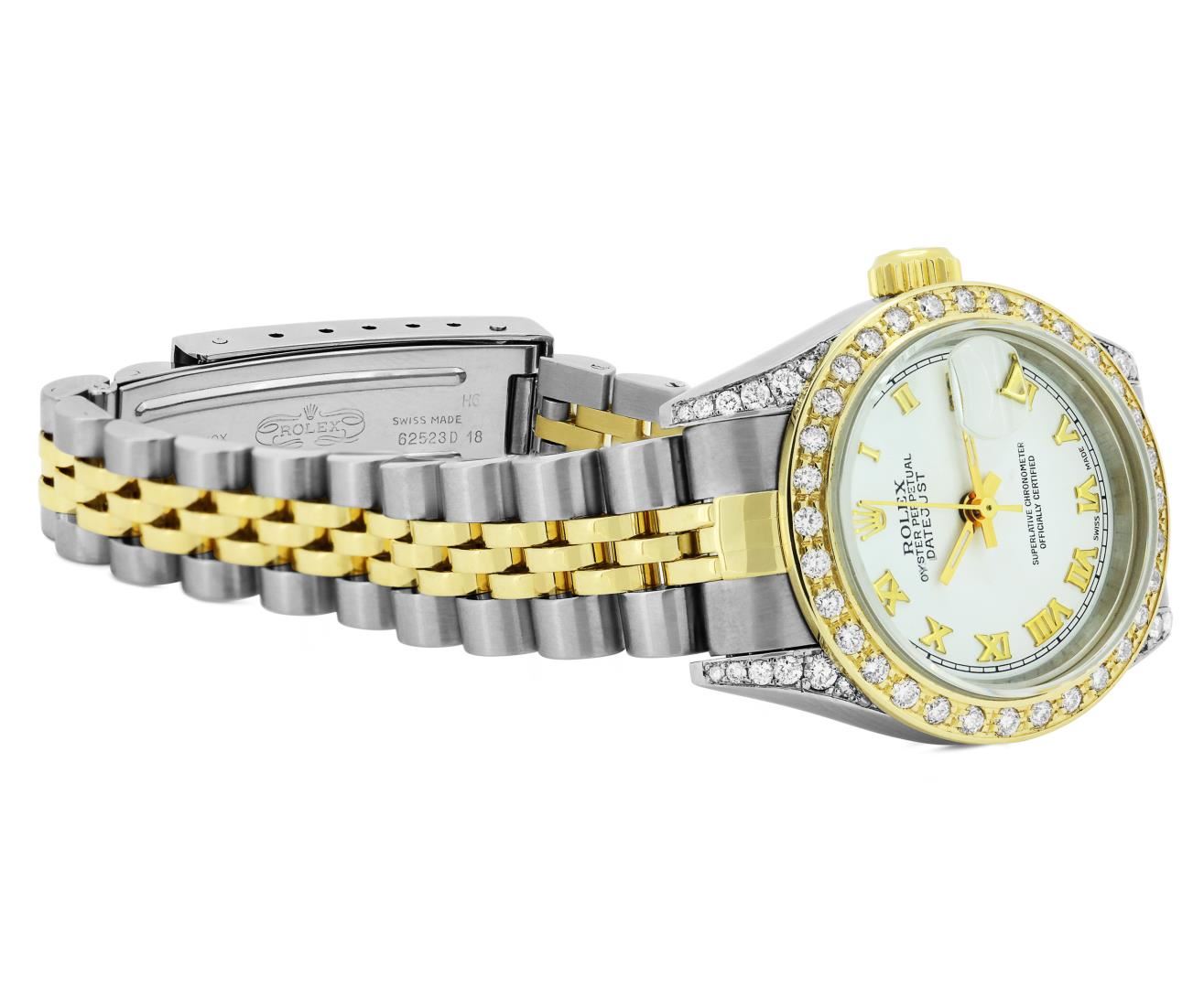 One Rolex Ladies Pre Owned Sapphire Two Tone 18K Yellow Gold And Stainless Steel Rolex Datejust Polished, Serviced And Electronically Tested, Rolex Yellow Gold And Stainless Steel Case: 26mm, Custom Diamond Lugs: 24 Added Diamonds On Lugs. Rolex Yellow Gold Crown. Custom Bezel: New 18K Yellow Gold Beadset Diamond Bezel, Diamond Count: 32 Diamonds On Bezel. Crystal: Sapphire Crystal With Date Window. Hands: Custom Hands: New Luminescent Hands. Rolex Movement: Automatic Winding Movement 2235. Rolex Factory Dial: White With Roman Markers And Square Track. Date Window: 3 O'Clock Position Date Display, Condition: G-6 Extra Fine. Rolex Bracelet: Two Tone 18K Yellow Gold And Stainless Steel Jubilee Band. Bright Polish & Satin Finish. 6.0 Inch Length, Adjustable. Standard Clasp, With Rolex Logo. This Watch Has Been Serviced And Time Tested. It Is In Excellent Condition, Free Of All Scratches And Dents. This Watch Comes With A Rolex Box.