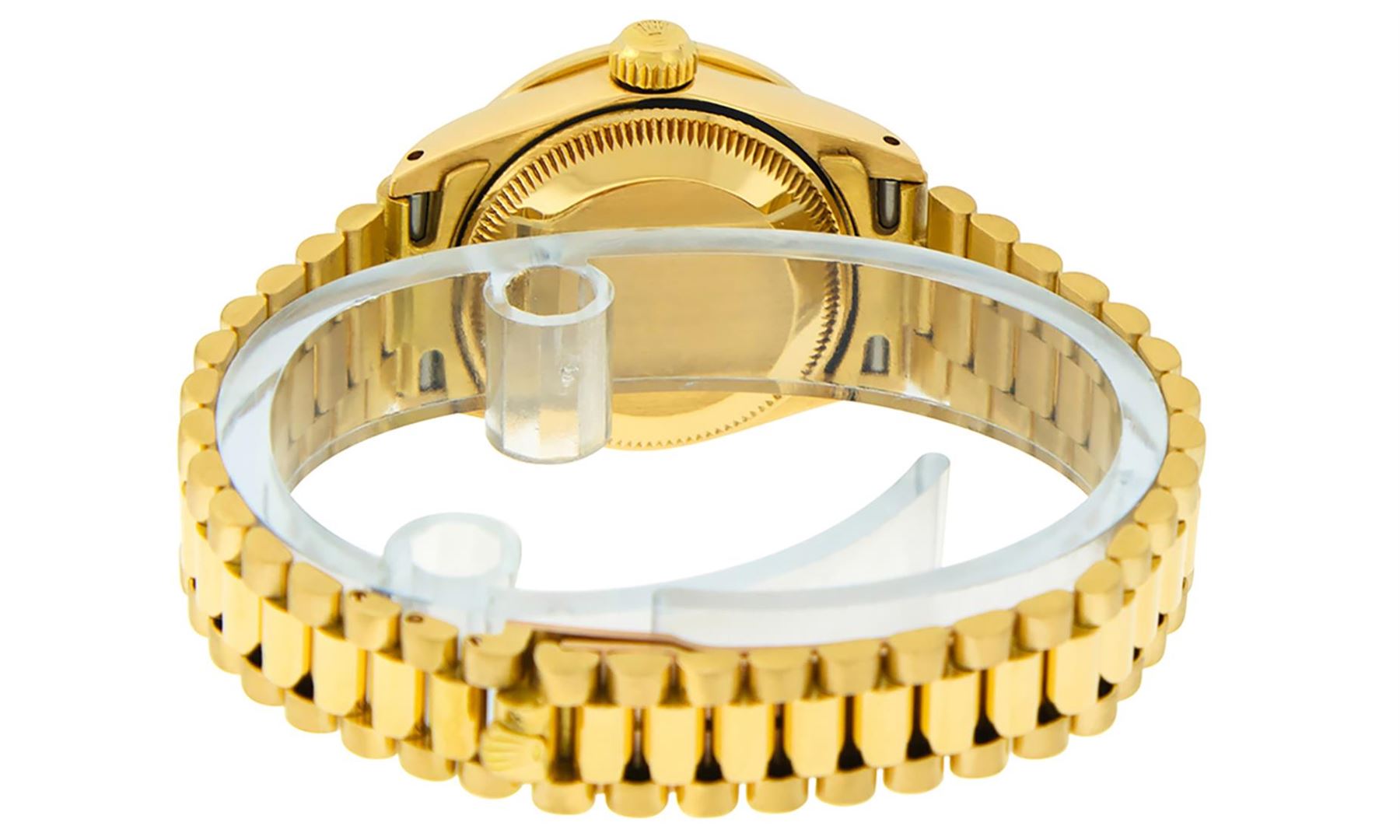 One Ladies 18K Yellow Gold Rolex President Polished, Serviced & Electronically Tested, Yellow Gold Case With Diamond Lugs: 26mm G to H In Color, SI1, Yellow Gold Crown, Custom Diamond Lugs: 24 Diamonds On Lugs, Clarity: SI-VS, Color: G to H, Clarity SI-VS. Custom Bezel: 18K Yellow Gold Ruby Beadset Diamond Bezel, Diamond + Gem Count: 36 Diamonds + 4 Rubies, Total Weight .70 Carat, Clarity: SI-VS, Color: G to H. Custom Crystal: New Scratch Resistant Synthetic Sapphire Cyclops Lens. Custom Hands: New Luminescent Hands. Movement: Automatic Winding Movement. Custom Dial: Refinished Black With Diamond Hour Markers, Diamond Count: 10 Diamonds In Dial, Color: G To H. Clarity: SI-VS. Date Window: 3 O'Clock Position, Model: Datejust, Condition: G-6 Extra Fine. Bracelet: 18K Yellow Gold President Band, Bright & Satin Polish. 6.0 Inch Length, Standard President Clasp (Hidden Clasp), With Rolex Logo. This Watch Has Been Serviced Time Tested And Is In Excellent Condition It Is Free Of All Scratches And Dents.