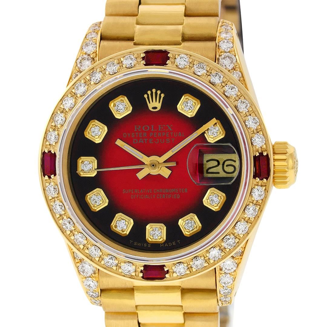 One Ladies Rolex President Polished, Serviced & Electronically Tested, Yellow Gold Case With Diamond Lugs: 26mm G to H In Color, SI1, Yellow Gold Crown, Custom Diamond Lugs: 24 Diamonds On Lugs, Clarity: SI-VS, Color: G to H, Clarity SI-VS. Custom Bezel: New 18K Yellow Gold Ruby Beadset Diamond Bezel, Diamond + Gem Count: 36 Diamonds + 4 Rubies, Total Weight .70 Carat, Clarity: SI-VS, Color: G to H. Custom Crystal: New Scratch Resistant Synthetic Sapphire Cyclops Lens. Custom Hands: New Luminescent Hands. Movement: Automatic Winding Movement Caliber 2030. Custom Dial: Refinished Red Vignette With Diamond Hour Markers, Stone Count: 10 Diamonds On Dial, Color: G To H. Clarity: SI-VS. Date Window: 3 O'Clock Position, Model: Datejust, Condition: G-6 Extra Fine. Bracelet: 18K Yellow Gold President Band, Bright & Satin Polish. 6.0 Inch Length, Standard President Clasp (Hidden Clasp), With Rolex Logo. This Watch Comes With A Rolex Box, Wooden Watch Winder, & Appraisal. This Watch Has Been Serviced Time Tested And Is In Excellent Condition It Is Free Of All Scratches And Dents.