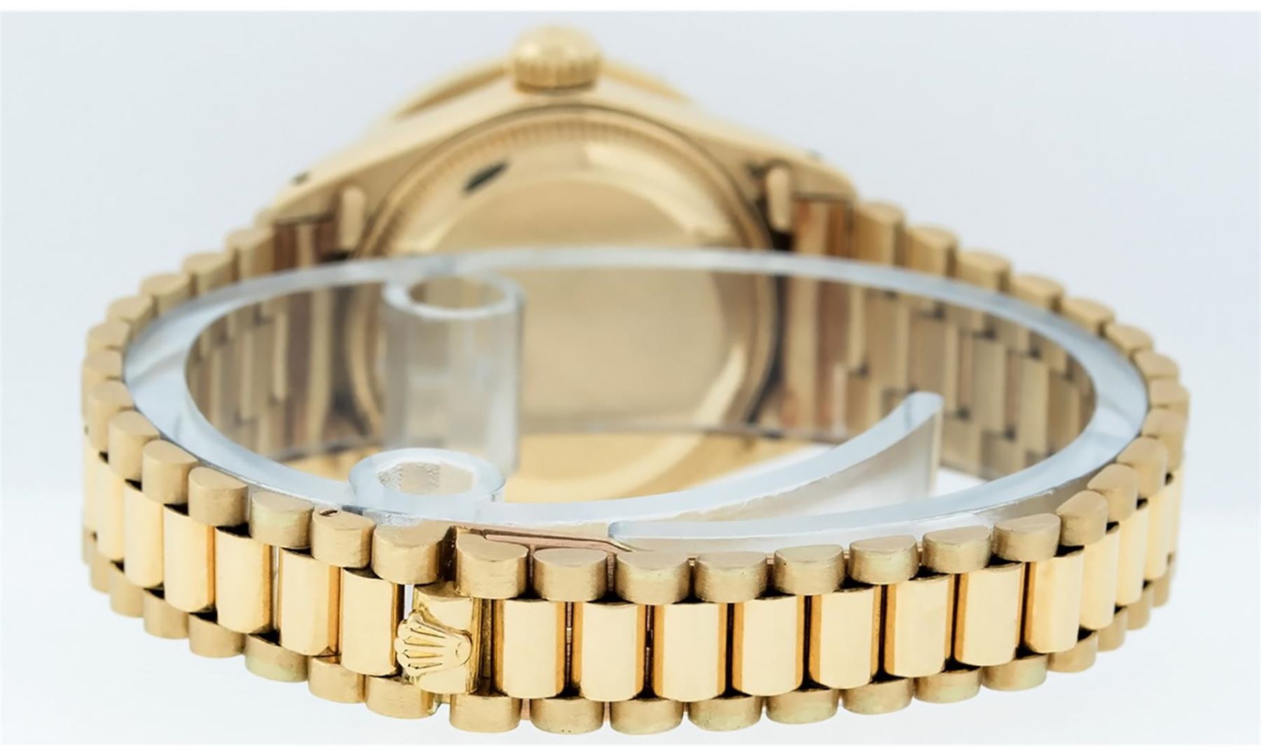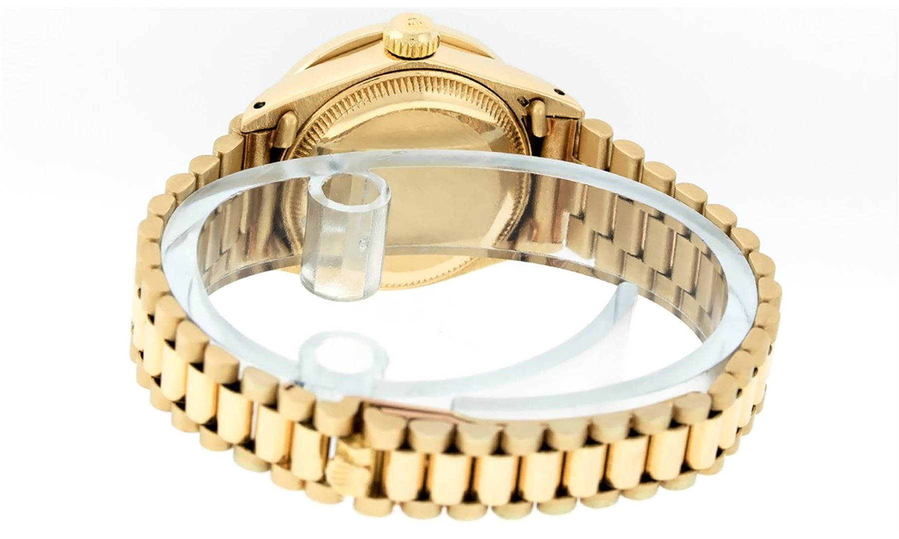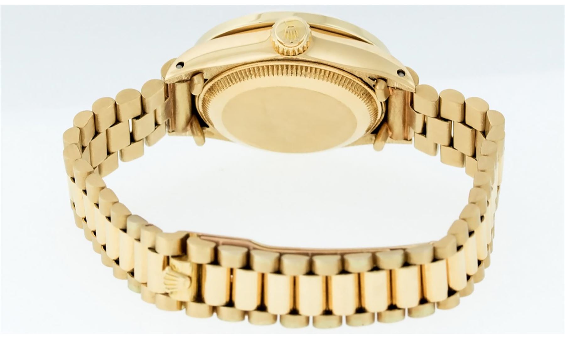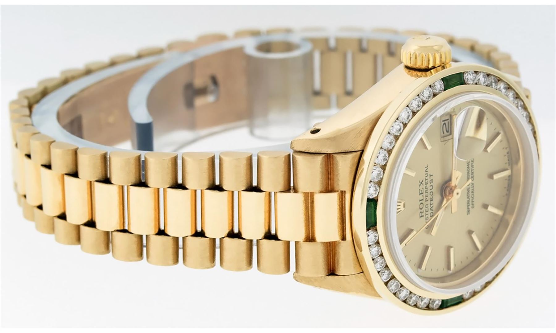 One Ladies Pre Owned 18K Yellow Gold Rolex President Polished, Serviced & Electronically Tested, Rolex Yellow Gold Case: 26mm, 18K Yellow Gold Crown, Custom Bezel: New 18K Yellow Gold Emerald Channel Set Diamond Bezel, Diamond + Stone Count: 36 Diamonds + 4 Emeralds. Total Weight 1.00 Carat, Clarity: SI-VS, Color: G to H. Custom Crystal: New Sapphire With Magnified Date Window. Custom Hands: New Luminescent Hands. Rolex Movement: Automatic Winding Movement. Rolex Dial: Champagne Index With Dash Track & Lumi Dots. Date Window: 3 O'Clock Position, Model: Datejust President, Condition: G-6 Extra Fine. Rolex Bracelet: 18K Yellow Gold President With Hidden Clasp, Bright & Satin Polish. 6.0 Inch Length, Standard President Clasp (Hidden Clasp), With Rolex Logo. This Watch Has Been Serviced Time Tested And Is In Excellent Condition It Is Free Of All Scratches And Dents.