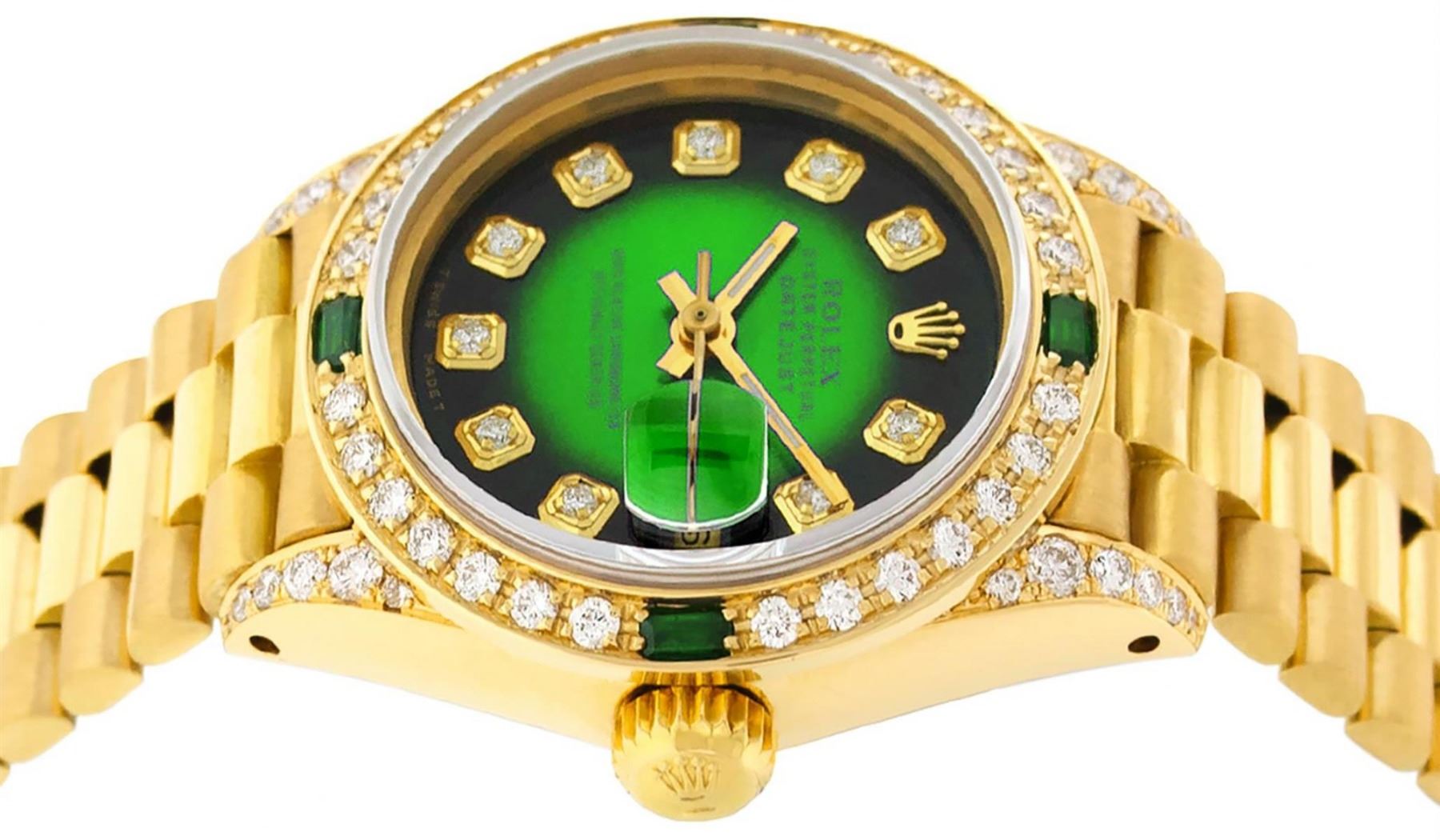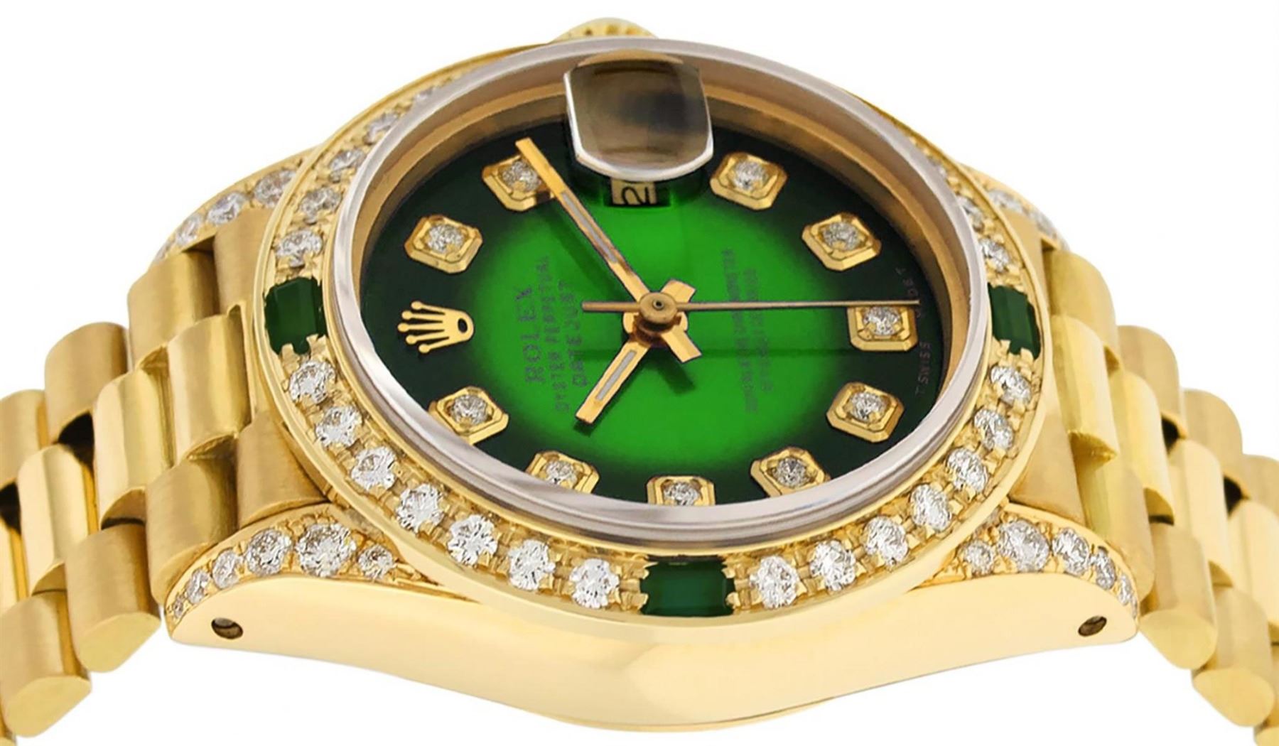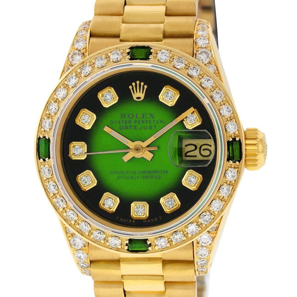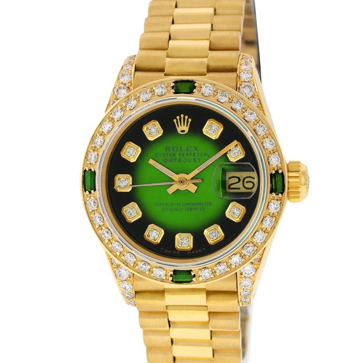 One Ladies Rolex President Polished, Serviced & Electronically Tested, 18K Yellow Gold Case With Diamond Lugs: 26mm G to H In Color, SI1, Yellow Gold Crown, Custom Diamond Lugs: 24 Diamonds On Lugs, Clarity: SI-VS, Color: G to H, Clarity SI-VS. Custom Bezel: 18K Yellow Gold Emerald Beadset Diamond Bezel, Diamond + Gem Count: 36 Diamonds + 4 Emeralds, Total Weight .70 Carat, Clarity: SI-VS, Color: G to H. Custom Crystal: New Scratch Resistant Synthetic Sapphire Cyclops Lens. Custom Hands: New Luminescent Hands. Movement: Automatic Winding Movement Caliber 2030. Custom Dial: Refinished Green Vignette With Diamond Hour Markers, Color: G To H. Clarity: SI-VS. Date Window: 3 O'Clock Position, Model: Datejust, Condition: G-6 Extra Fine. Bracelet: 18K Yellow Gold President Band, Bright & Satin Polish. 6.0 Inch Length, Standard President Clasp (Hidden Clasp), With Rolex Logo. This Watch Comes With A Rolex Box, Watch Winder And Appraisal. This Watch Has Been Serviced Time Tested And Is In Excellent Condition It Is Free Of All Scratches And Dents.
