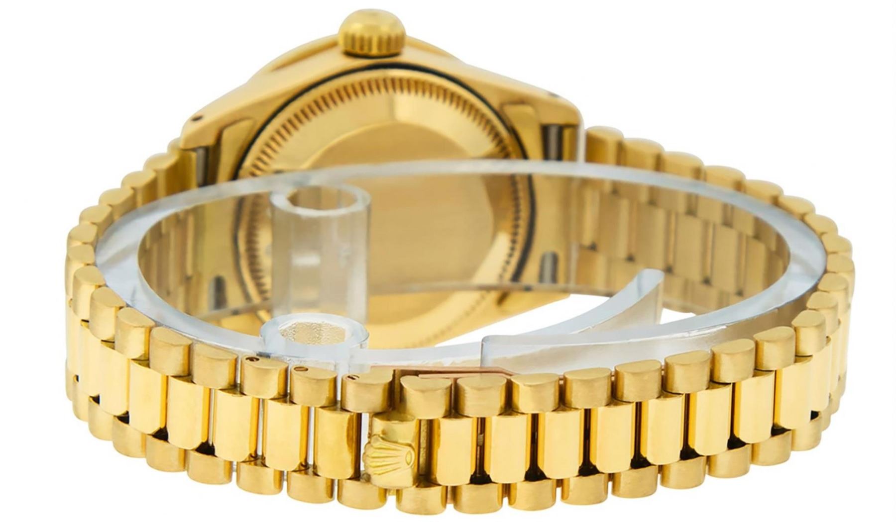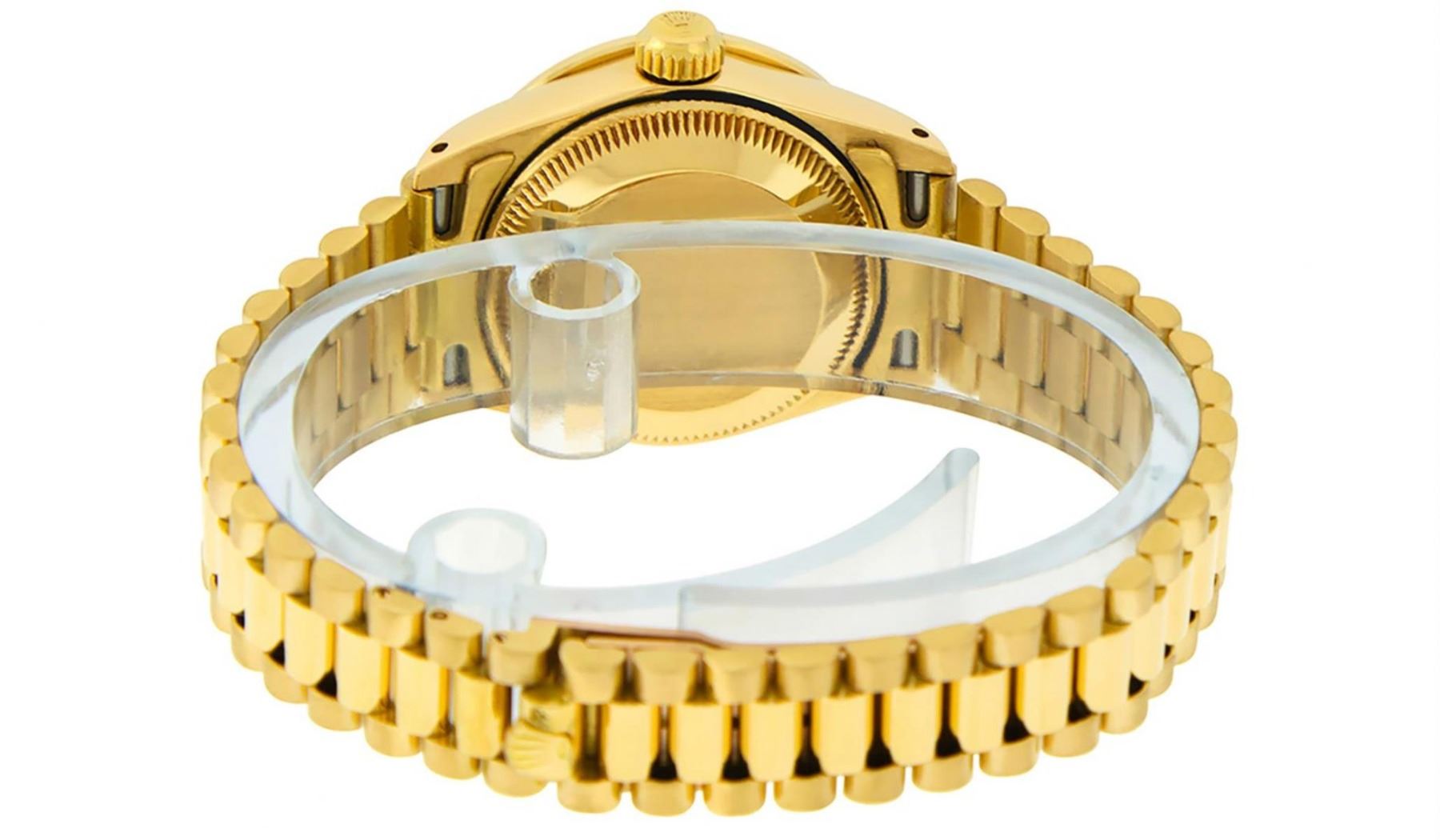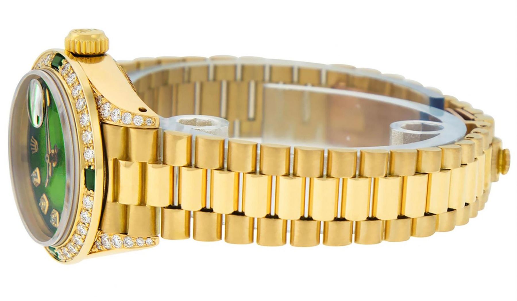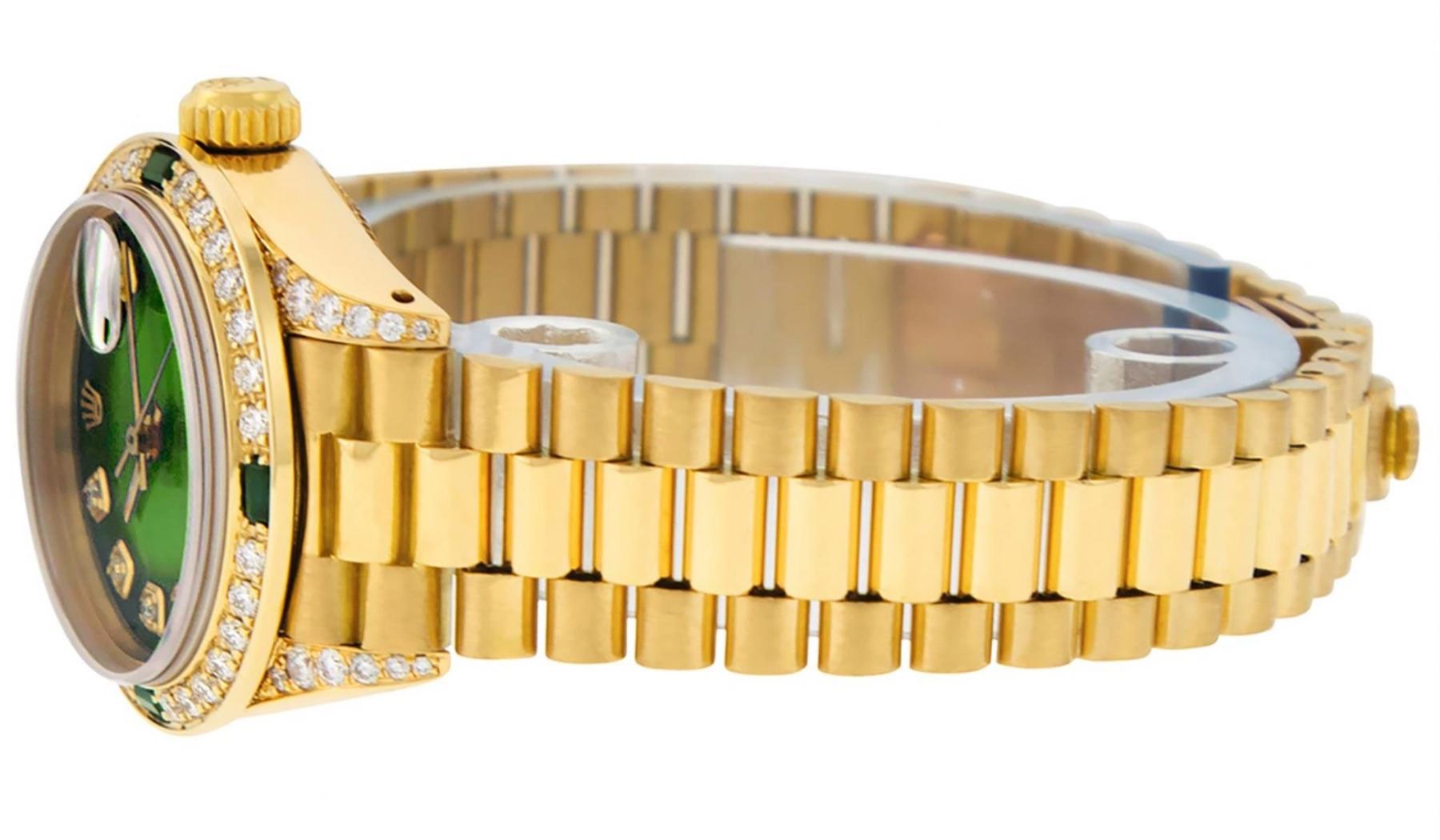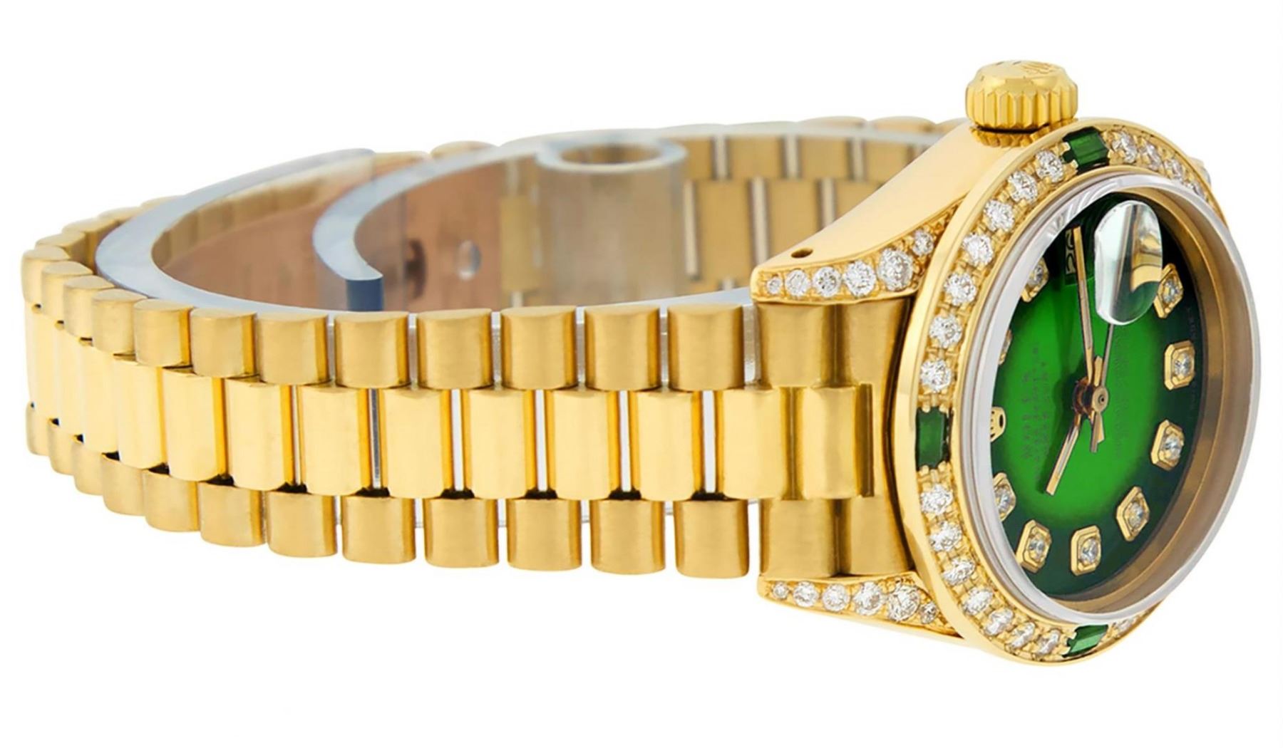 One Ladies Rolex President Polished, Serviced & Electronically Tested, 18K Yellow Gold Case With Diamond Lugs: 26mm G to H In Color, SI1, Yellow Gold Crown, Custom Diamond Lugs: 24 Diamonds On Lugs, Clarity: SI-VS, Color: G to H, Clarity SI-VS. Custom Bezel: 18K Yellow Gold Emerald Beadset Diamond Bezel, Diamond + Gem Count: 36 Diamonds + 4 Emeralds, Total Weight .70 Carat, Clarity: SI-VS, Color: G to H. Custom Crystal: New Scratch Resistant Synthetic Sapphire Cyclops Lens. Custom Hands: New Luminescent Hands. Movement: Automatic Winding Movement Caliber 2030. Custom Dial: Refinished Green Vignette With Diamond Hour Markers, Color: G To H. Clarity: SI-VS. Date Window: 3 O'Clock Position, Model: Datejust, Condition: G-6 Extra Fine. Bracelet: 18K Yellow Gold President Band, Bright & Satin Polish. 6.0 Inch Length, Standard President Clasp (Hidden Clasp), With Rolex Logo. This Watch Comes With A Rolex Box, Watch Winder And Appraisal. This Watch Has Been Serviced Time Tested And Is In Excellent Condition It Is Free Of All Scratches And Dents.