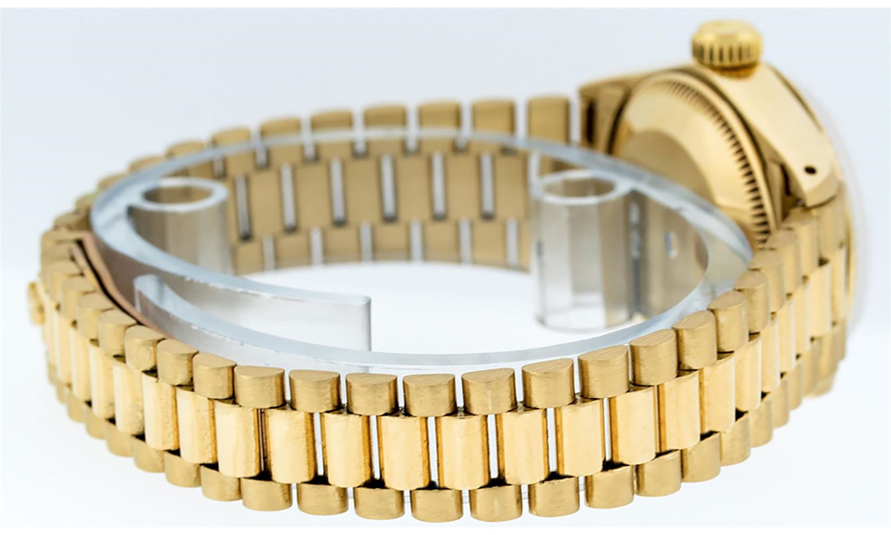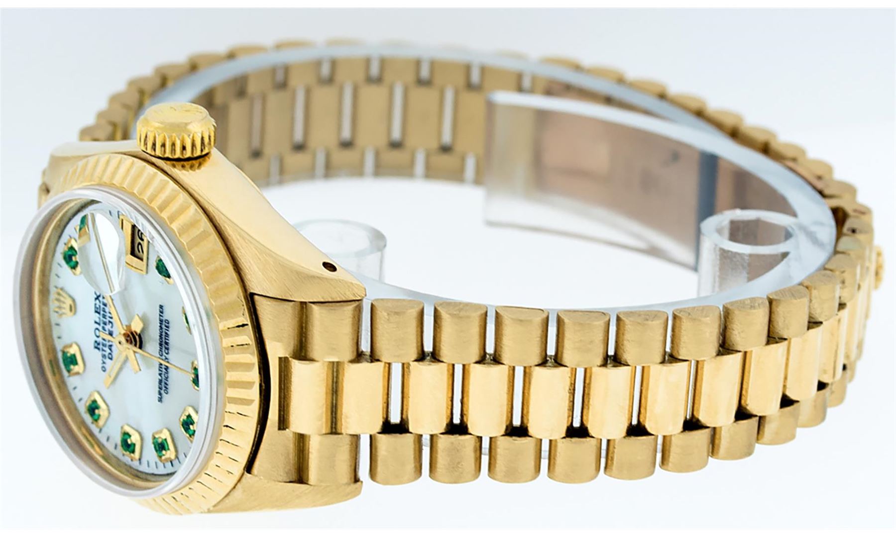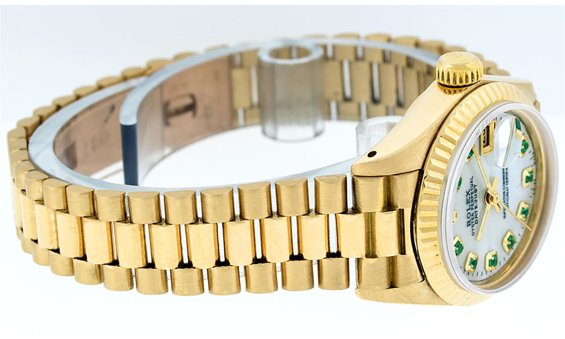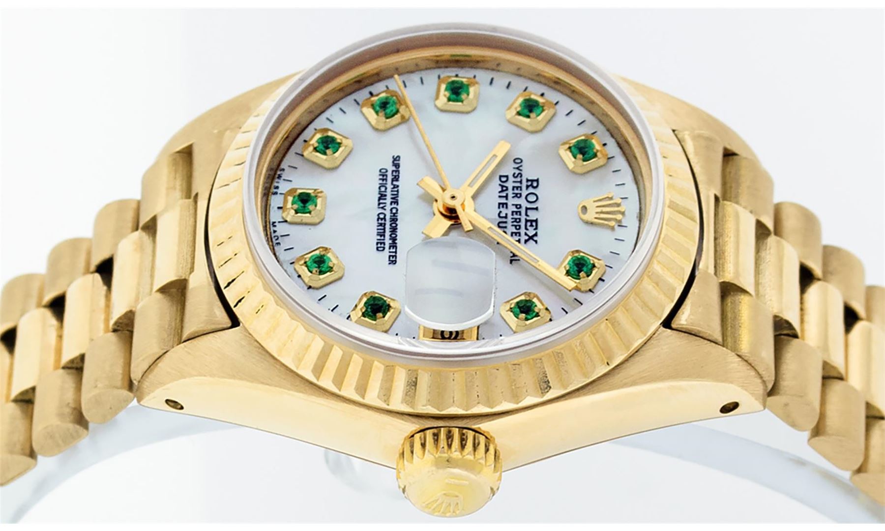 One Ladies Rolex 18K Yellow Gold President Polished, Serviced & Electronically Tested, 18K Yellow Gold Case: 26mm, 18K Yellow Gold Crown, Bezel: 18K Yellow Gold Fluted Bezel. Custom Crystal: Acrylic Cyclops Lens. Custom Hands: New Luminescent Hands. Movement: Automatic Winding Movement. Custom Dial: Refinished Mother Of Pearl With Emerald Hour Markets, Color: G to H, Stone Count: 10 Emeralds In Dial. Date Window: 3 O'Clock Position, Model: Datejust. Condition: G-6 Extra Fine The Watch Is In Very Good Condition Free Of All Scratches And Dents. Bracelet: 18K Yellow Gold President Band, Bright & Satin Polish. 6.0 Inch Length, Standard President Clasp (Hidden Clasp), With Rolex Logo.