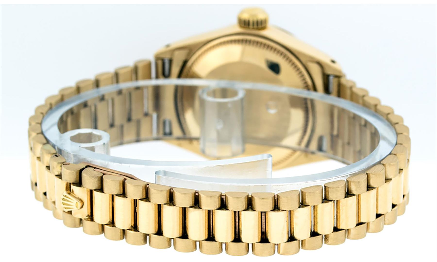 One Ladies Pre Owned Rolex 18K Yellow Gold President Polished, Serviced & Electronically Tested, Rolex 18K Yellow Gold Case: 26mm, Rolex 18K Yellow Gold Crown, Rolex Bezel: 18K Yellow Gold Fluted Bezel. Custom Crystal: Acrylic Cyclops Lens. Custom Hands: New Luminescent Hands. Rolex Movement: Automatic Winding Movement. Custom Dial: Refinished To Mother Of Pearl With Added Synthetic Emerald Hour Markets, Color: G to H, Stone Count: 10 Synthetic Emeralds In Dial. Date Window: 3 O'Clock Position, Model: Datejust. Condition: G-6 Extra Fine The Watch Is In Very Good Condition Free Of All Scratches And Dents. Rolex Bracelet: 18K Yellow Gold President Band, Bright & Satin Polish. 6.0 Inch Length, Standard President Clasp (Hidden Clasp), With Rolex Logo.