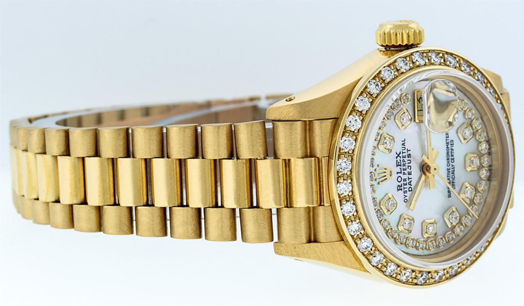 One Ladies Rolex 18K Yellow Gold President Polished, Serviced & Electronically Tested, 18K Yellow Gold Case: 26mm, 18K Yellow Gold Crown, Custom Bezel: New 18K Yellow Gold Bead Set Diamond Bezel, Diamond Count: 32 Diamonds Total Weight .70 Carat, Clarity: SI-VS, Color: G to H. Custom Crystal: New Scratch Resistant Synthetic Sapphire Cyclops Lens. Custom Hands: New Luminescent Hands. Movement: Automatic Winding Movement. Custom Dial: Refinished Mother Of Pearl With String Diamond Dial, Color: G to H, Diamond Count: 43 Diamonds In Dial, Clarity: SI-VS. Date Window: 3 O'Clock Position, Model: Datejust President. Condition: G-6 Extra Fine The Watch Is In Very Good Condition Free Of All Scratches And Dents. . Bracelet: 18K Yellow Gold President Band, Bright & Satin Polish. 6.0 Inch Length, Standard President Clasp (Hidden Clasp), With Rolex Logo. This Watch Comes With A Rolex Box & Appraisal. This Watch Has Been Serviced Time Tested And Is In Excellent Condition It Is Free Of All Scratches And Dents. This Watch Comes With A Rolex Box.