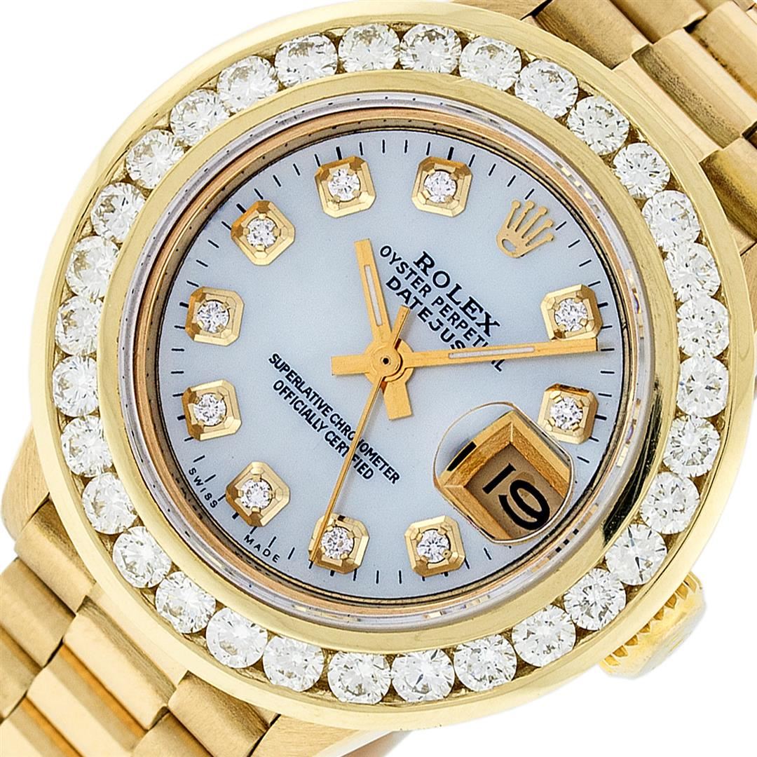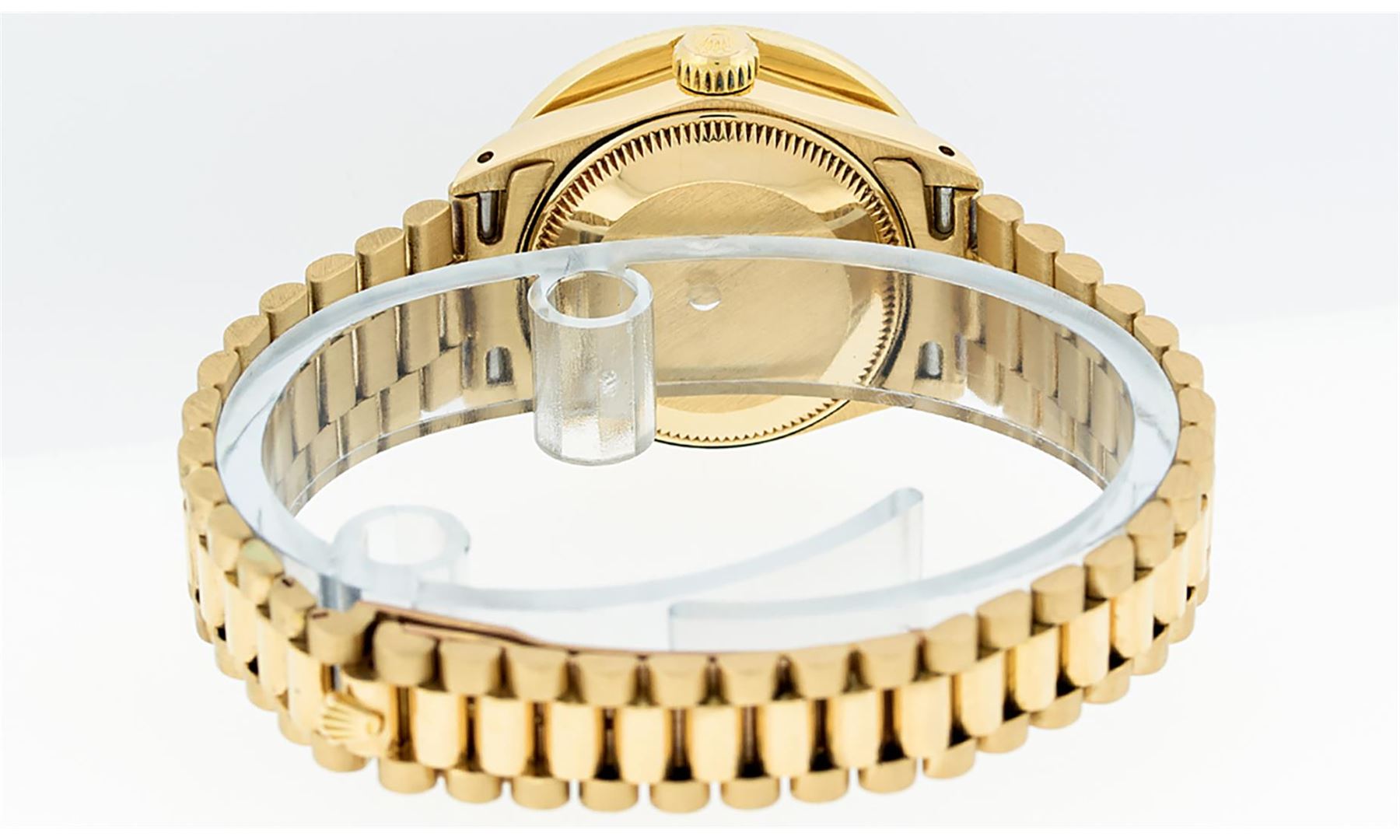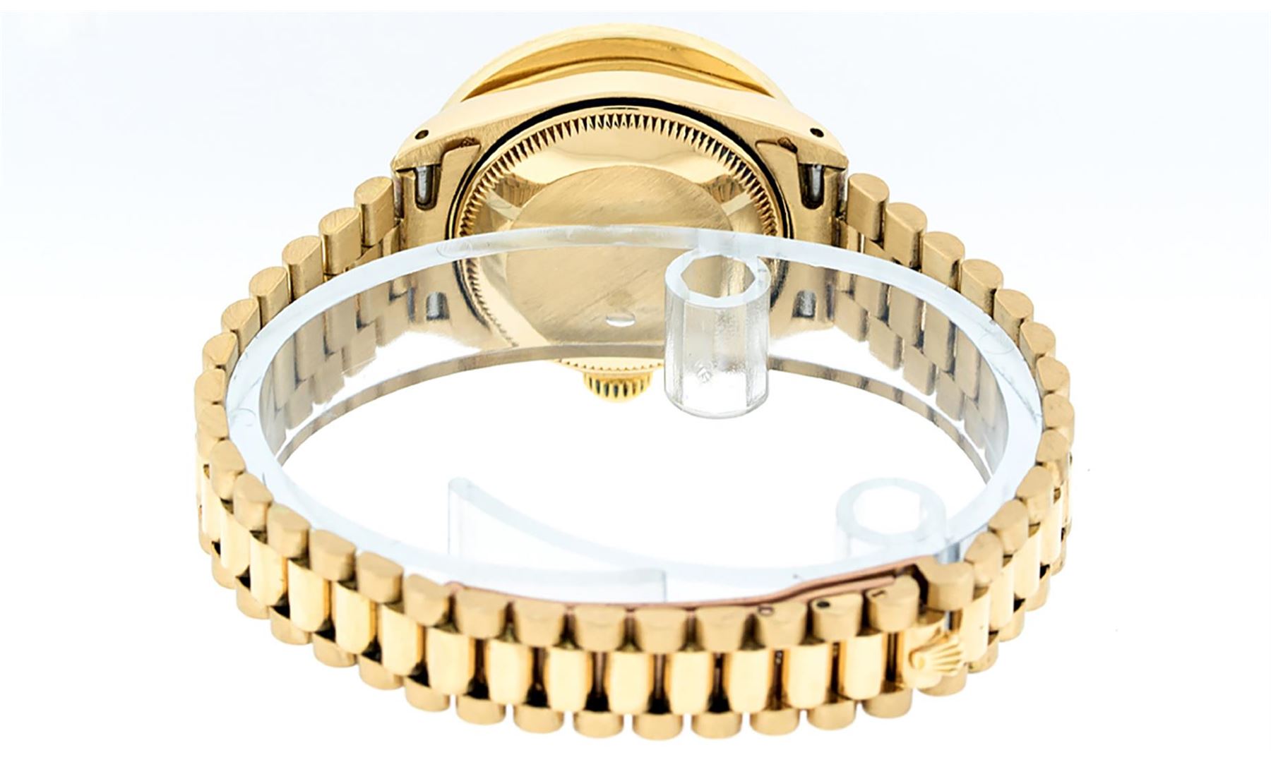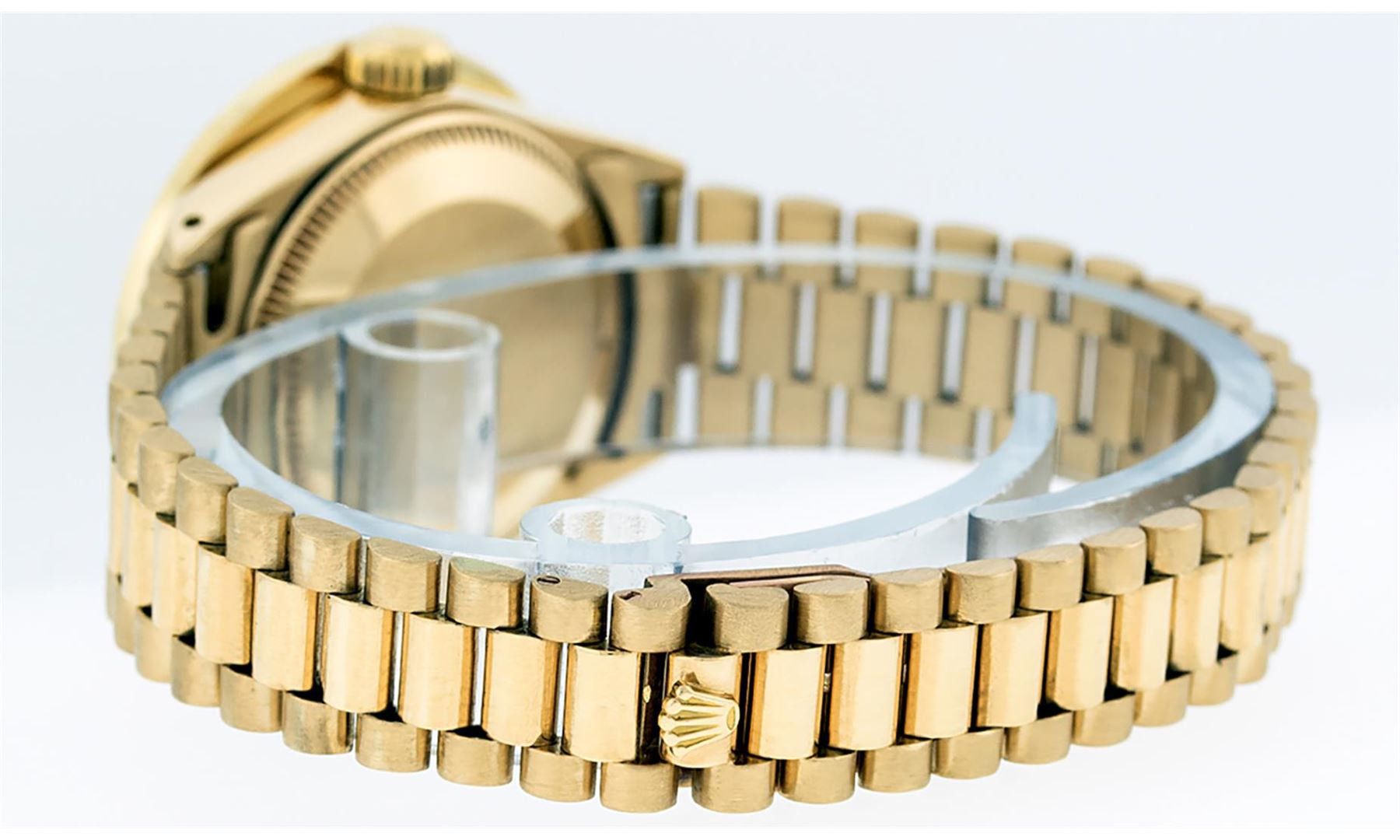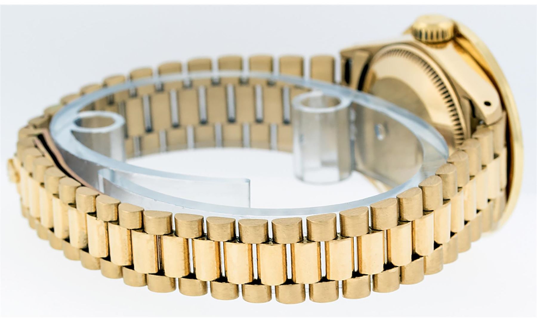 One Ladies 18K Yellow Gold Rolex Presidential Polished, Serviced & Electronically Tested, 18K Yellow Gold Case: 26mm, 18K Yellow Gold Crown, Custom Bezel: New 18K Yellow Gold 2CTW Channel Set Diamond Bezel, Diamond Count: 32 Diamonds On Bezel. Total Diamond Weight 2.00 Carat, Clarity: SI-VS, Color: G to H. Custom Crystal: New Scratch Resistant Synthetic Sapphire Cyclops Lens. Custom Hands: New Luminescent Hands. Movement: Automatic Winding Movement. Custom Dial: Refinished Mother Of Pearl With Dash Track. Date Window: 3 O'Clock Position, Model: Datejust President, Condition: G-6 Extra Fine. Bracelet: 18K Yellow Gold Presidential With Hidden Clasp, Bright & Satin Polish. 6.0 Inch Length, Standard President Clasp (Hidden Clasp), With Rolex Logo. Watch Has Been Serviced And Polished It Is Free Of All Scratches And Dents. This Watch Comes With A Rolex Box And Appraisal. This Watch Has Been Serviced Time Tested And Is In Excellent Condition It Is Free Of All Scratches And Dents.