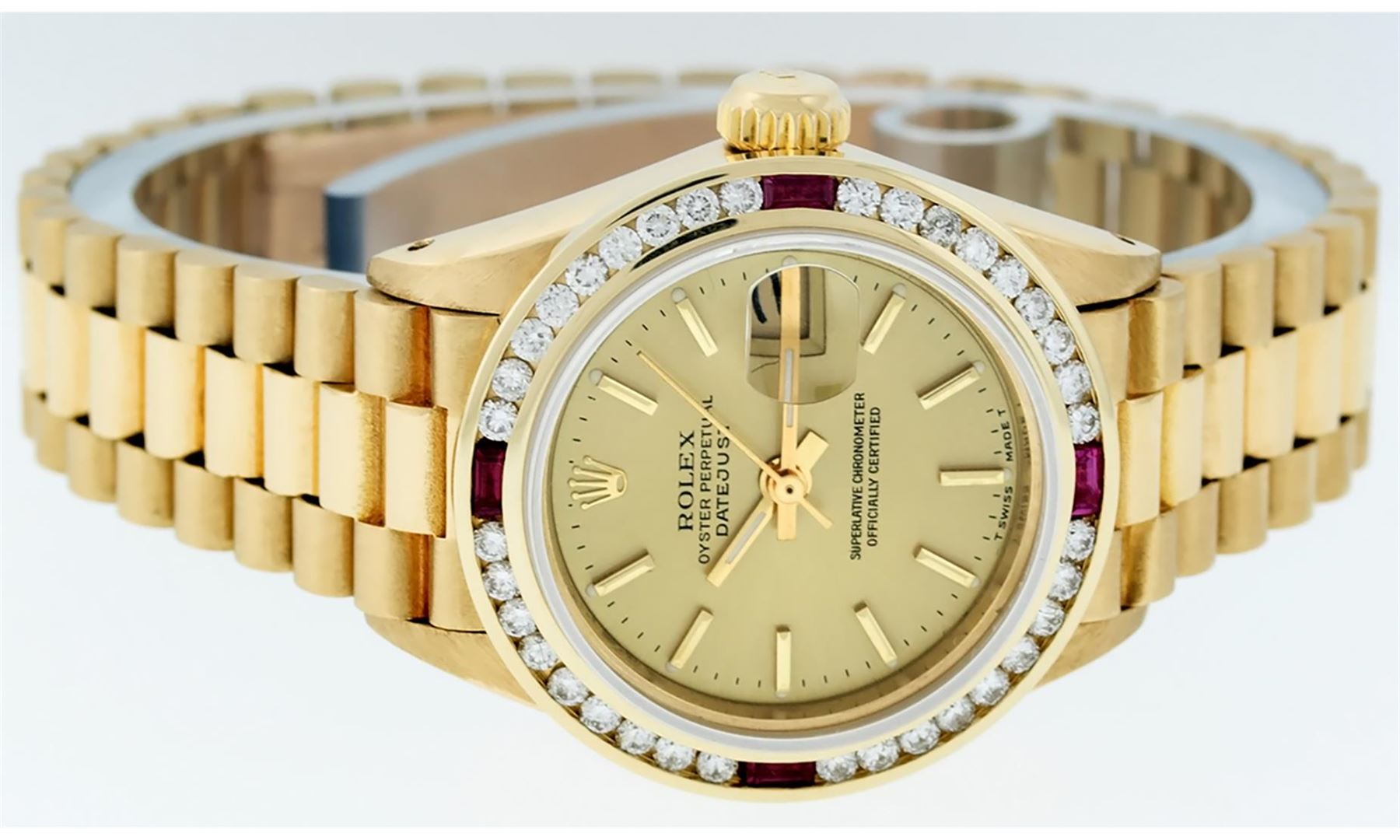 One Ladies Pre Owned 18K Yellow Gold Rolex President Polished, Serviced & Electronically Tested, Rolex Yellow Gold Case: 26mm, Rolex 18K Yellow Gold Crown, Custom Bezel: New 18K Yellow Gold Bezel With Custom Added Genuine Ruby and Diamonds, Diamond + Stone Count: 36 Diamonds + 4 Rubies. Total Weight 1.00 Carat, Clarity: SI-VS, Color: G to H. Custom Crystal: New Sapphire With Magnified Date Window. Custom Hands: New Luminescent Hands. Rolex Movement: Automatic Winding Movement. Rolex Dial: Champagne Index With Dash Track & Lumi Dots. Date Window: 3 O'Clock Position, Model: President, Condition: G-6 Extra Fine. Rolex Bracelet: 18K Yellow Gold President With Hidden Clasp, Bright & Satin Polish. 6.0 Inch Length, Standard President Clasp (Hidden Clasp), With Rolex Logo. Watch Has Been Serviced And Polished It Is Free Of All Scratches And Dents.