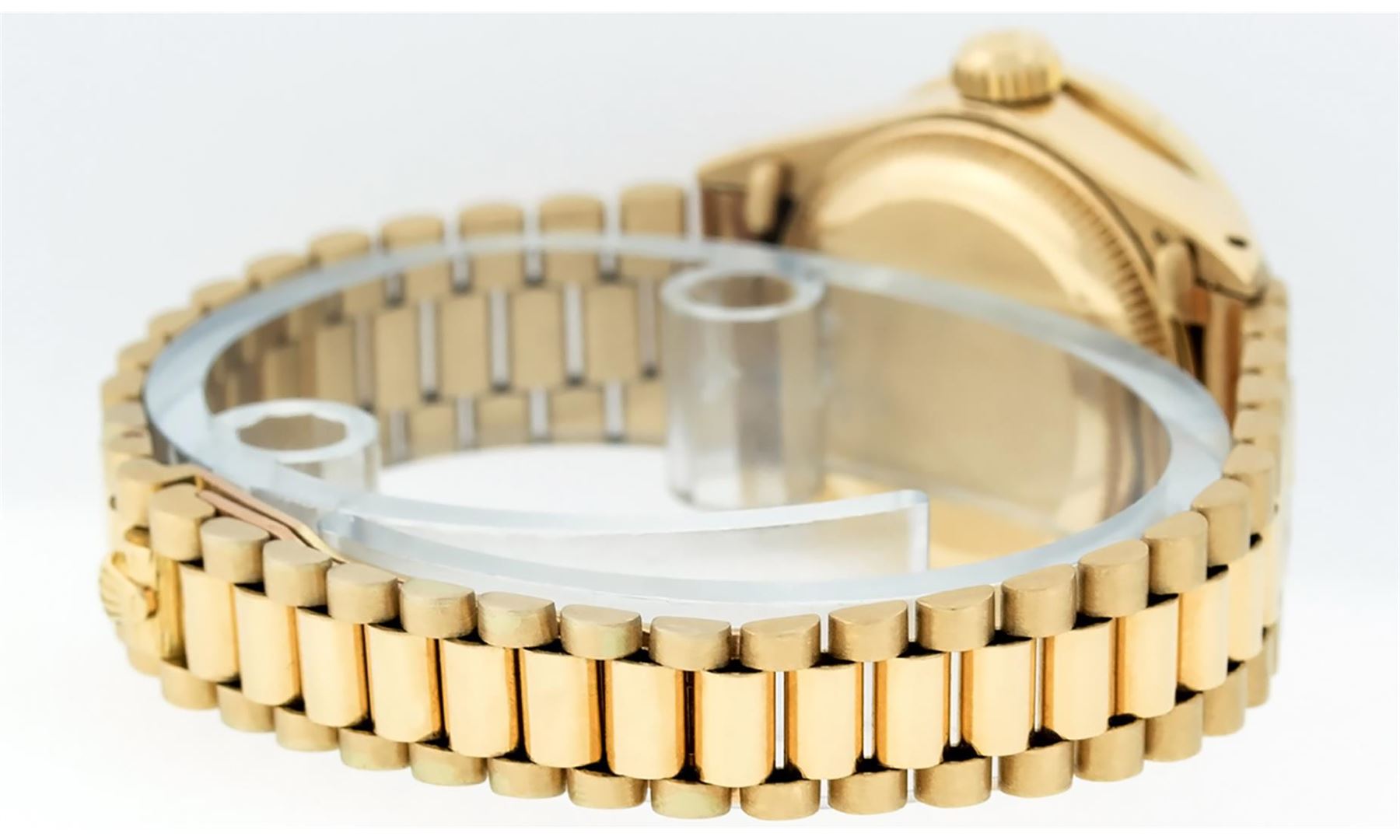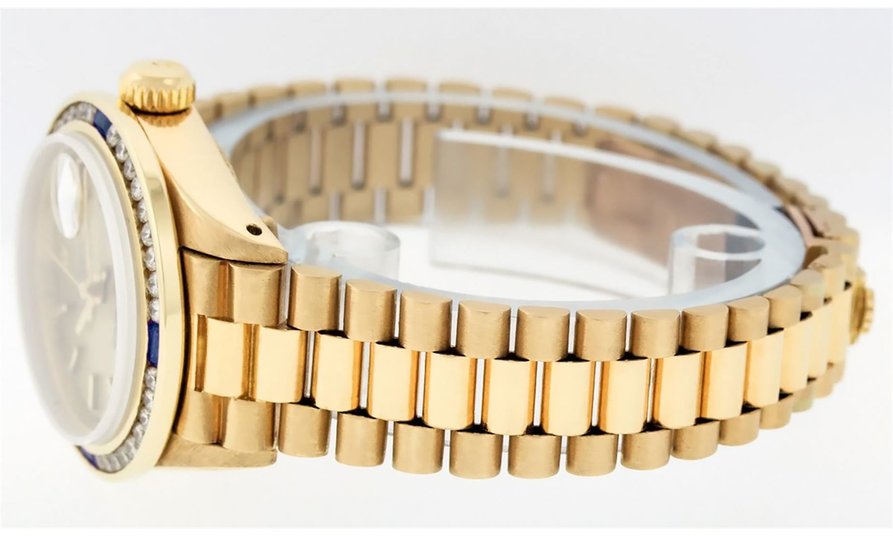 One Ladies 18K Yellow Gold Pre Owned Rolex Presidential Polished, Serviced & Electronically Tested, Rolex 18K Yellow Gold Case: 26mm, Rolex 18K Yellow Gold Crown, Custom Bezel: 18K Yellow Gold Sapphire Channel Set Diamond Bezel, Diamond + Stone Count: 36 Diamonds + 4 Sapphires. Total Weight 1.00 Carat, Clarity: SI-VS, Color: G to H. Custom Crystal: New Scratch Resistant Synthetic Sapphire Cyclops Lens. Custom Hands: New Luminescent Hands. Rolex Movement: Automatic Winding Movement. Rolex Dial: Champagne Index With Dash Track & Lumi Dots. Date Window: 3 O'Clock Position, Model: Datejust Presidential, Condition: G-6 Extra Fine. Rolex Bracelet: 18K Yellow Gold President With Hidden Clasp, Bright & Satin Polish. 6.0 Inch Length, Standard President Clasp (Hidden Clasp), With Rolex Logo. Watch Has Been Serviced And Polished It Is Free Of All Scratches And Dents. This Watch Has Been Serviced Time Tested And Is In Excellent Condition It Is Free Of All Scratches And Dents. This Watch Comes With An Appraisal.