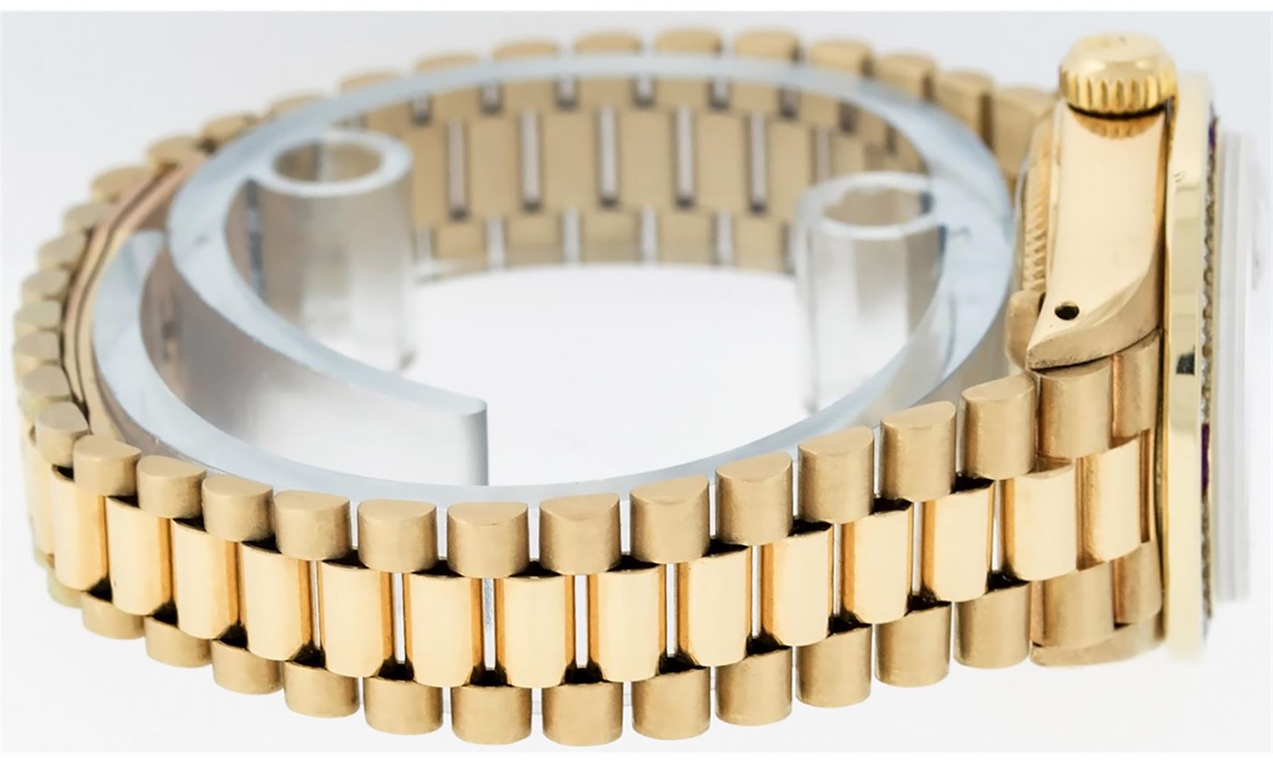 One Ladies 18K Yellow Gold Pre Owned Rolex Presidential Polished, Serviced & Electronically Tested, Rolex 18K Yellow Gold Case: 26mm, Rolex 18K Yellow Gold Crown, Custom Bezel: 18K Yellow Gold Sapphire Channel Set Diamond Bezel, Diamond + Stone Count: 36 Diamonds + 4 Sapphires. Total Weight 1.00 Carat, Clarity: SI-VS, Color: G to H. Custom Crystal: New Scratch Resistant Synthetic Sapphire Cyclops Lens. Custom Hands: New Luminescent Hands. Rolex Movement: Automatic Winding Movement. Rolex Dial: Champagne Index With Dash Track & Lumi Dots. Date Window: 3 O'Clock Position, Model: Datejust Presidential, Condition: G-6 Extra Fine. Rolex Bracelet: 18K Yellow Gold President With Hidden Clasp, Bright & Satin Polish. 6.0 Inch Length, Standard President Clasp (Hidden Clasp), With Rolex Logo. Watch Has Been Serviced And Polished It Is Free Of All Scratches And Dents. This Watch Has Been Serviced Time Tested And Is In Excellent Condition It Is Free Of All Scratches And Dents. This Watch Comes With An Appraisal.