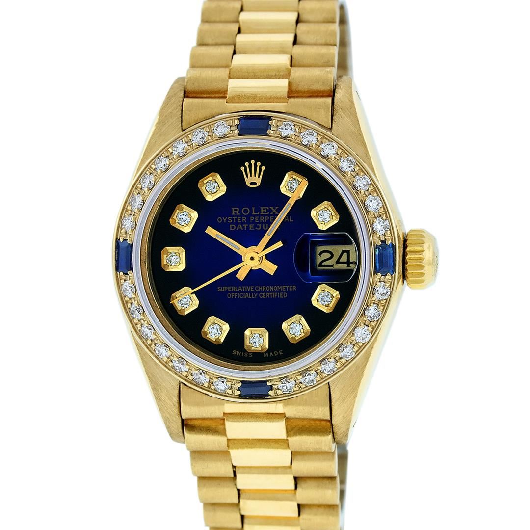 Rolex Ladies 18K Yellow Gold Rolex President Polished, Serviced & Electronically Tested, Yellow Gold Case: 26mm, 18K Yellow Gold Crown, Custom Bezel: 18K Yellow Gold Sapphire Beadset Diamond Bezel, Diamond + Stone Count: 28 Diamonds + 4 Sapphires. Total Weight .70 Carat, Clarity: SI-VS, Color: G to H. Custom Crystal: New Scratch Resistant Synthetic Sapphire Cyclops Lens. Custom Hands: New Luminescent Hands. Movement: Automatic Winding Movement. Custom Dial: Refinished Blue Vignette Diamond Dial, Stone Count: 10 Diamonds In Dial, Color: G To H, Clarity: SI-VS, Date Window: 3 O'Clock Position, Model: Datejust President, Condition: G-6 Extra Fine. Bracelet: 18K Yellow Gold President With Hidden Clasp, Bright & Satin Polish. 6.0 Inch Length, Standard President Clasp (Hidden Clasp), With Rolex Logo. Watch Has Been Serviced And Polished It Is Free Of All Scratches And Dents. This Watch Comes With A Watch Winder And Appraisal. This Watch Has Been Serviced Time Tested And Is In Excellent Condition It Is Free Of All Scratches And Dents.