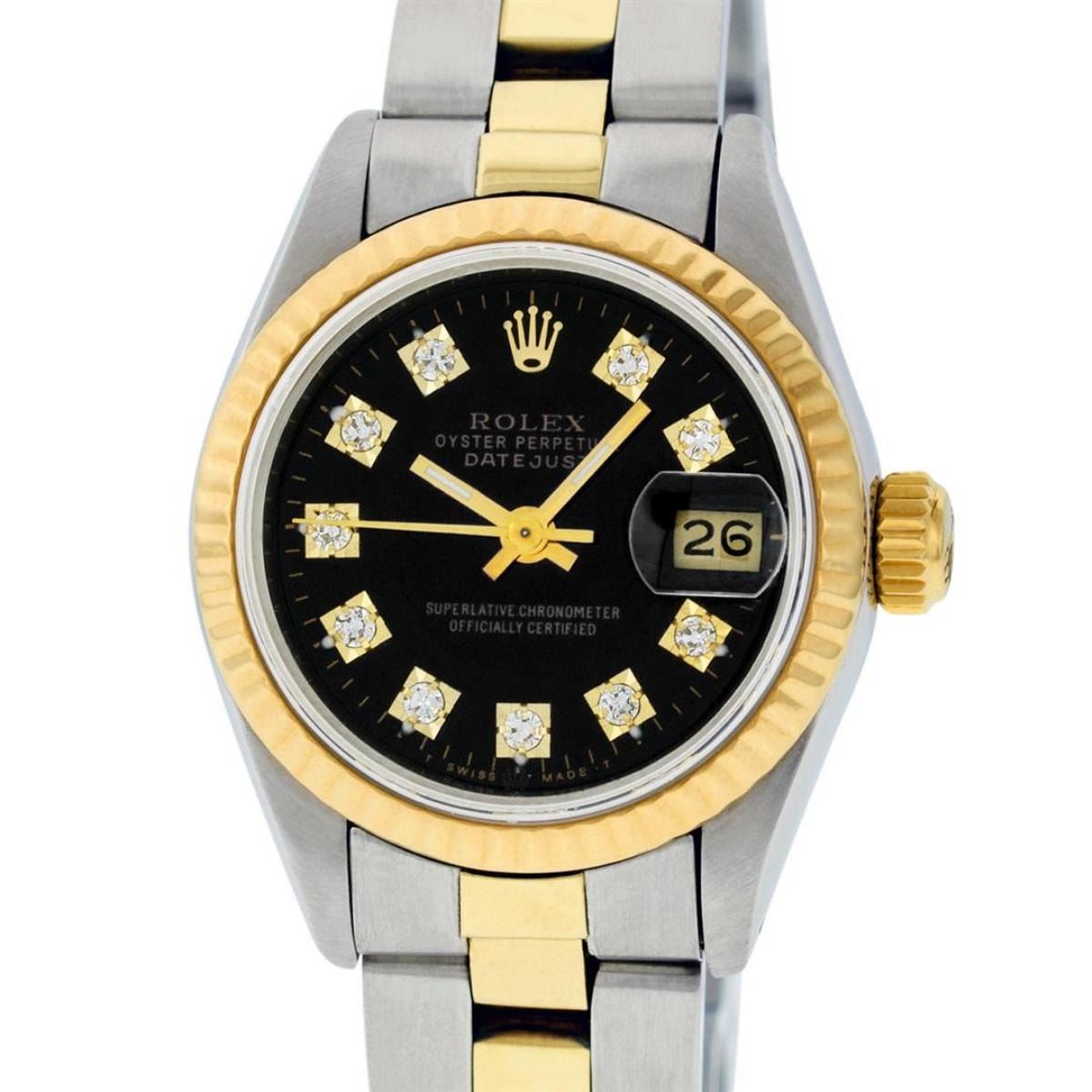 One Ladies 14K Two Tone Rolex Datejust Polished, Serviced & Electronically Tested, 14K Yellow Gold & Stainless Steel Case: 26mm, 14K Yellow Gold Crown, Bezel: 14K Yellow Gold Fluted Bezel. Custom Crystal: New Acrylic Cyclops Lens. Custom Hands: New Luminescent Hands. Movement: Automatic Winding Movement Caliber 2030. Custom Dial: Black With Diamond Hour Markers, Diamond Count: 10 Single Cut Diamonds, Color: G to H, Clarity: VS. Date Window: 3 O'Clock Position Date Display, Model: Datejust. Condition: G-6 Extra Fine. Bracelet: Two Tone 14K Yellow Gold & Stainless Steel Oyster Band. Bright Polish. 6.0 Inch Length, Adjustable. Standard Clasp, With Rolex Logo. This Watch Has Been Serviced Time Tested And Is In Excellent Condition It Is Free Of All Scratches And Dents.