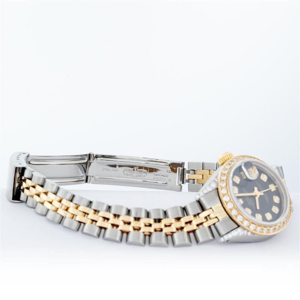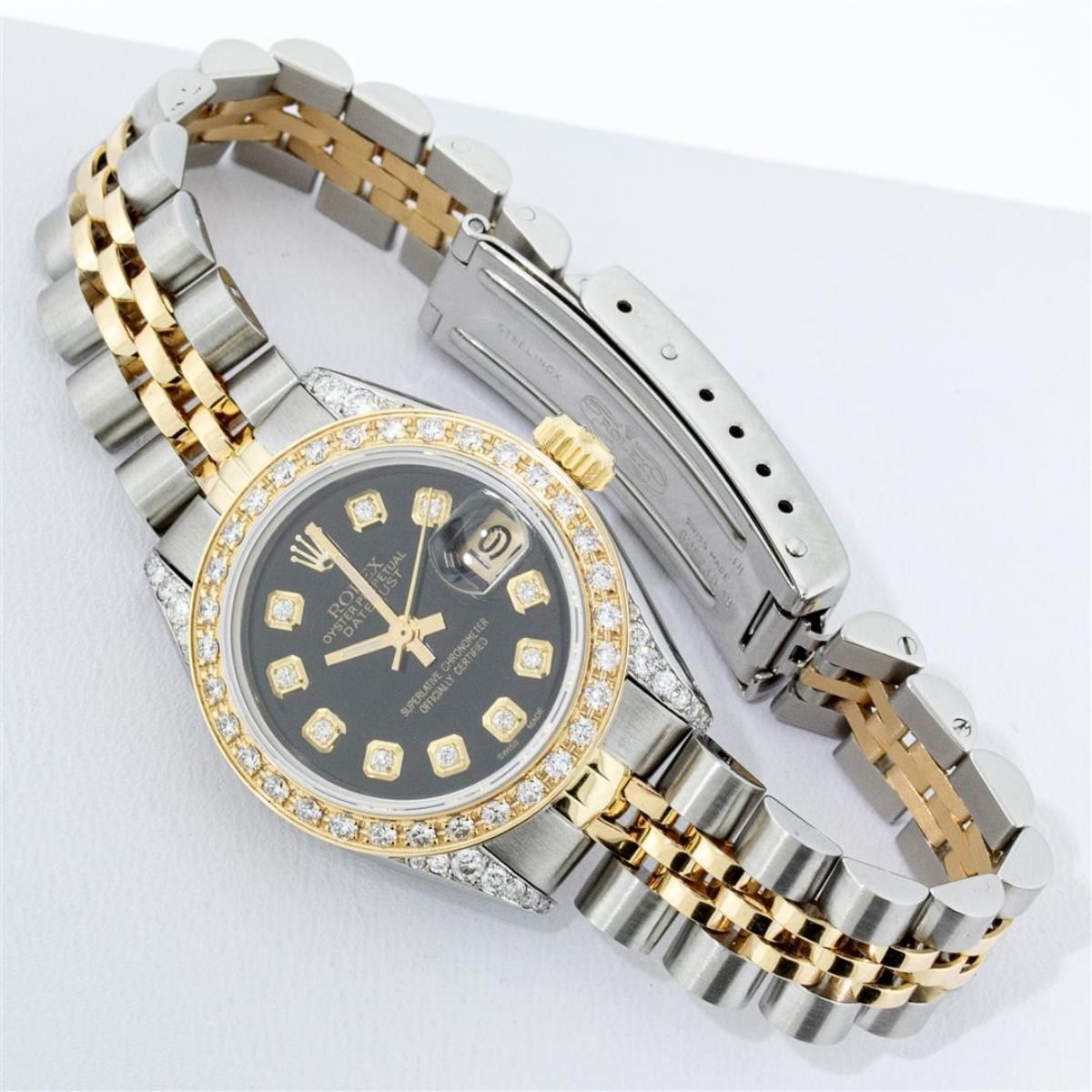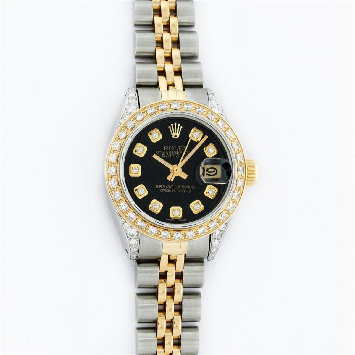 One Ladies 14K Two Tone Rolex Datejust Polished, Serviced & Electronically Tested, 14K Yellow Gold & Stainless Steel Case: 26mm, 14K Yellow Gold Crown, Diamond Lugs: 24 Diamonds On Lugs, Clarity: SI-VS, Color: G to H, Clarity SI-VS. Custom Bezel: New 18K Yellow Gold Beadset Diamond Bezel, Diamond Count: 32 Diamonds, Total Weight .70 Carat, Clarity: SI-VS, Color: G to H. Custom Crystal: New Synthetic Sapphire Cyclops Lens. Custom Hands: New Luminescent Hands. Movement: Automatic Winding Movement Caliber 2030. Custom Dial: Black With Diamond Hour Markers, Diamond Count: 10 Diamonds, Clarity: SI-VS, Color: G to H. Date Window: 3 O'Clock Position Date Display, Model: Datejust. Condition: G-6 Extra Fine. Bracelet: Two Tone 14K Yellow Gold & Stainless Steel Jubilee. Bright Polish. 6.0 Inch Length, Adjustable. Standard Clasp, With Rolex Logo. This Watch Has Been Serviced Time Tested And Is In Excellent Condition It Is Free Of All Scratches And Dents.