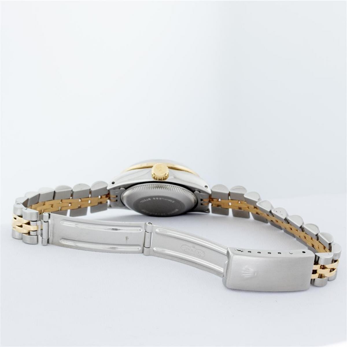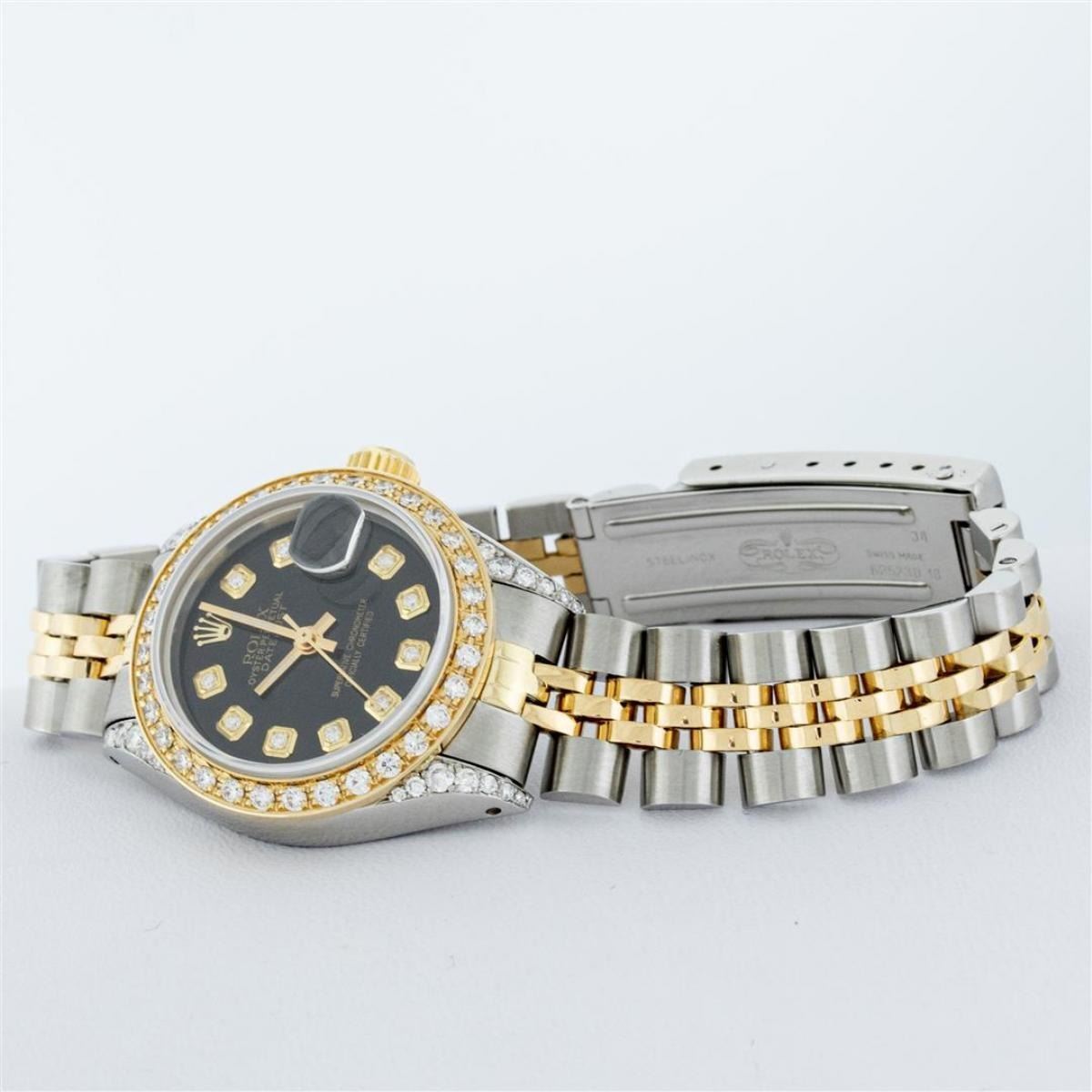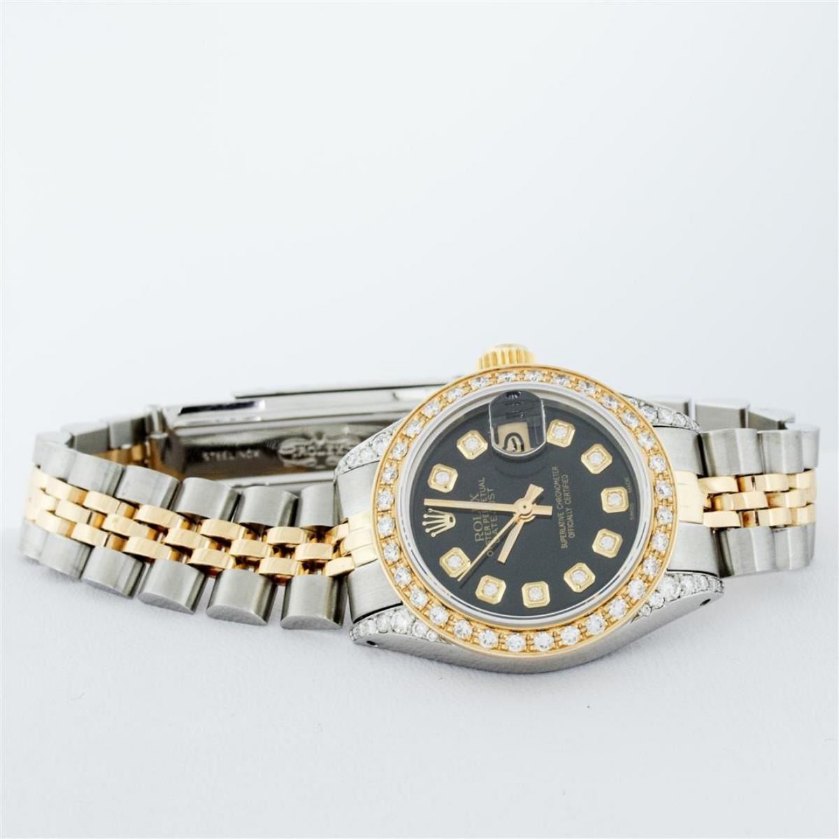 One Ladies 14K Two Tone Rolex Datejust Polished, Serviced & Electronically Tested, 14K Yellow Gold & Stainless Steel Case: 26mm, 14K Yellow Gold Crown, Diamond Lugs: 24 Diamonds On Lugs, Clarity: SI-VS, Color: G to H, Clarity SI-VS. Custom Bezel: New 18K Yellow Gold Beadset Diamond Bezel, Diamond Count: 32 Diamonds, Total Weight .70 Carat, Clarity: SI-VS, Color: G to H. Custom Crystal: New Synthetic Sapphire Cyclops Lens. Custom Hands: New Luminescent Hands. Movement: Automatic Winding Movement Caliber 2030. Custom Dial: Black With Diamond Hour Markers, Diamond Count: 10 Diamonds, Clarity: SI-VS, Color: G to H. Date Window: 3 O'Clock Position Date Display, Model: Datejust. Condition: G-6 Extra Fine. Bracelet: Two Tone 14K Yellow Gold & Stainless Steel Jubilee. Bright Polish. 6.0 Inch Length, Adjustable. Standard Clasp, With Rolex Logo. This Watch Has Been Serviced Time Tested And Is In Excellent Condition It Is Free Of All Scratches And Dents.