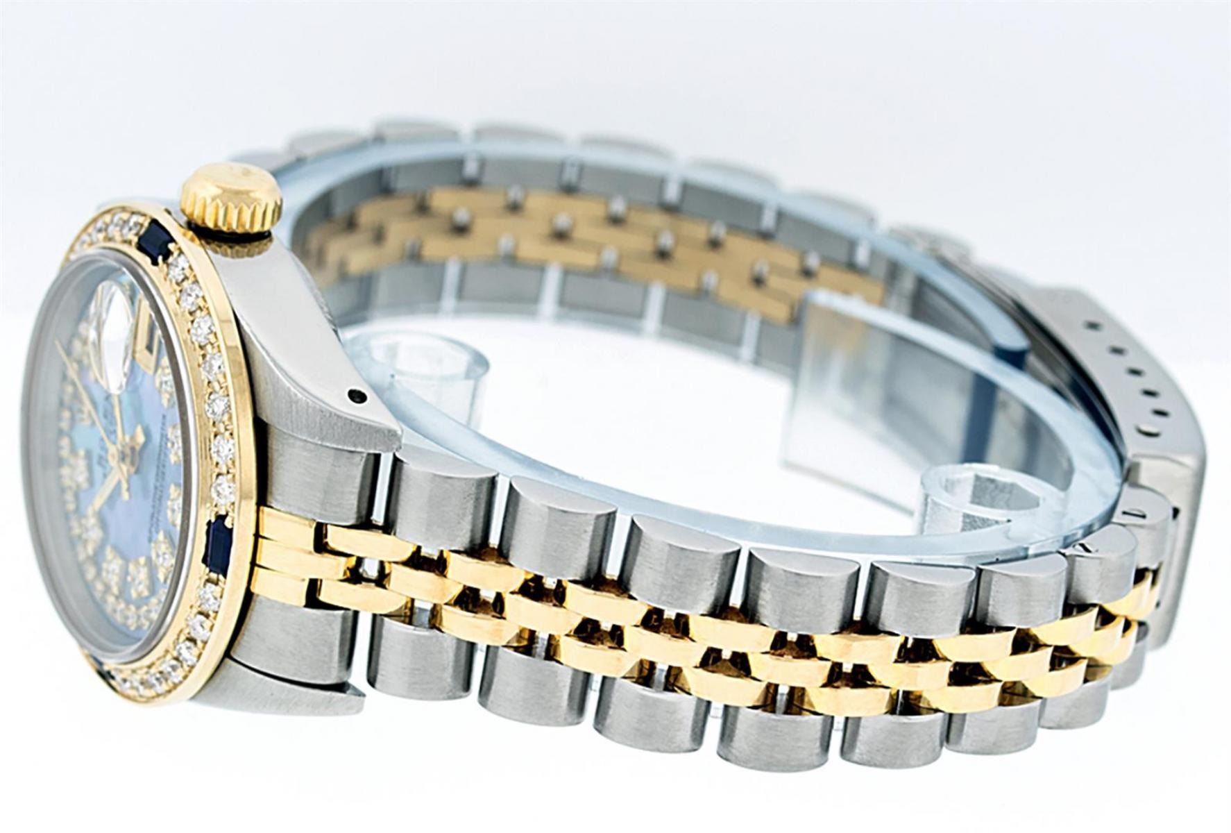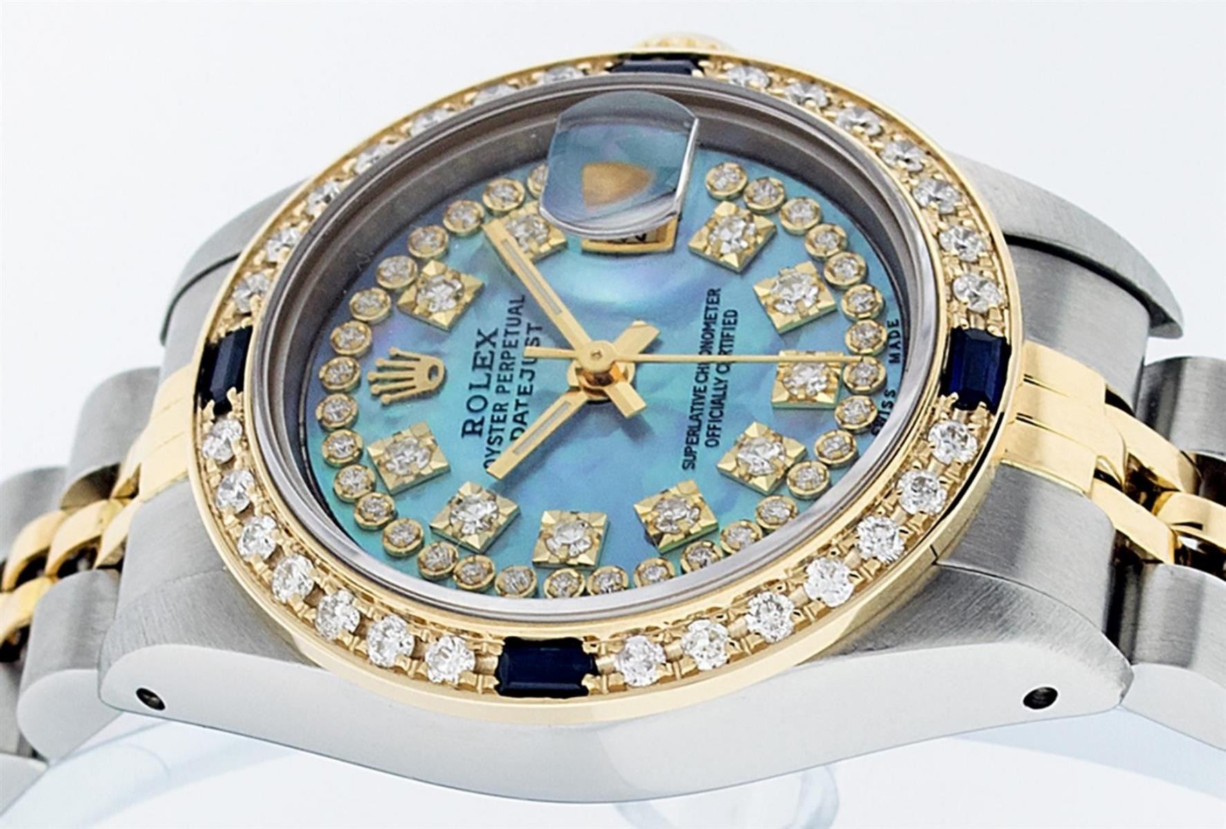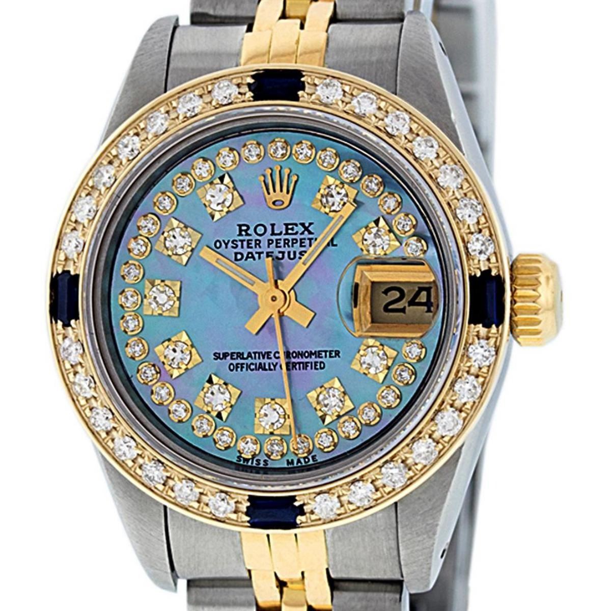 One Ladies 14K Two Tone Rolex Datejust Polished, Serviced & Electronically Tested, 14K Yellow Gold & Stainless Steel Case: 26mm, 14K Yellow Gold Crown, Custom Bezel: New 18K New Yellow Gold Beadset + Sapphire Diamond Bezel, Stone Count: 28 Diamonds + 4 Sapphires In Bezel, Total Weight .70 Carat, Clarity: SI-VS, Color: G to H. Custom Crystal: New Scratch Resistant Synthetic Sapphire Cyclops Lens. Custom Hands: New Luminescent Hands. Movement: Automatic Winding Movement Caliber 2030. Custom Dial: Blue Mother Of Pearl With String Single Cut Diamond Hour Markers, Diamond Count: 43 Diamonds In Dial, Clarity: SI-VS, Color: VS2. Date Window: 3 O'Clock Position Date Display, Model: Datejust. Condition: G-6 Extra Fine. Bracelet: Two Tone 14K Yellow Gold & Stainless Steel Jubilee Band. Bright Polish. 6.0 Inch Length, Adjustable. Standard Clasp, With Rolex Logo. This Watch Has Been Serviced Time Tested And Is In Excellent Condition It Is Free Of All Scratches And Dents.