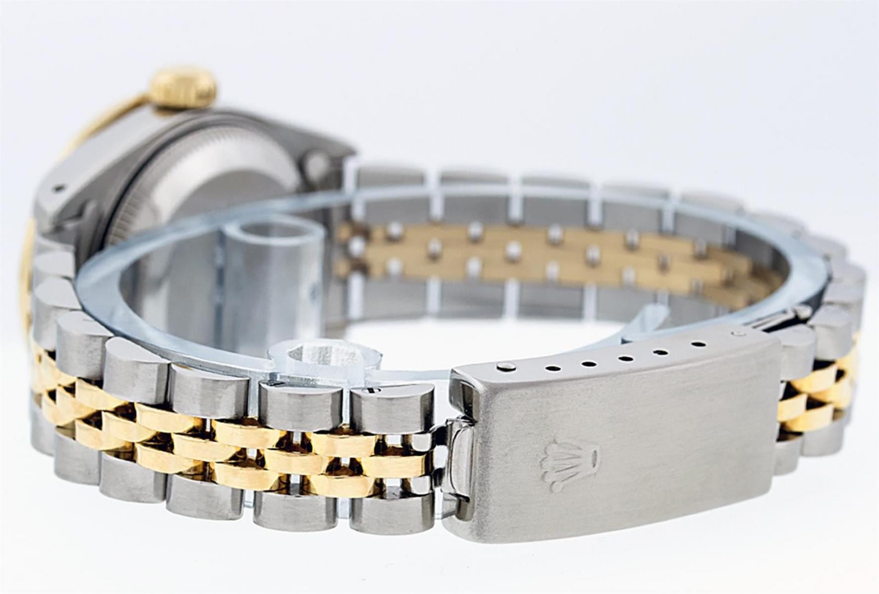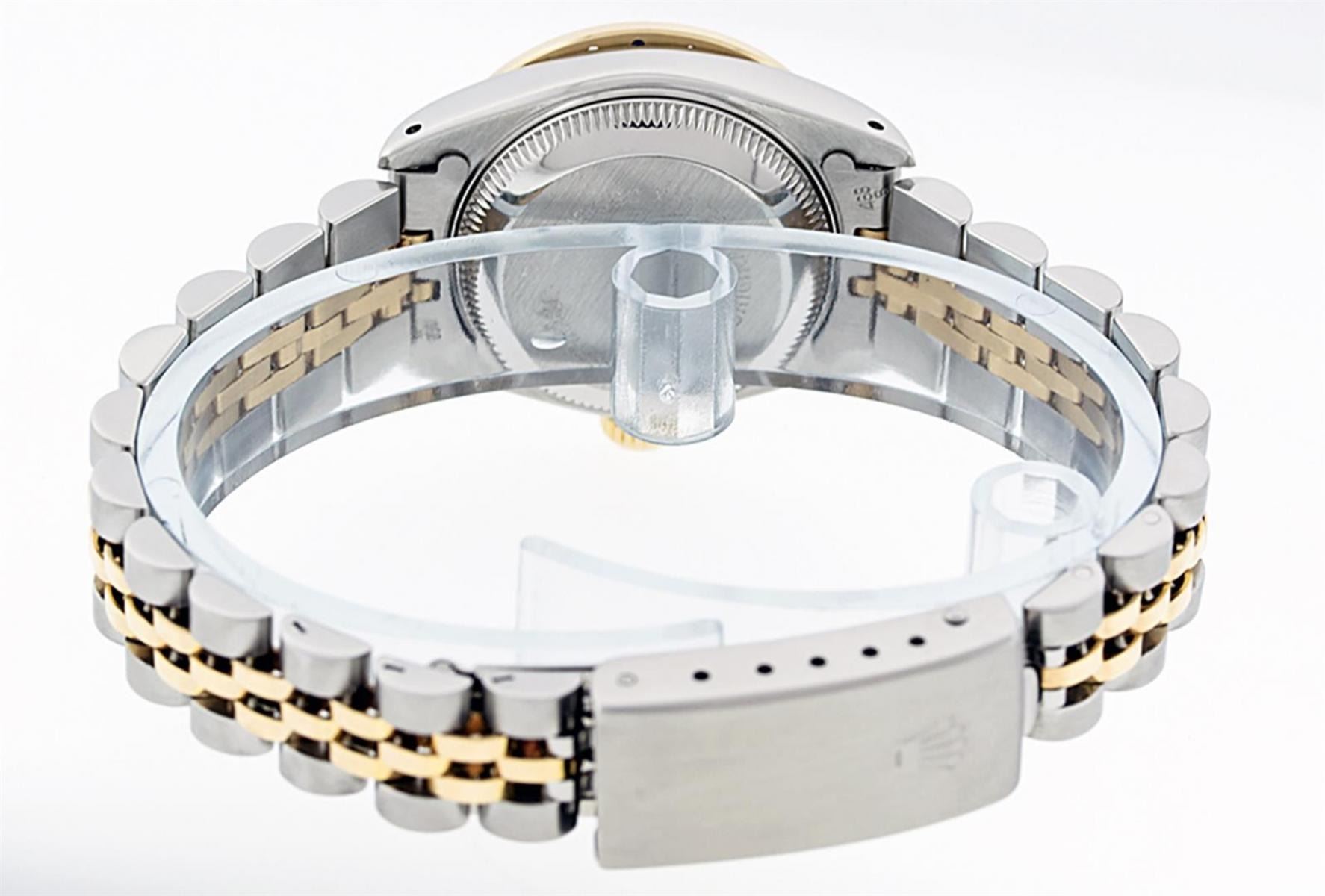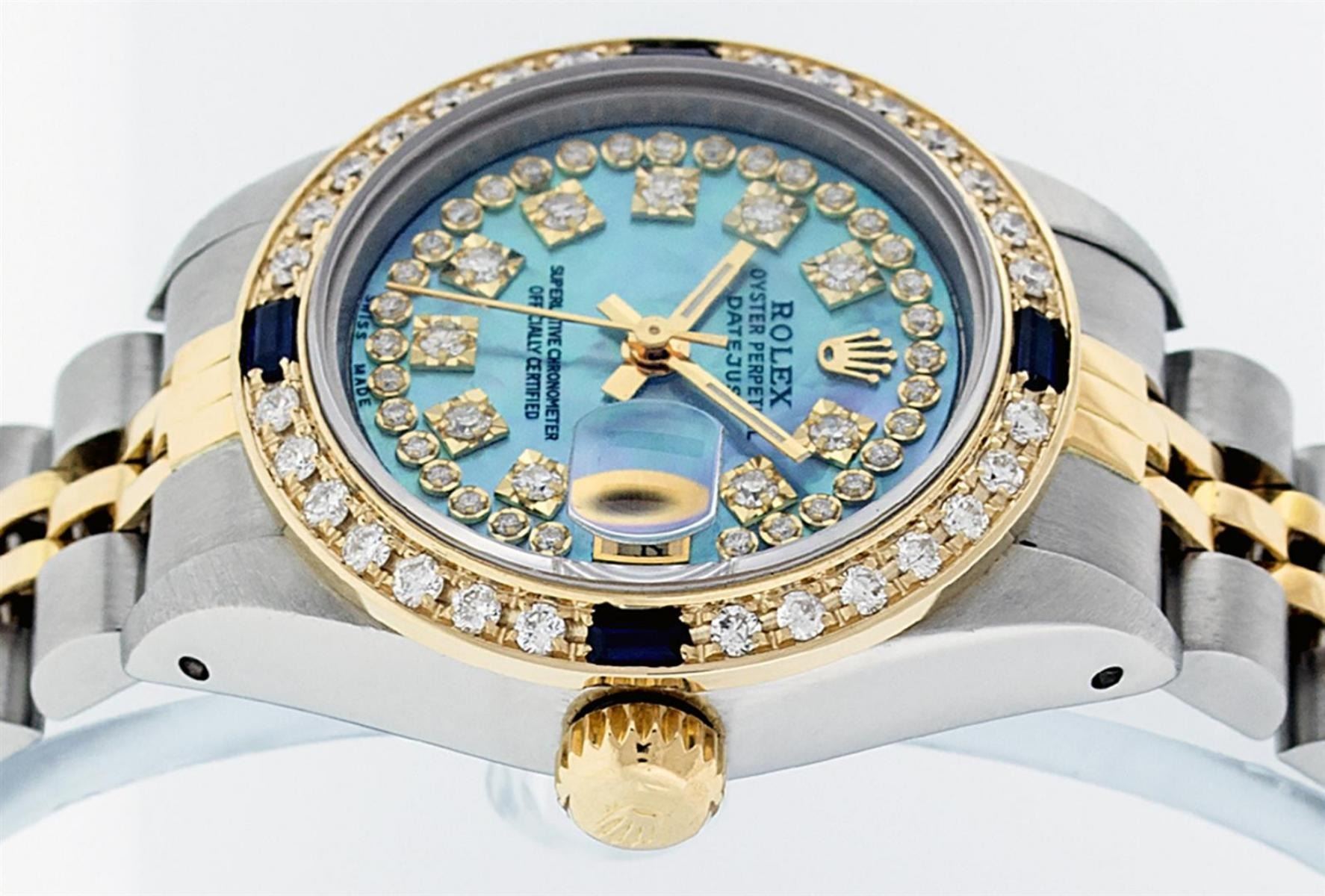 One Ladies 14K Two Tone Rolex Datejust Polished, Serviced & Electronically Tested, 14K Yellow Gold & Stainless Steel Case: 26mm, 14K Yellow Gold Crown, Custom Bezel: New 18K New Yellow Gold Beadset + Sapphire Diamond Bezel, Stone Count: 28 Diamonds + 4 Sapphires In Bezel, Total Weight .70 Carat, Clarity: SI-VS, Color: G to H. Custom Crystal: New Scratch Resistant Synthetic Sapphire Cyclops Lens. Custom Hands: New Luminescent Hands. Movement: Automatic Winding Movement Caliber 2030. Custom Dial: Blue Mother Of Pearl With String Single Cut Diamond Hour Markers, Diamond Count: 43 Diamonds In Dial, Clarity: SI-VS, Color: VS2. Date Window: 3 O'Clock Position Date Display, Model: Datejust. Condition: G-6 Extra Fine. Bracelet: Two Tone 14K Yellow Gold & Stainless Steel Jubilee Band. Bright Polish. 6.0 Inch Length, Adjustable. Standard Clasp, With Rolex Logo. This Watch Has Been Serviced Time Tested And Is In Excellent Condition It Is Free Of All Scratches And Dents.
