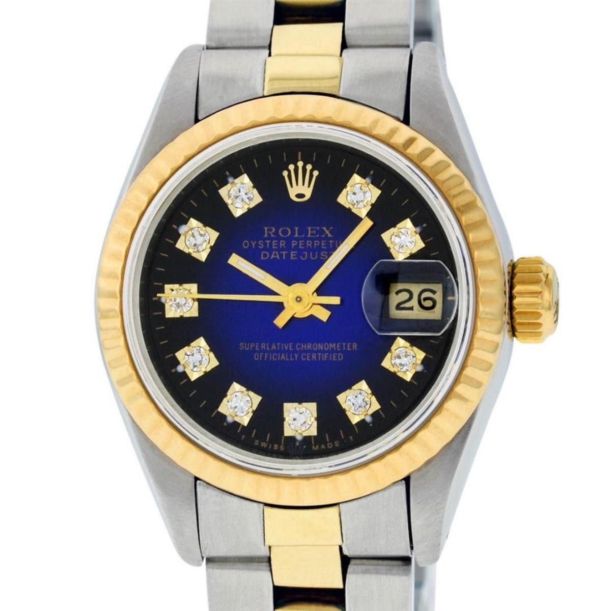 One Ladies 14K Two Tone Rolex Datejust Polished, Serviced & Electronically Tested, 14K Yellow Gold & Stainless Steel Case: 26mm, 14K Yellow Gold Crown, Bezel: 14K Yellow Gold Fluted Bezel. Custom Crystal: New Acrylic Cyclops Lens. Custom Hands: New Luminescent Hands. Movement: Automatic Winding Movement Caliber 2030. Custom Dial: Blue Vignette With Diamond Hour Markers, Diamond Count: 10 Single Cut Diamonds, Color: G to H, Clarity: VS. Date Window: 3 O'Clock Position Date Display, Model: Datejust. Condition: G-6 Extra Fine. Bracelet: Two Tone 14K Yellow Gold & Stainless Steel Jubilee. Bright Polish. 6.0 Inch Length, Adjustable. Standard Clasp, With Rolex Logo. This Watch Has Been Serviced Time Tested And Is In Excellent Condition It Is Free Of All Scratches And Dents.