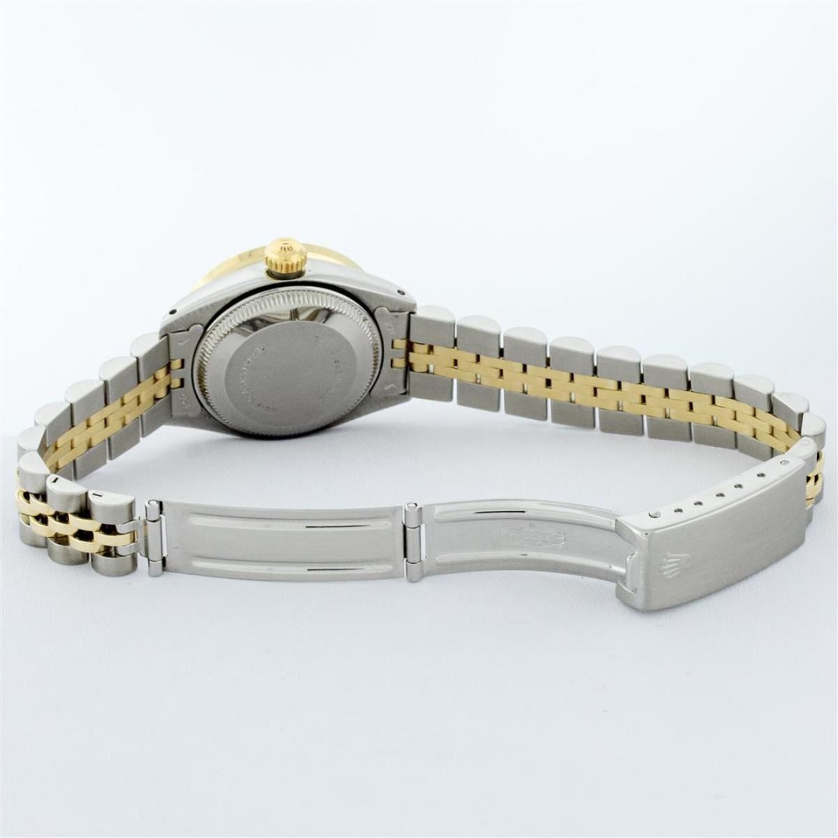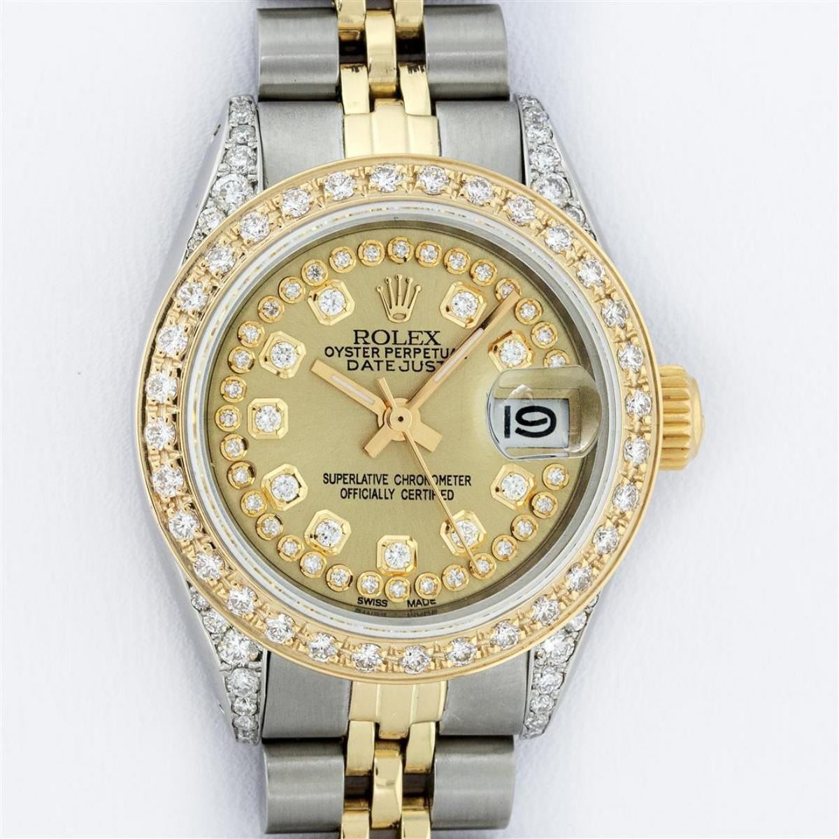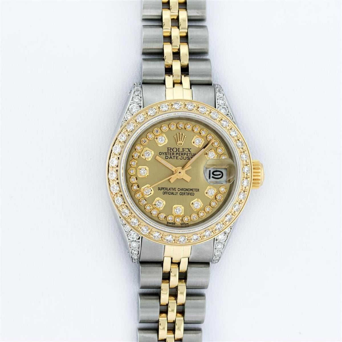 One Ladies 14K Two Tone Rolex Datejust Polished, Serviced & Electronically Tested, 14K Yellow Gold & Stainless Steel Case: 26mm, 14K Yellow Gold Crown, Diamond Lugs: 24 Diamonds On Lugs, Clarity: SI-VS, Color: G to H, Clarity SI-VS. Custom Bezel: New 18K Yellow Gold Beadset Diamond Bezel, Diamond Count: 32 Diamonds, Total Weight .70 Carat, Clarity: SI-VS, Color: G to H. Custom Crystal: New Synthetic Sapphire Cyclops Lens. Custom Hands: New Luminescent Hands. Movement: Automatic Winding Movement Caliber 2030. Custom Dial: Champagne With Diamond Hour Markers, Diamond Count: 43 Diamonds In Dial, Clarity: SI-VS, Color: G to H. Date Window: 3 O'Clock Position Date Display, Model: Datejust. Condition: G-6 Extra Fine. Bracelet: Two Tone 14K Yellow Gold & Stainless Steel Jubilee. Bright Polish. 6.0 Inch Length, Adjustable. Standard Clasp, With Rolex Logo. This Watch Has Been Serviced Time Tested And Is In Excellent Condition It Is Free Of All Scratches And Dents.