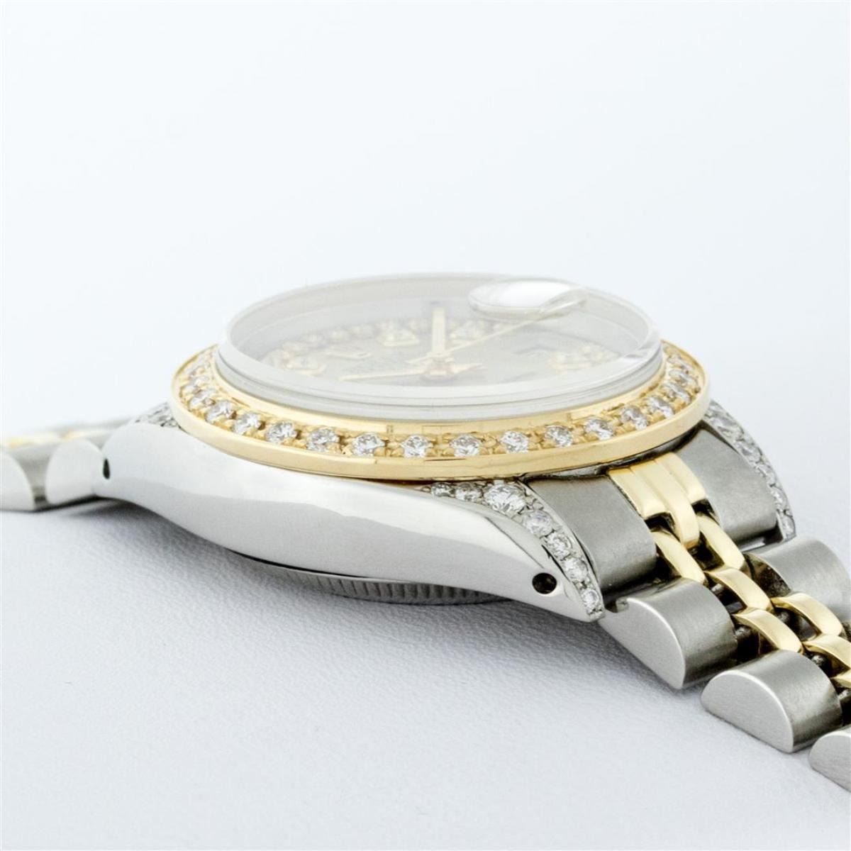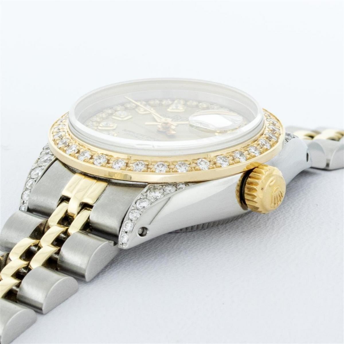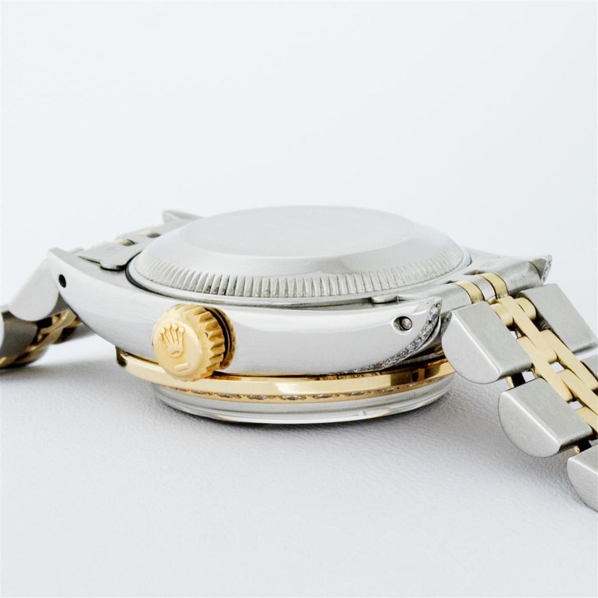 One Ladies 14K Two Tone Rolex Datejust Polished, Serviced & Electronically Tested, 14K Yellow Gold & Stainless Steel Case: 26mm, 14K Yellow Gold Crown, Diamond Lugs: 24 Diamonds On Lugs, Clarity: SI-VS, Color: G to H, Clarity SI-VS. Custom Bezel: New 18K Yellow Gold Beadset Diamond Bezel, Diamond Count: 32 Diamonds, Total Weight .70 Carat, Clarity: SI-VS, Color: G to H. Custom Crystal: New Synthetic Sapphire Cyclops Lens. Custom Hands: New Luminescent Hands. Movement: Automatic Winding Movement Caliber 2030. Custom Dial: Champagne With Diamond Hour Markers, Diamond Count: 43 Diamonds In Dial, Clarity: SI-VS, Color: G to H. Date Window: 3 O'Clock Position Date Display, Model: Datejust. Condition: G-6 Extra Fine. Bracelet: Two Tone 14K Yellow Gold & Stainless Steel Jubilee. Bright Polish. 6.0 Inch Length, Adjustable. Standard Clasp, With Rolex Logo. This Watch Has Been Serviced Time Tested And Is In Excellent Condition It Is Free Of All Scratches And Dents.
