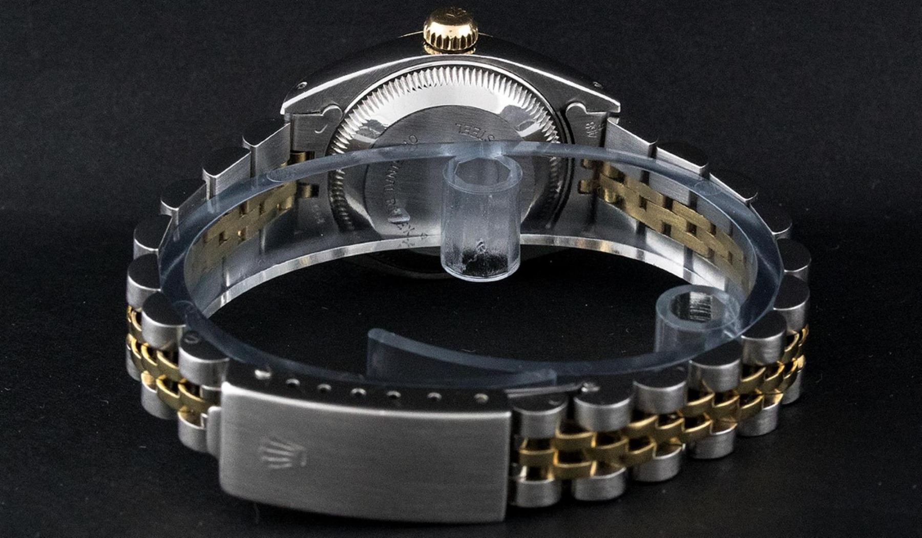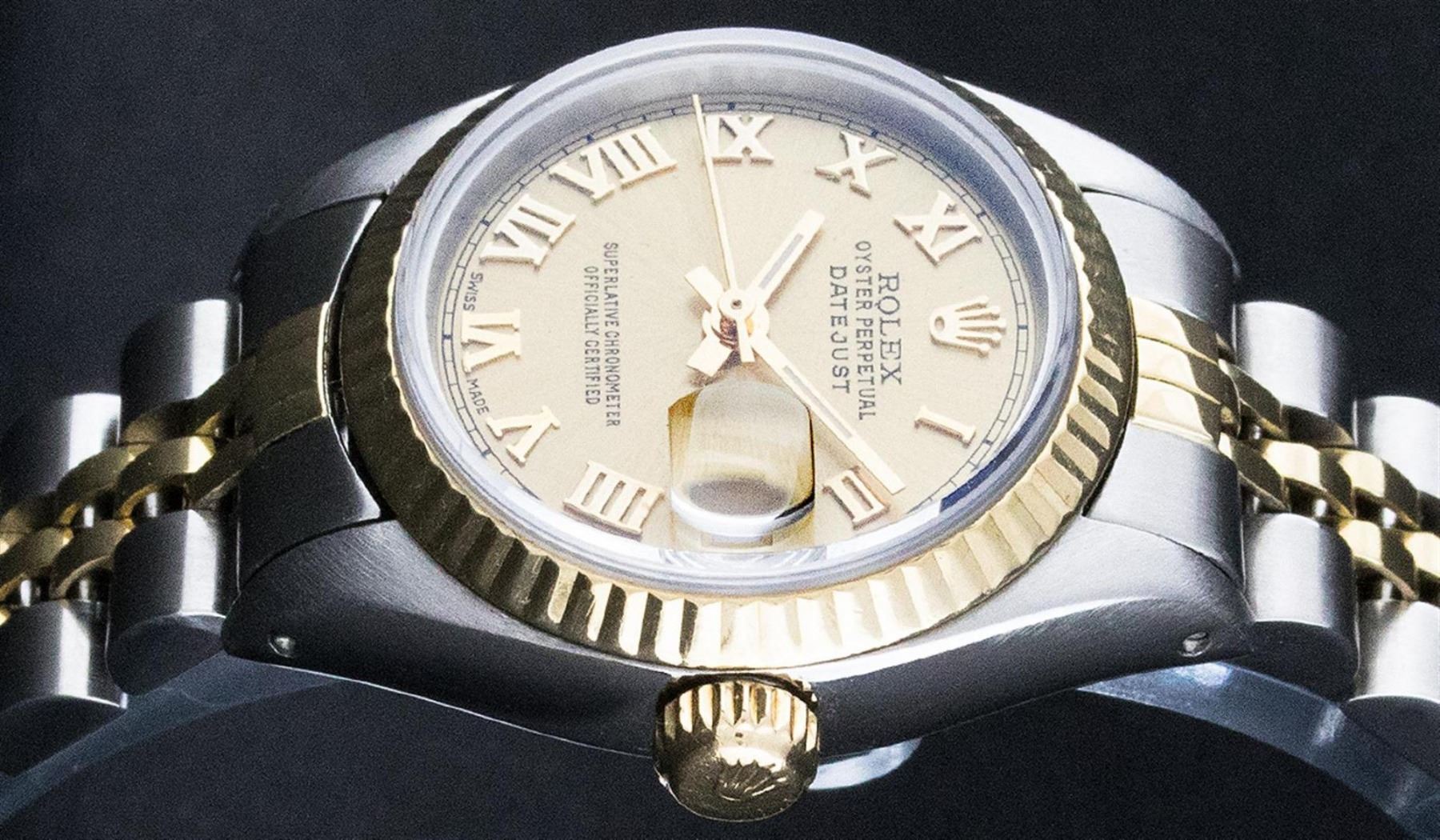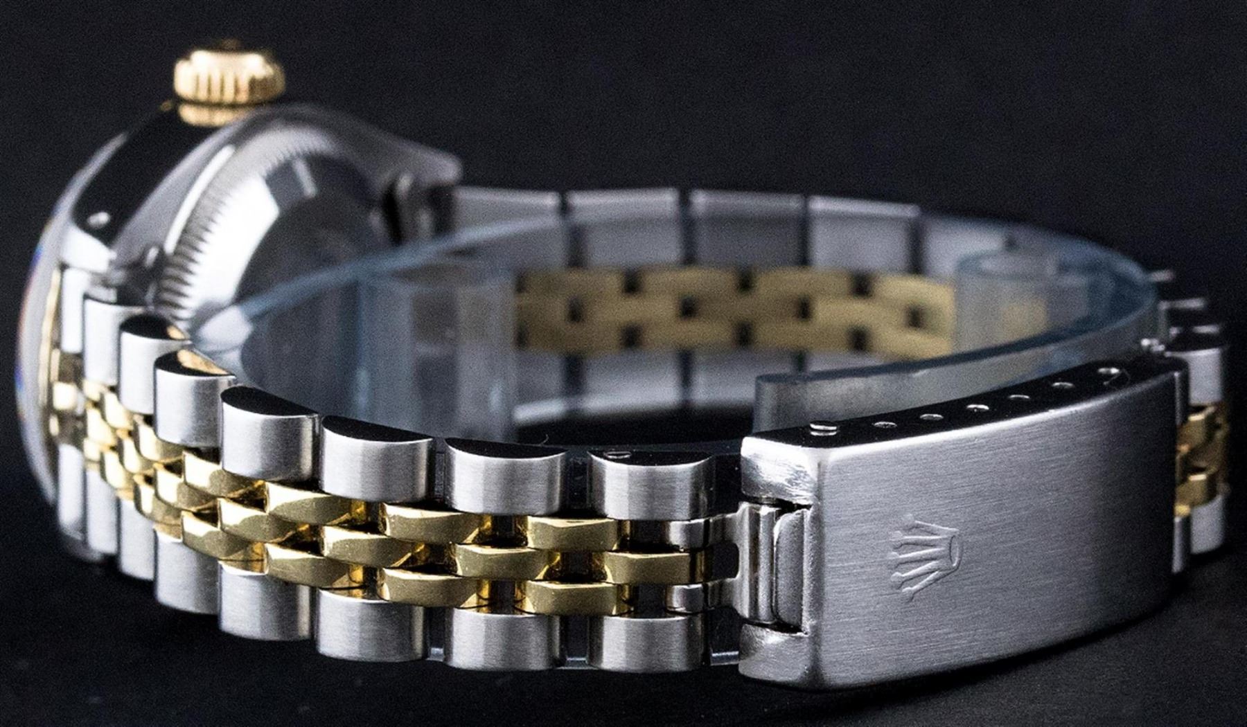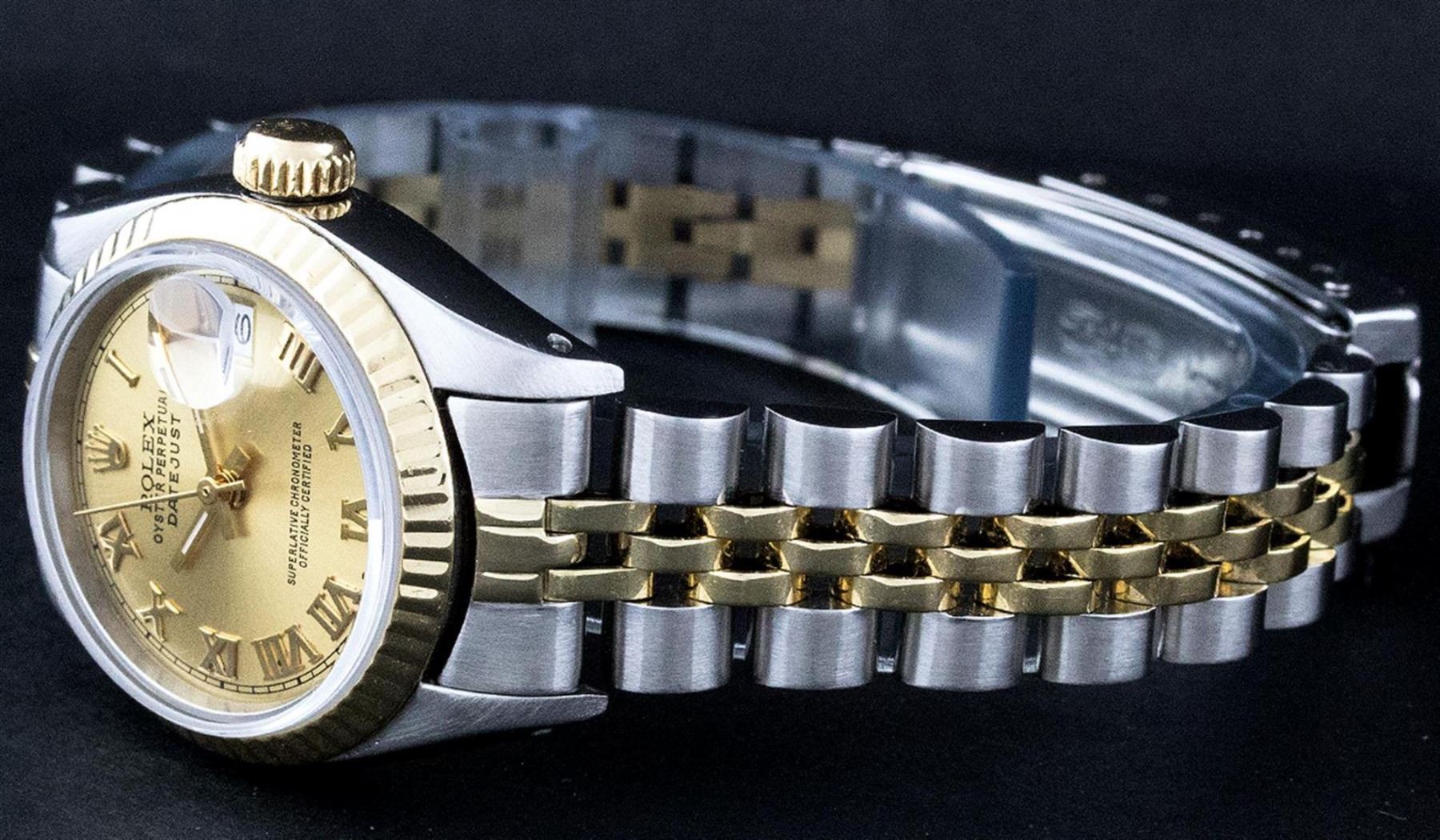 One Ladies 14K Two Tone Rolex Datejust Polished, Serviced & Electronically Tested, 14K Yellow Gold & Stainless Steel Case: 26mm, 14K Yellow Gold Crown, Bezel: 14K Yellow Gold Fluted Bezel. Custom Crystal: New Acrylic Cyclops Lens. Custom Hands: New Luminescent Hands. Movement: Automatic Winding Movement Caliber 2030. Custom Dial: Champagne Roman With Square Track. Date Window: 3 O'Clock Position Date Display, Model: Datejust. Condition: G-6 Extra Fine. Bracelet: Two Tone 14K Yellow Gold & Stainless Steel Jubilee Band. Bright Polish. 6.0 Inch Length, Adjustable. Standard Clasp, With Rolex Logo. This Watch Has Been Serviced Time Tested And Is In Excellent Condition It Is Free Of All Scratches And Dents.