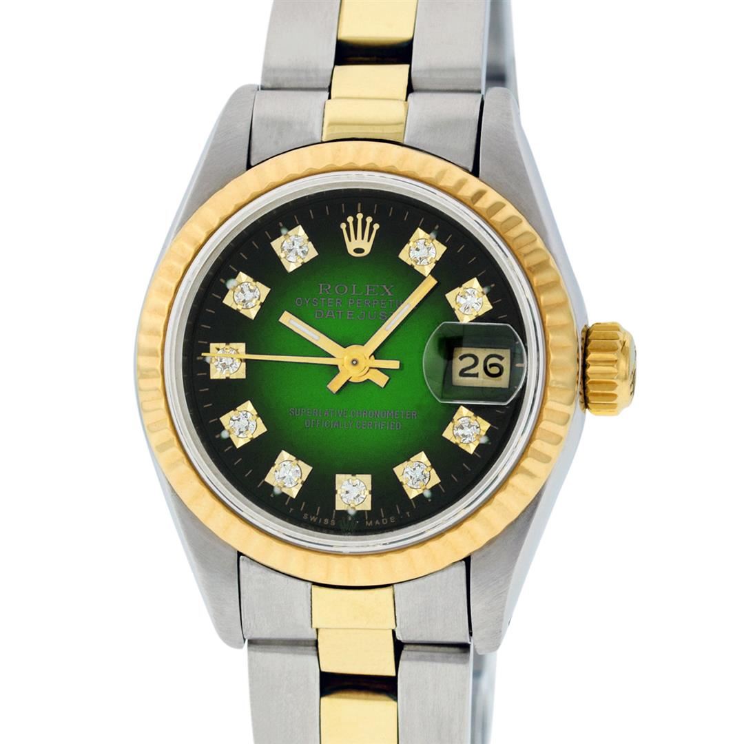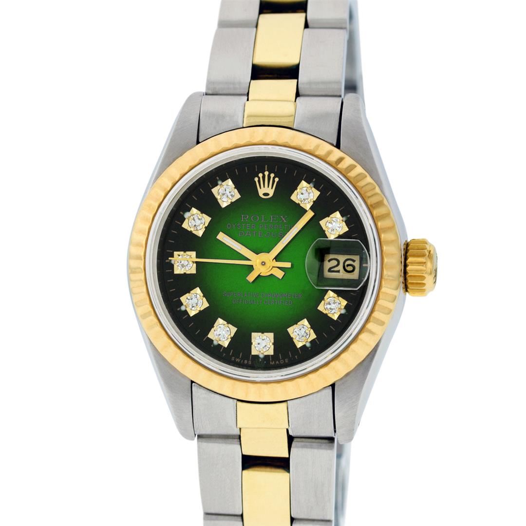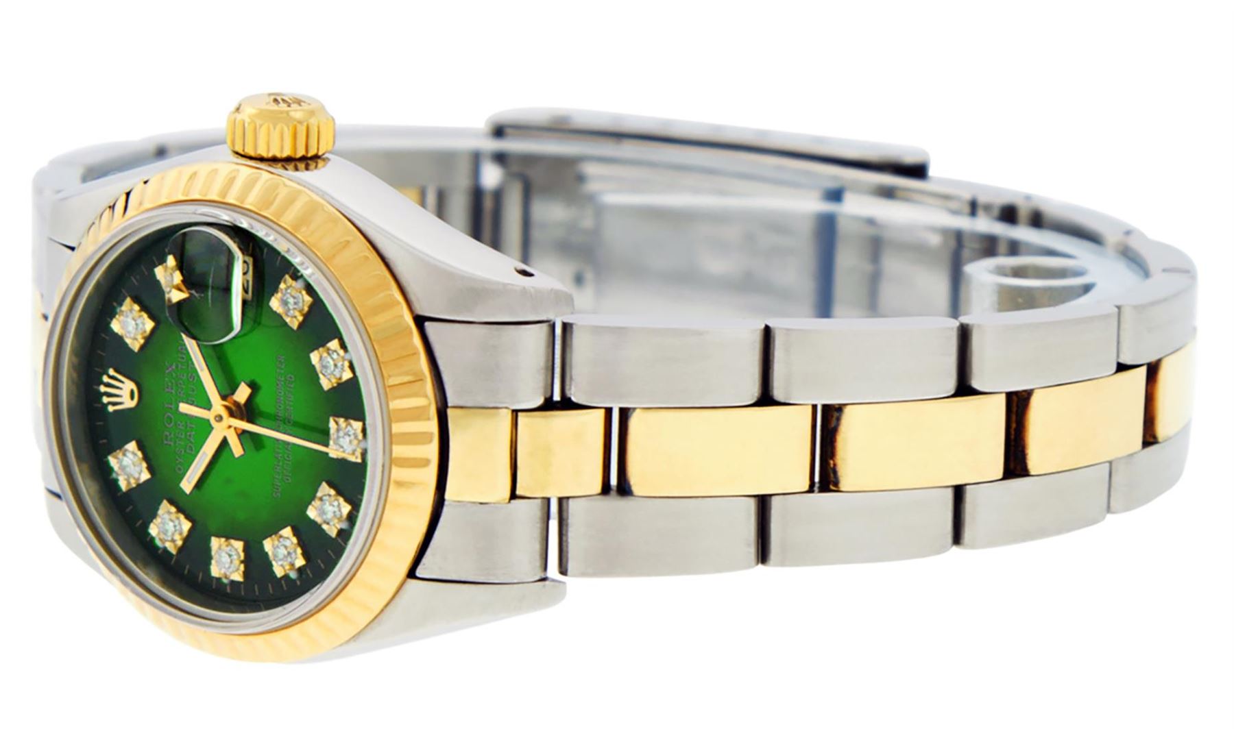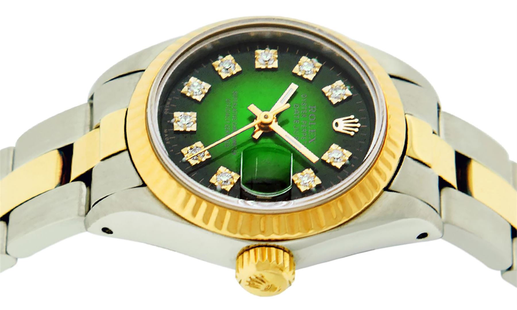 One Ladies 14K Two Tone Rolex Datejust Polished, Serviced & Electronically Tested, 14K Yellow Gold & Stainless Steel Case: 26mm, 14K Yellow Gold Crown, Bezel: 14K Yellow Gold Fluted Bezel. Custom Crystal: New Acrylic Cyclops Lens. Custom Hands: New Luminescent Hands. Movement: Automatic Winding Movement Caliber 2030. Custom Dial: Green Vignette With Diamond Hour Markers Dash Track & Lumi Dots, Diamond Count: 10 Single Cut Diamonds, Color: G to H, Clarity: VS. Date Window: 3 O'Clock Position Date Display, Model: Datejust. Condition: G-6 Extra Fine. Bracelet: Two Tone 14K Yellow Gold & Stainless Steel Oyster Band. Bright Polish. 6.0 Inch Length, Adjustable. Standard Clasp, With Rolex Logo. This Watch Has Been Serviced Time Tested And Is In Excellent Condition It Is Free Of All Scratches And Dents.