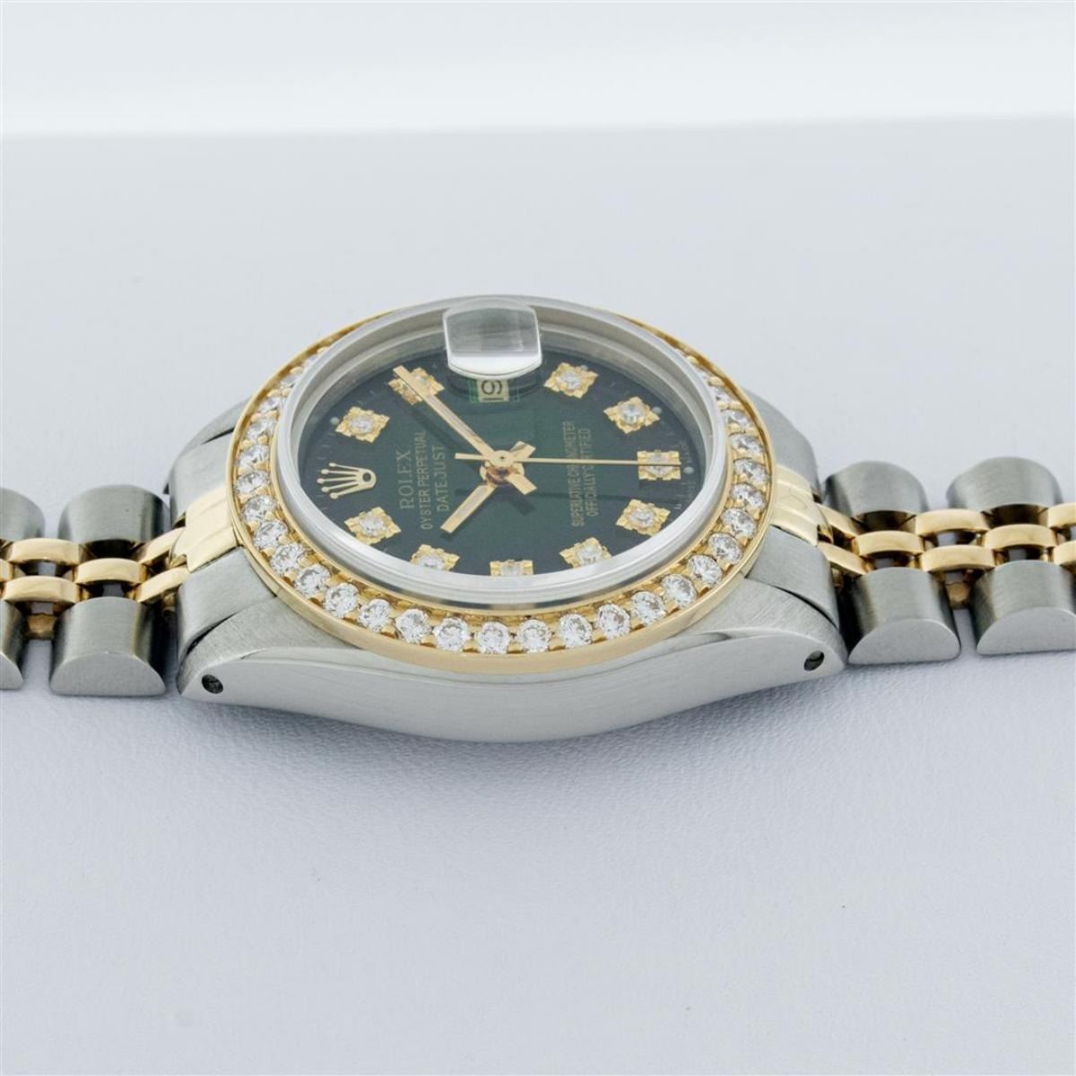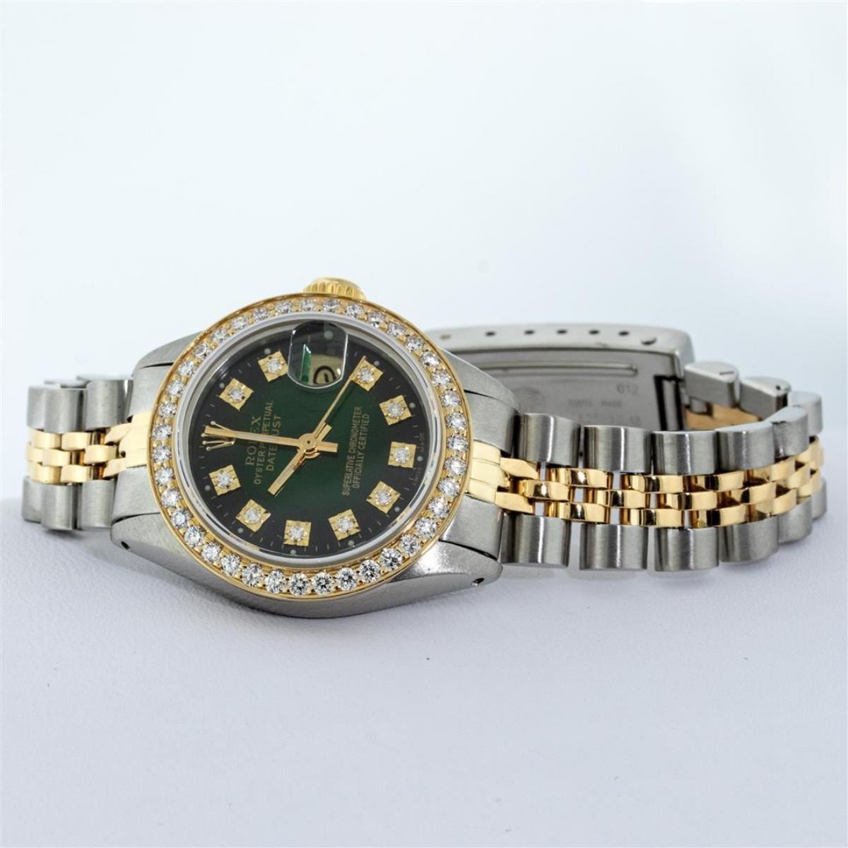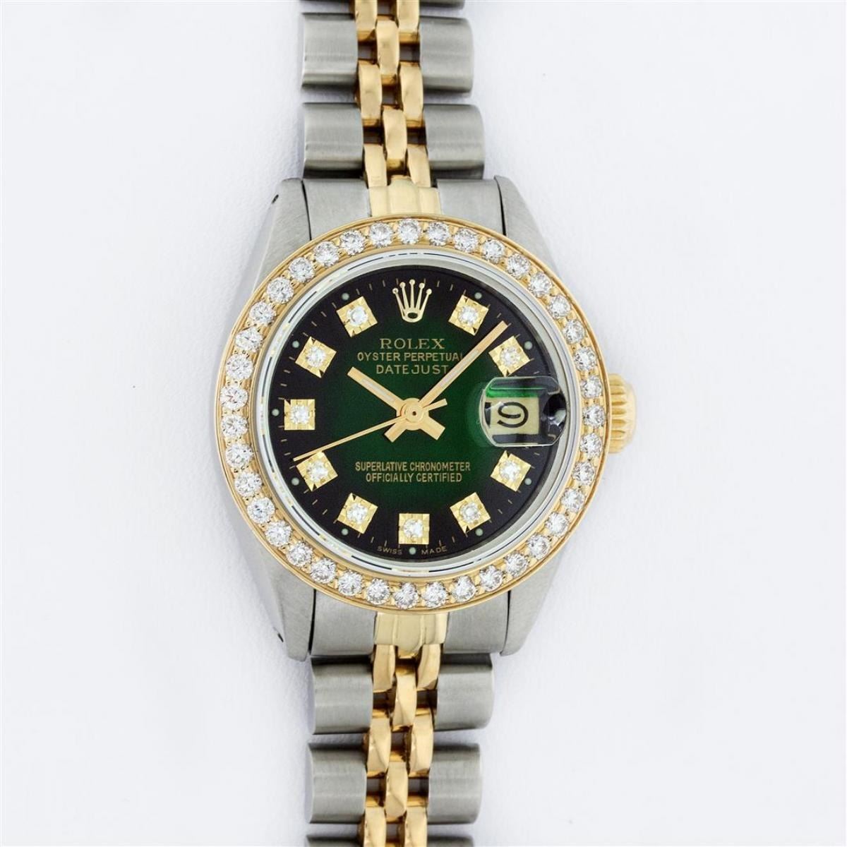 One Ladies 14K Two Tone Rolex Datejust Polished, Serviced & Electronically Tested, 14K Yellow Gold & Stainless Steel Case: 26mm, 14K Yellow Gold Crown, Custom Bezel: New 18K 1ctw Yellow Gold Beadset Diamond Bezel, Diamond Count: 42 Diamonds, Total Weight 1.00 Carat, Clarity: SI-VS, Color: G to H. Custom Crystal: New Synthetic Sapphire Cyclops Lens. Custom Hands: New Luminescent Hands. Movement: Automatic Winding Movement Caliber 2030. Custom Dial: Green Vignette VS Diamond Dial, Diamond Count: 10 Single Cut Diamonds in Dial, G To H In Color, VS Clarity. Date Window: 3 O'Clock Position Date Display, Model: Datejust, Condition: G-6 Extra Fine. Bracelet: Two Tone 14K Yellow Gold & Stainless Steel Jubilee. Bright Polish. 6.0 Inch Length, Adjustable. Standard Clasp, With Rolex Logo. This Watch Has Been Serviced Time Tested And Is In Excellent Condition It Is Free Of All Scratches And Dents.