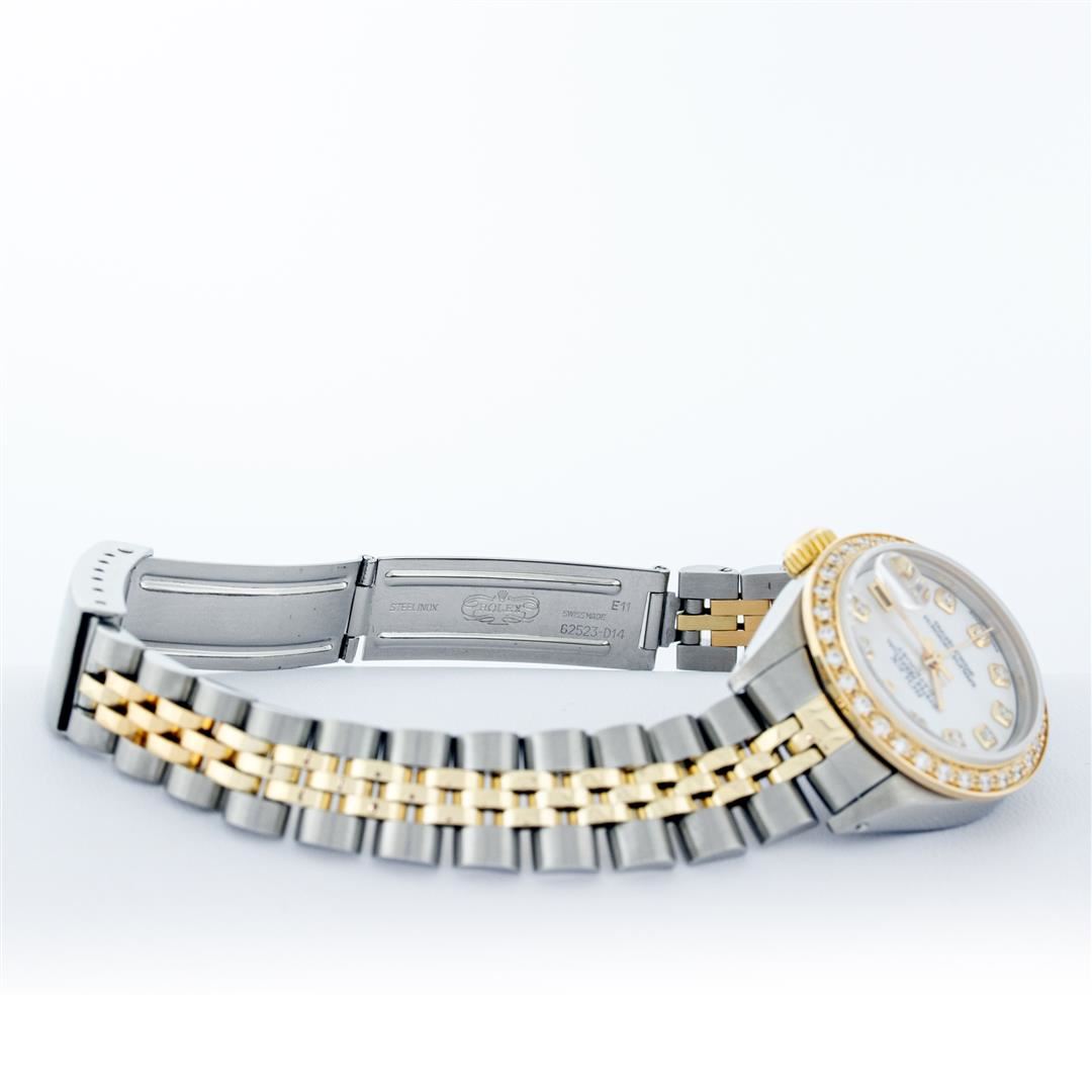 One Ladies 14K Two Tone Rolex Datejust Polished, Serviced & Electronically Tested, 14K Yellow Gold & Stainless Steel Case: 26mm, 14K Yellow Gold Crown, Custom Bezel: 18K Yellow Gold Beadset Diamond Bezel, Diamond Count: 32 Diamonds Total Weight .70 Carat, Clarity: Si-VS, Color: G to H. Custom Crystal: Synthetic Sapphire Cyclops Lens. Custom Hands: New Luminescent Hands. Movement: Automatic Winding Movement Caliber 2030. Custom Dial: Mother Of Pearl Dial Set With Diamond Hour Markers, 10 Diamond in Dial G To H In Color, SI-VS Clarity. Date Window: 3 O'Clock Position Date Display, Model: Datejust. Condition: G-6 Extra Fine. Bracelet: Two Tone 14K Yellow Gold & Stainless Steel Jubilee. Bright Polish. 6.0 Inch Length, Adjustable. Standard Clasp, With Rolex Logo. This Watch Has Been Serviced Time Tested And Is In Excellent Condition It Is Free Of All Scratches And Dents.