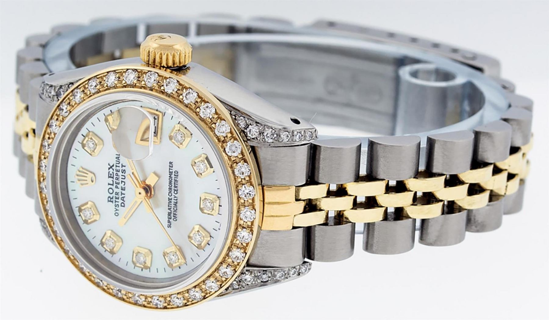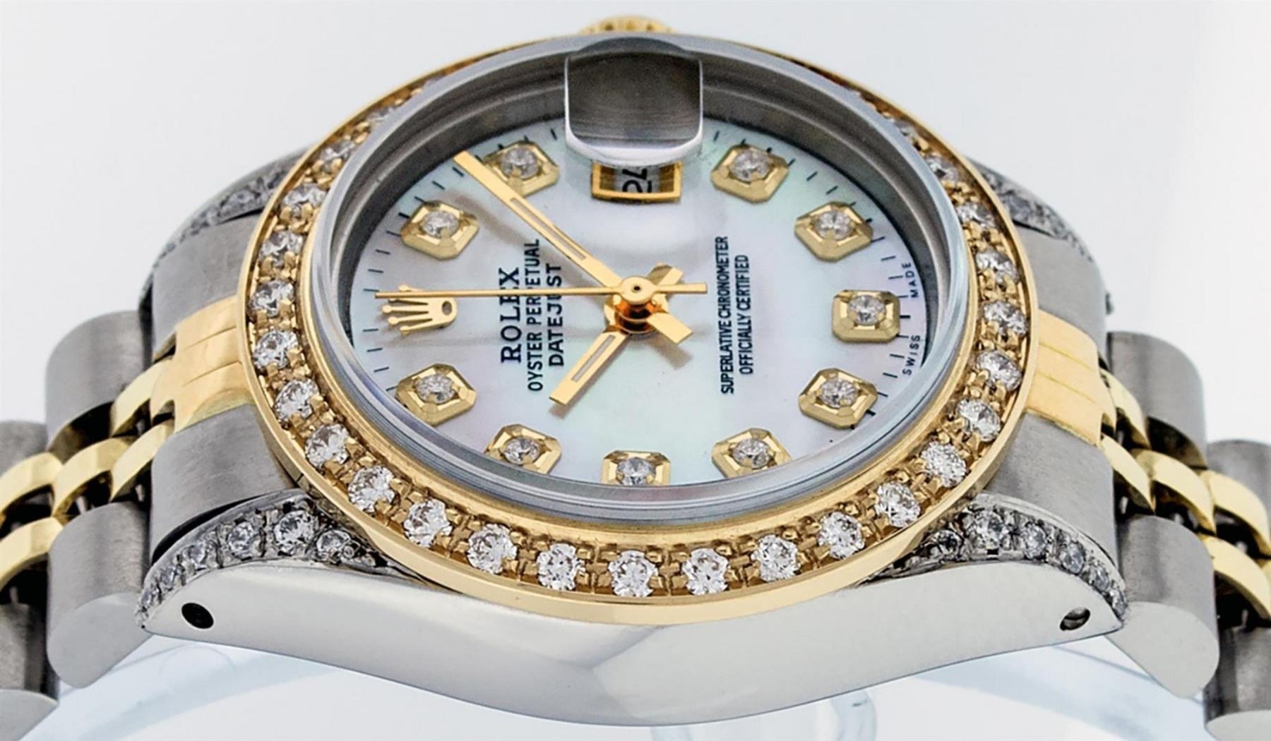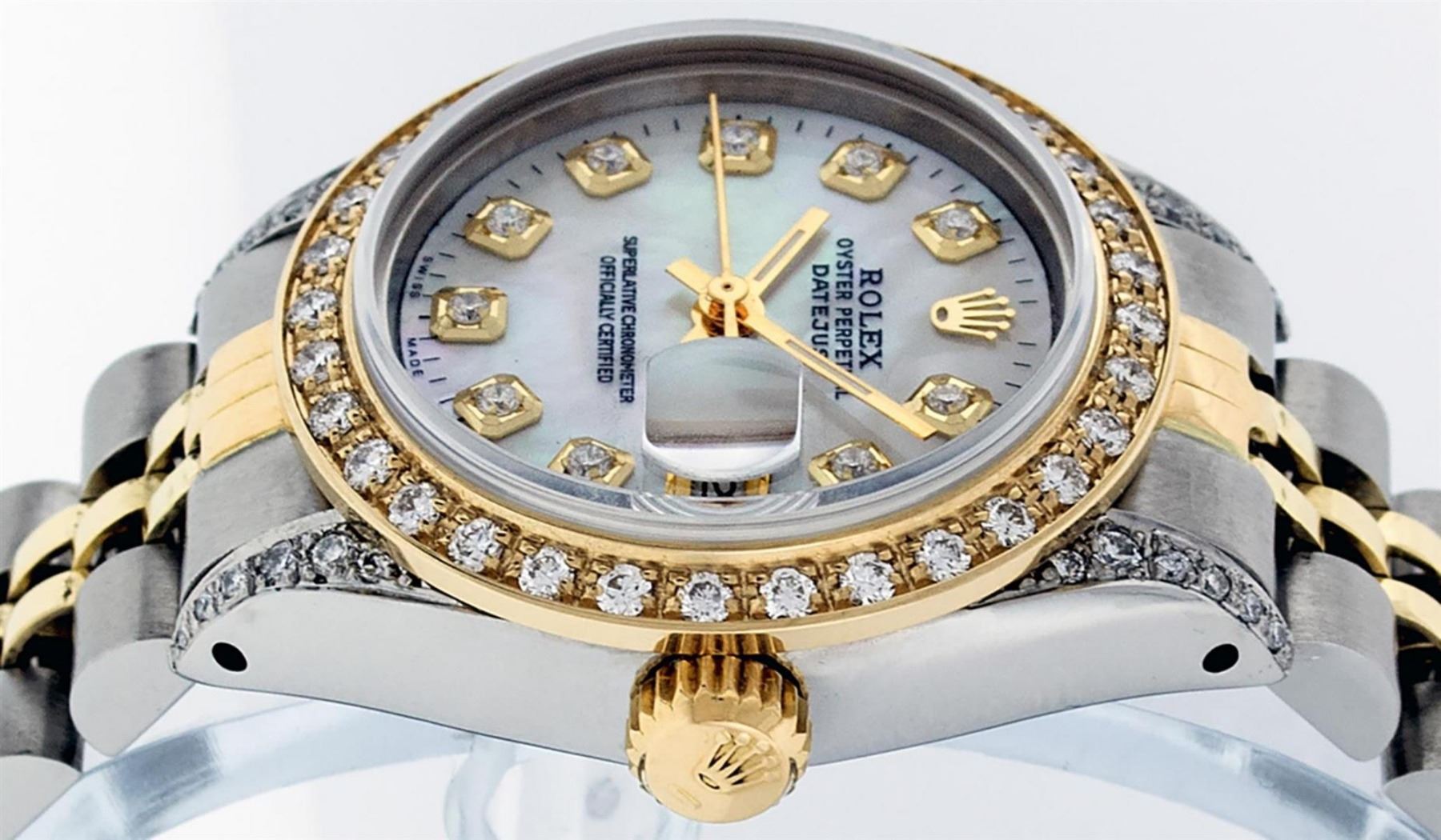 One Ladies 14K Two Tone Rolex Datejust Polished, Serviced & Electronically Tested, 14K Yellow Gold & Stainless Steel Case: 26mm, 14K Yellow Gold Crown, Diamond Lugs: 24 Diamonds On Lugs, Clarity: SI-VS, Color: G to H, Clarity SI-VS. Custom Bezel: New 18K Yellow Gold Beadset Diamond Bezel, Diamond Count: 32 Diamonds, Total Weight .70 Carat, Clarity: SI-VS, Color: G to H. Custom Crystal: New Synthetic Sapphire Cyclops Lens. Custom Hands: New Luminescent Hands. Movement: Automatic Winding Movement Caliber 2030. Custom Dial: Mother Of Pearl With Diamond Hour Markers and Dash Track, Diamond Count: 10 Diamonds, Clarity: SI-VS, Color: G to H. Date Window: 3 O'Clock Position Date Display, Model: Datejust. Condition: G-6 Extra Fine. Bracelet: Two Tone 14K Yellow Gold & Stainless Steel Jubilee. Bright Polish. 6.0 Inch Length, Adjustable. Standard Clasp, With Rolex Logo. This Watch Has Been Serviced Time Tested And Is In Excellent Condition It Is Free Of All Scratches And Dents.