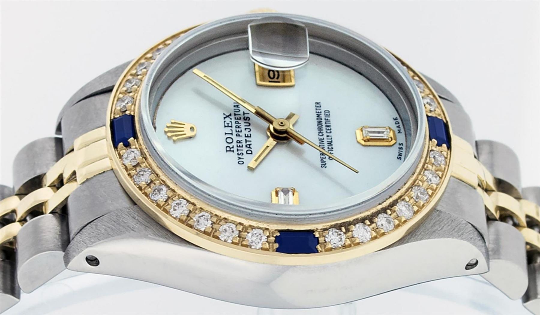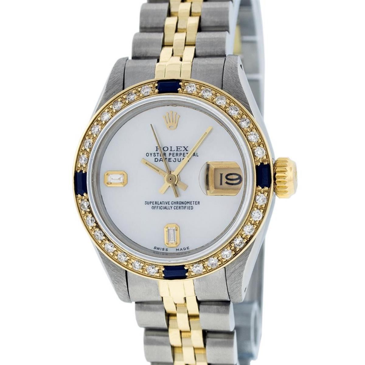 One Ladies 14K Two Tone Rolex Datejust Polished, Serviced & Electronically Tested, 14K Yellow Gold & Stainless Steel Case: 26mm, 14K Yellow Gold Crown, Custom Bezel: New 18K Yellow Gold Sapphire Beadset Diamond Bezel, Diamond Count: 28 Diamonds + 4 Sapphires In Bezel. Total Weight .70 Carat, Clarity: SI-VS, Color: G to H. Custom Crystal: New Scratch Resistant Synthetic Sapphire Cyclops Lens. Custom Hands: New Luminescent Hands. Movement: Automatic Winding Movement Caliber 2030. Custom Dial: Mother Of Pearl With Baguette Diamonds, Stone Count: 2 Baguettes. Date Window: 3 O'Clock Position Date Display, Model: Datejust. Condition: G-6 Extra Fine. Bracelet: Two Tone 14K Yellow Gold & Stainless Steel Jubilee Band. Bright Polish. 6.0 Inch Length, Adjustable. Standard Clasp, With Rolex Logo. This Watch Has Been Serviced Time Tested And Is In Excellent Condition It Is Free Of All Scratches And Dents.