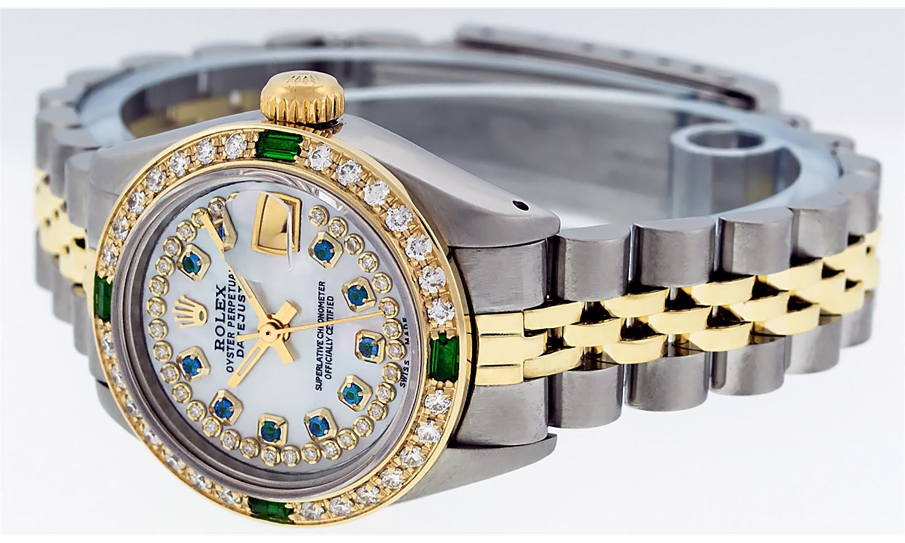One Ladies 14K Two Tone Rolex Datejust Polished, Serviced & Electronically Tested, 14K Yellow Gold & Stainless Steel Case: 26mm, 14K Yellow Gold Crown, Custom Bezel: New 18K New Yellow Gold Emerald Beadset Diamond Bezel, Diamond Count: 28 Diamonds + 4 Emeralds In Dial, Total Weight .70 Carat, Clarity: SI-VS, Color: G to H. Custom Crystal: New Scratch Resistant Synthetic Sapphire Cyclops Lens. Custom Hands: New Luminescent Hands. Movement: Automatic Winding Movement Caliber 2030. Custom Dial: Mother Of Pearl Sapphire String Diamond Dial, Stone Count: 10 Sapphires + 33 Diamonds In Dial, Clarity: SI-VS, Color: G to H. Date Window: 3 O'Clock Position Date Display, Model: Datejust. Condition: G-6 Extra Fine. Bracelet: Two Tone 14K Yellow Gold & Stainless Steel Jubilee Band. Bright Polish. 6.0 Inch Length, Adjustable. Standard Clasp, With Rolex Logo. This Watch Has Been Serviced Time Tested And Is In Excellent Condition It Is Free Of All Scratches And Dents.