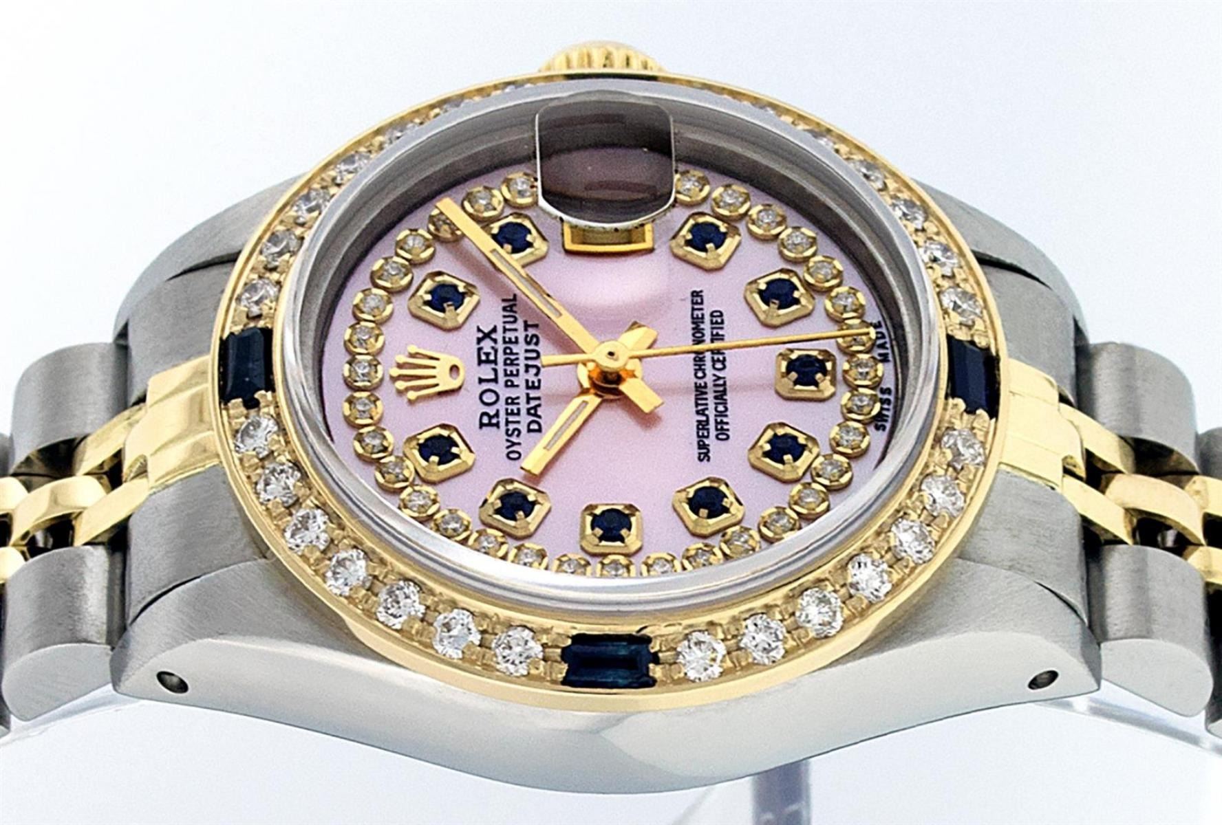 One Ladies 14K Two Tone Rolex Datejust Polished, Serviced & Electronically Tested, 14K Yellow Gold & Stainless Steel Case: 26mm, 14K Yellow Gold Crown, Custom Bezel: New 18K Yellow Gold Sapphire Beadset Diamond Bezel, Diamond Count: 28 Diamonds + 4 Sapphires, Total Weight .70 Carat, Clarity: SI-VS, Color: G to H. Custom Crystal: New Synthetic Sapphire Cyclops Lens. Custom Hands: New Luminescent Hands. Movement: Automatic Winding Movement Caliber 2030. Custom Dial: Pink Mother Of Pearl With Sapphire String Diamond Hour Markers. Stone Count: 10 Sapphires + 33 Diamonds In Dial, Clarity: SI-VS, Color: G to H. Date Window: 3 O'Clock Position Date Display, Model: Datejust. Condition: G-6 Extra Fine. Bracelet: Two Tone 14K Yellow Gold & Stainless Steel Jubilee. Bright Polish. 6.0 Inch Length, Adjustable. Standard Clasp, With Rolex Logo. This Watch Has Been Serviced Time Tested And Is In Excellent Condition It Is Free Of All Scratches And Dents.