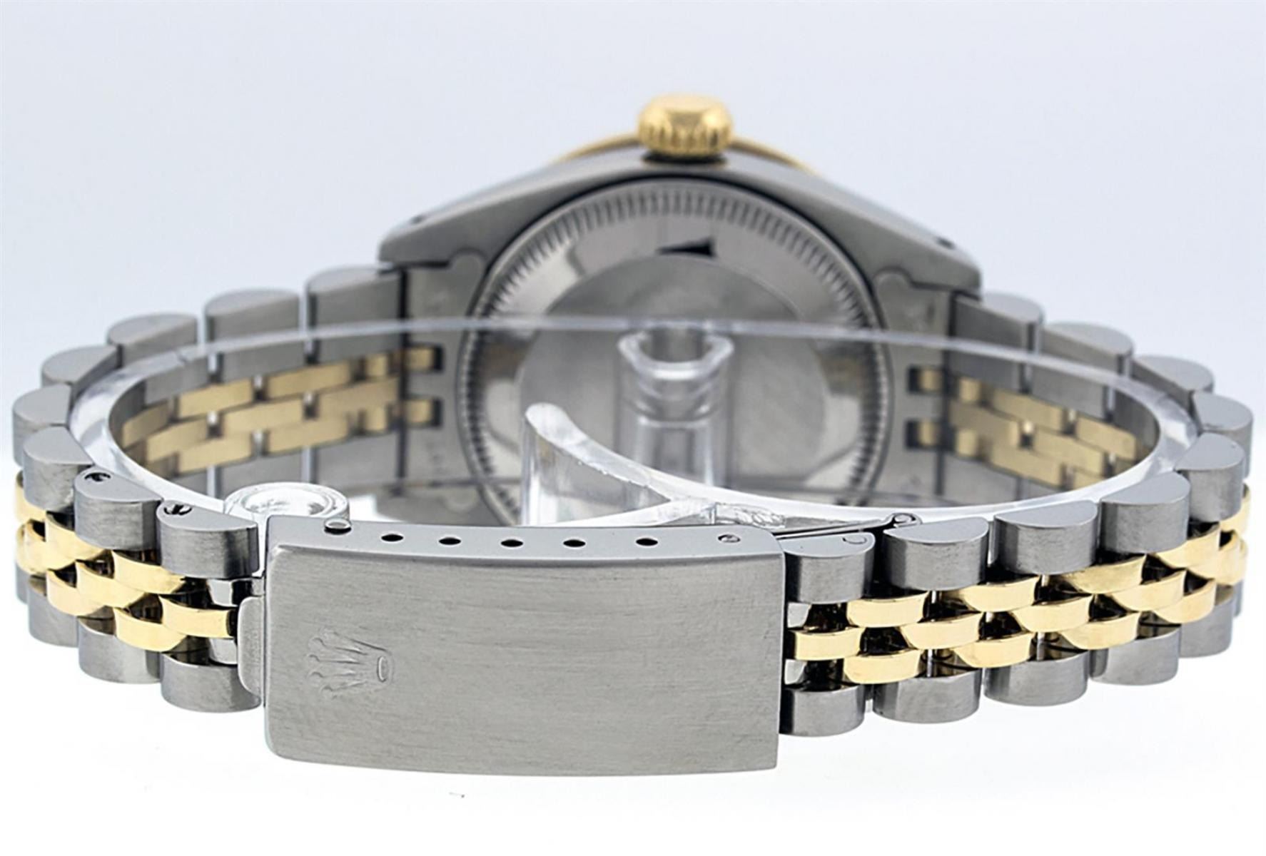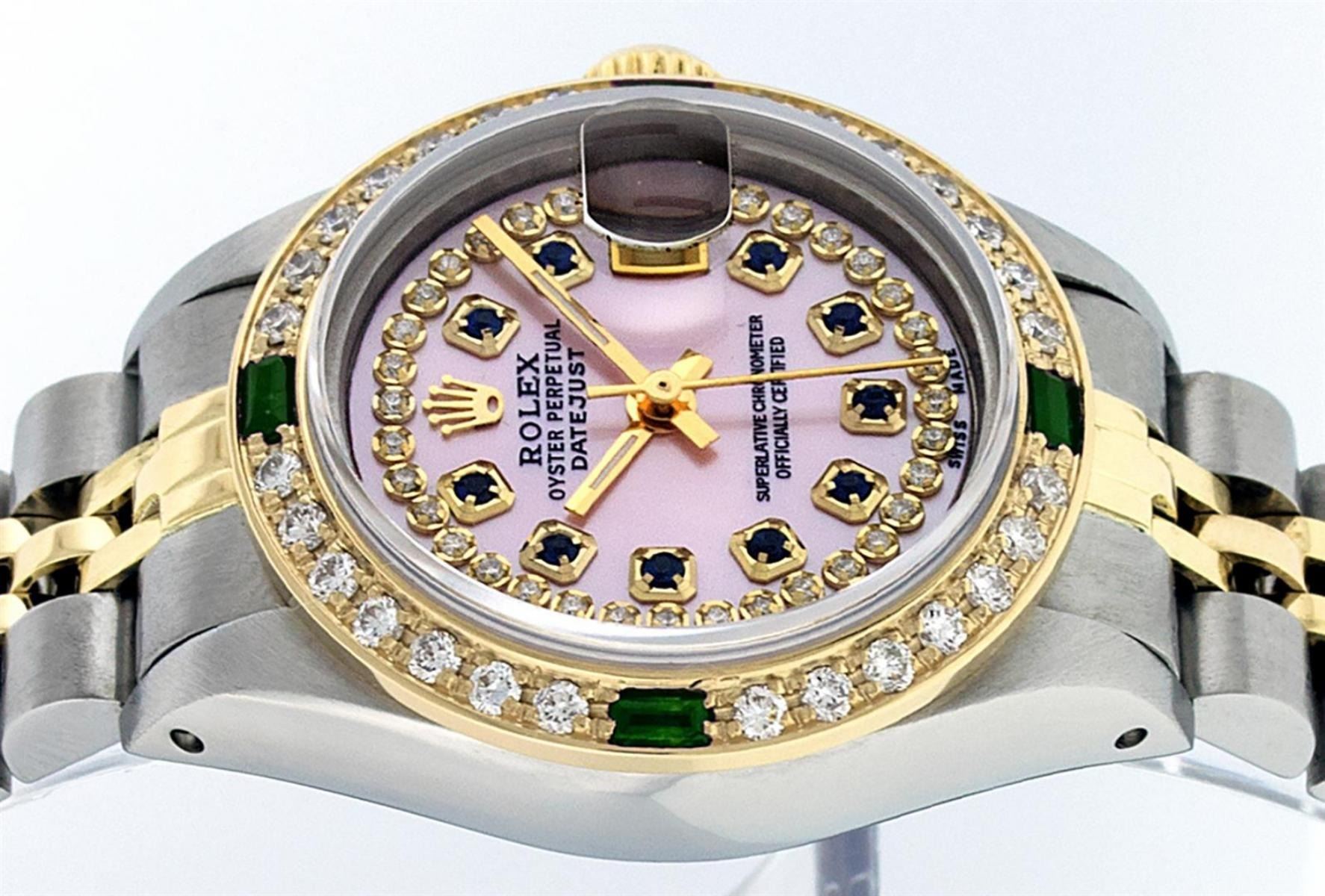 One Ladies 14K Two Tone Rolex Datejust Polished, Serviced & Electronically Tested, 14K Yellow Gold & Stainless Steel Case: 26mm, 14K Yellow Gold Crown, Custom Bezel: New 18K New Yellow Gold Emerald Beadset Diamond Bezel, Diamond Count: 28 Diamonds + 4 Emeralds In Dial, Total Weight .70 Carat, Clarity: SI-VS, Color: G to H. Custom Crystal: New Scratch Resistant Synthetic Sapphire Cyclops Lens. Custom Hands: New Luminescent Hands. Movement: Automatic Winding Movement Caliber 2030. Custom Dial: Pink Mother Of Pearl Sapphire String Diamond Dial, Stone Count: 10 Sapphires + 33 Diamonds In Dial, Clarity: SI-VS, Color: G to H. Date Window: 3 O'Clock Position Date Display, Model: Datejust. Condition: G-6 Extra Fine. Bracelet: Two Tone 14K Yellow Gold & Stainless Steel Jubilee Band. Bright Polish. 6.0 Inch Length, Adjustable. Standard Clasp, With Rolex Logo. This Watch Has Been Serviced Time Tested And Is In Excellent Condition It Is Free Of All Scratches And Dents.