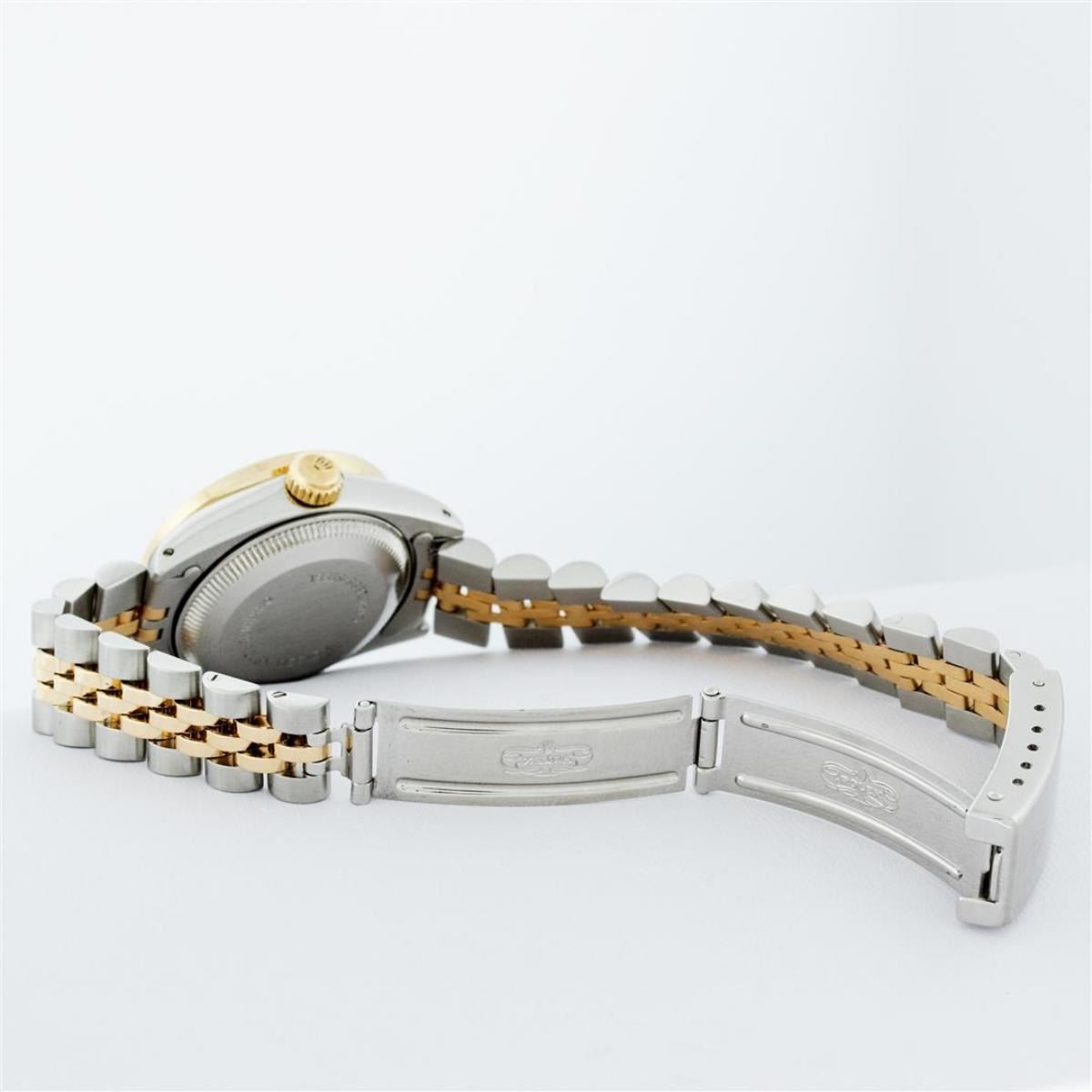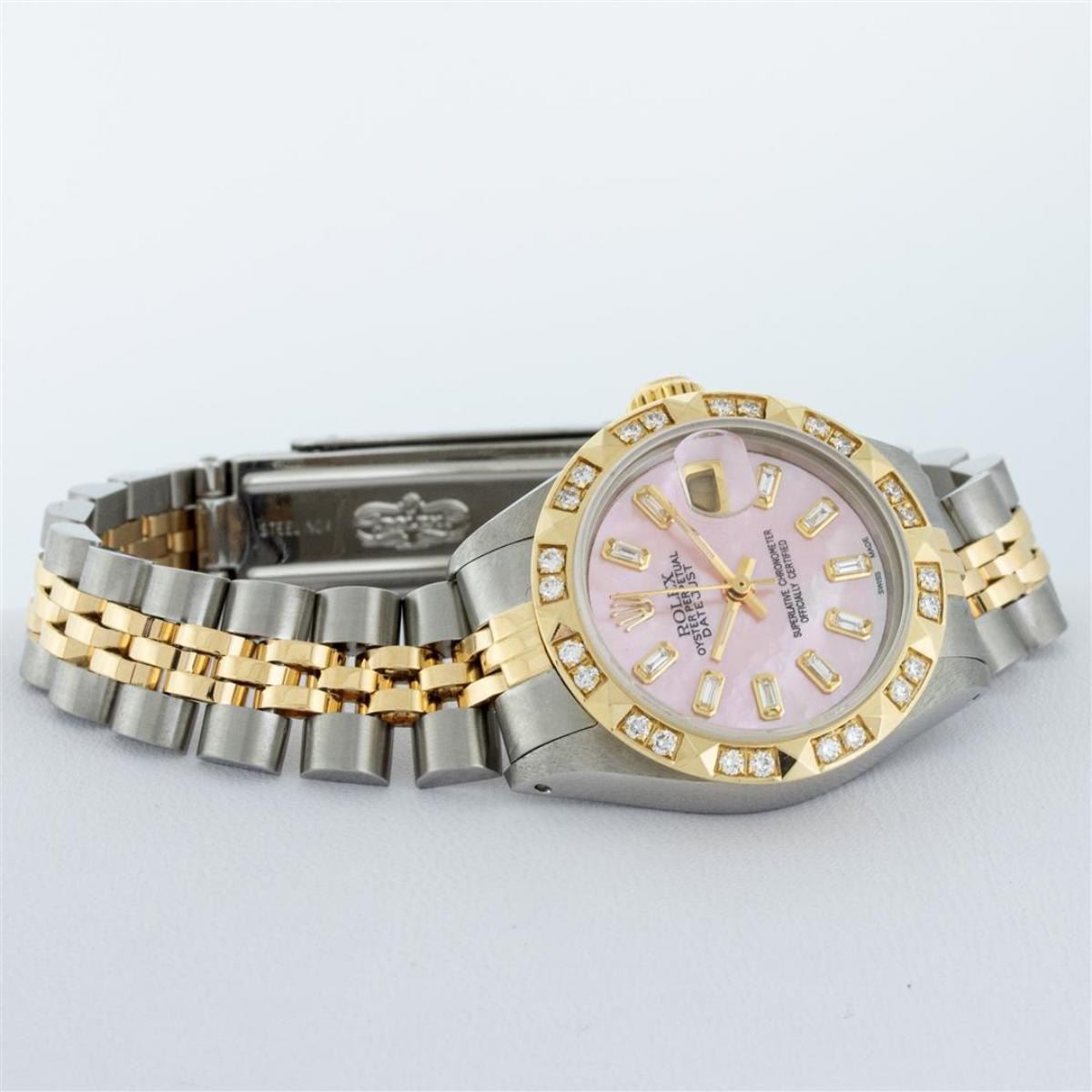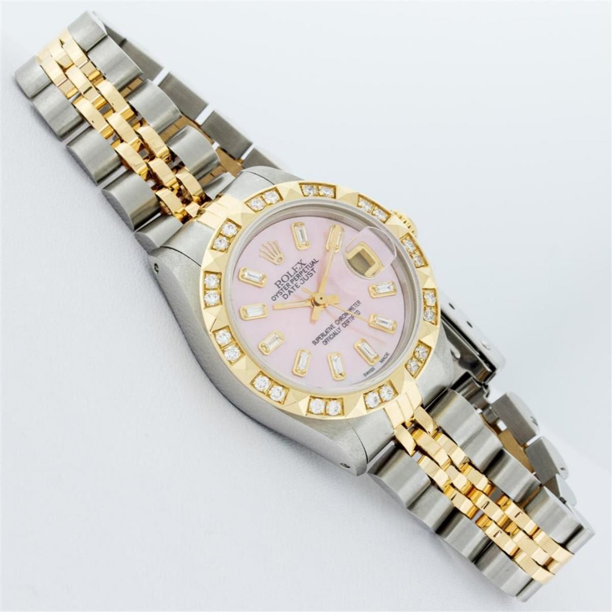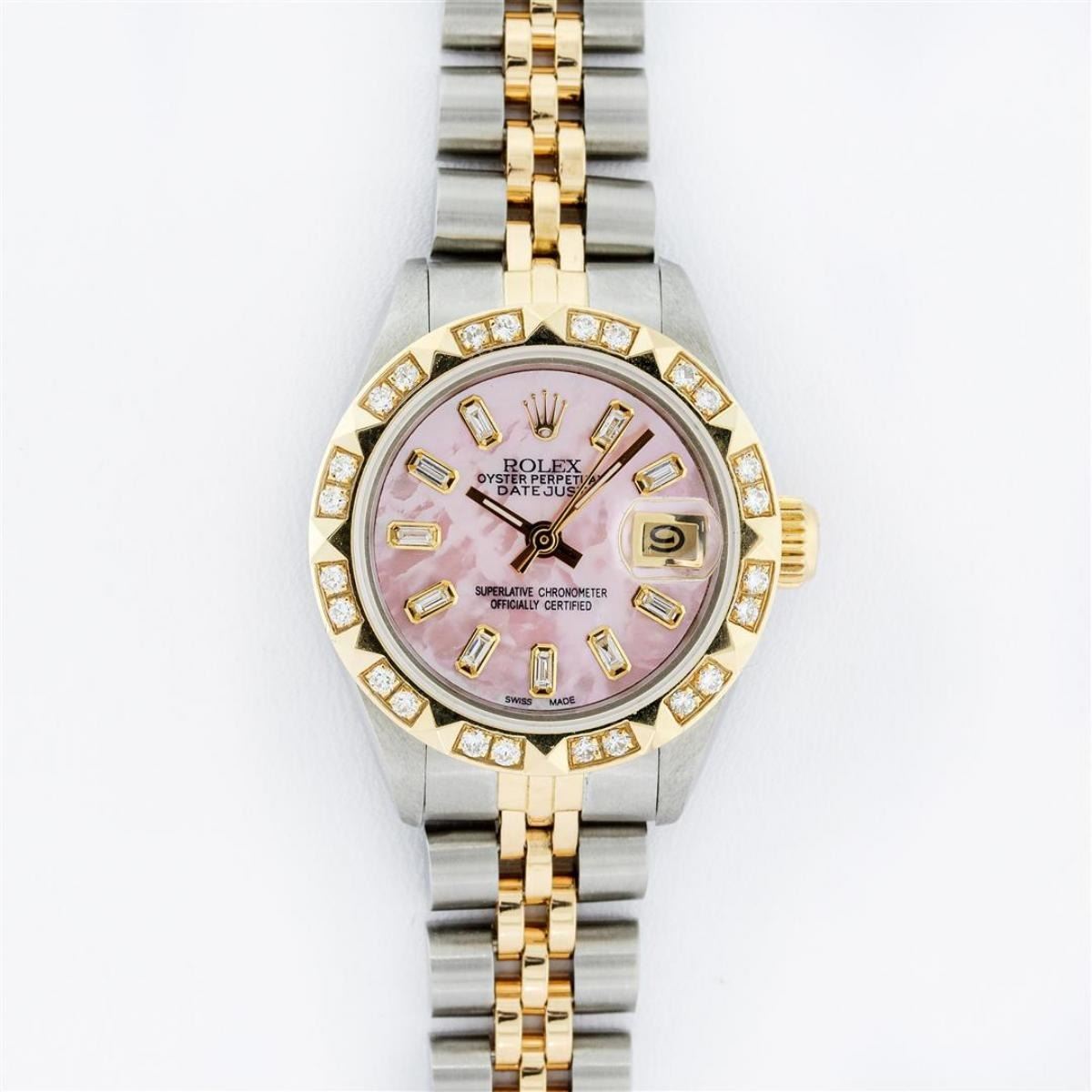 One Ladies 14 Two Tone Rolex Datejust Polished, Serviced & Electronically Tested, 14K Yellow Gold & Stainless Steel Case: 26mm, 14K Yellow Gold Crown, Custom Bezel: 18K Yellow Gold Pyramid Diamond Bezel, Diamond Count: 24 Diamonds Total Weight .50 Carat, Clarity: Si-VS, Color: G to H. Custom Crystal: Synthetic Sapphire Cyclops Lens. Custom Hands: New Luminescent Hands. Movement: Automatic Winding Movement Caliber 2030. Custom Dial: Pink Mother Of Pearl Baguette Diamond Hour Markers. 10 Baguette Diamonds In Dial, Clarity: SI-VS, Color: G to H. Date Window: 3 O'Clock Position Date Display, Model: Datejust. Condition: G-6 Extra Fine. Bracelet: Two Tone 14K Yellow Gold & Stainless Steel Jubilee. Bright Polish. 6.0 Inch Length, Adjustable. Standard Clasp, With Rolex Logo. This Watch Has Been Serviced Time Tested And Is In Excellent Condition It Is Free Of All Scratches And Dents.