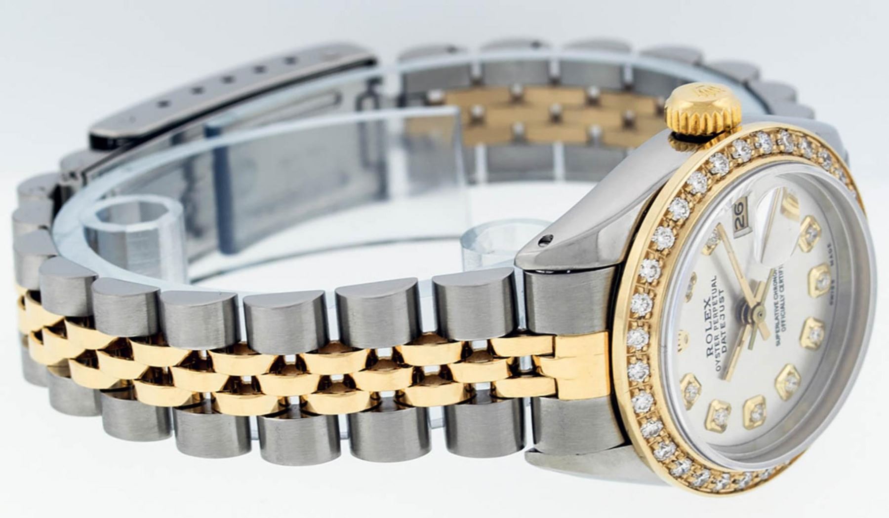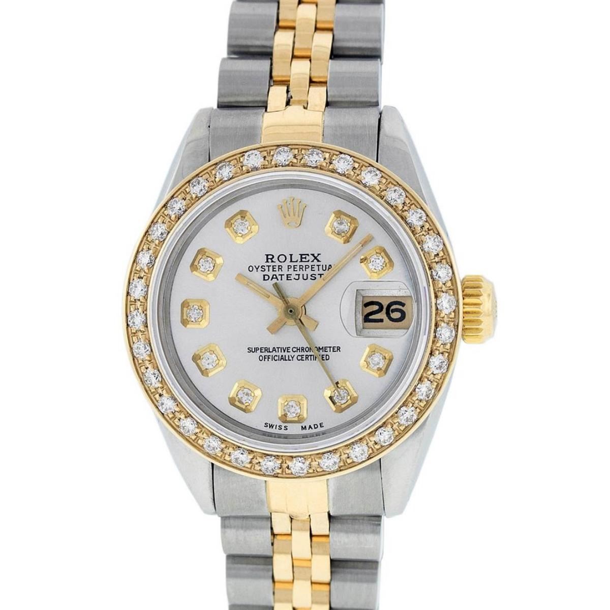 One Ladies 14K Two Tone Rolex Datejust Polished, Serviced & Electronically Tested, 14K Yellow Gold & Stainless Steel Case: 26mm, 14K Yellow Gold Crown, Custom Bezel: 18K Yellow Gold Beadset Diamond Bezel, Diamond Count: 32 Diamonds Total Weight .70 Carat, Clarity: Si-VS, Color: G to H. Custom Crystal: Synthetic Sapphire Cyclops Lens. Custom Hands: New Luminescent Hands. Movement: Automatic Winding Movement Caliber 2030. Custom Dial: Silver Dial Set With Diamond Hour Markers, 10 Diamond in Dial G To H In Color, Si-VS Clarity. Date Window: 3 O'Clock Position Date Display, Model: Datejust. Condition: G-6 Extra Fine. Bracelet: Two Tone 14K Yellow Gold & Stainless Steel Jubilee. Bright Polish. 6.0 Inch Length, Adjustable. Standard Clasp, With Rolex Logo. This Watch Has Been Serviced Time Tested And Is In Excellent Condition It Is Free Of All Scratches And Dents.