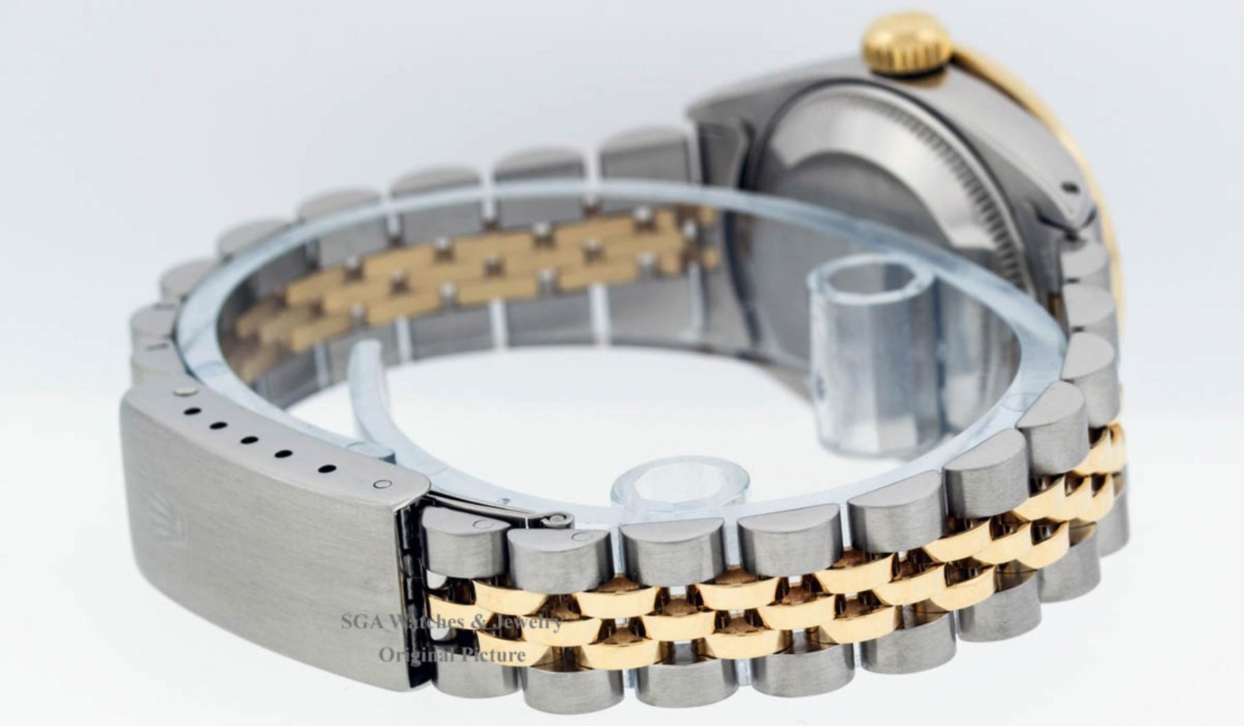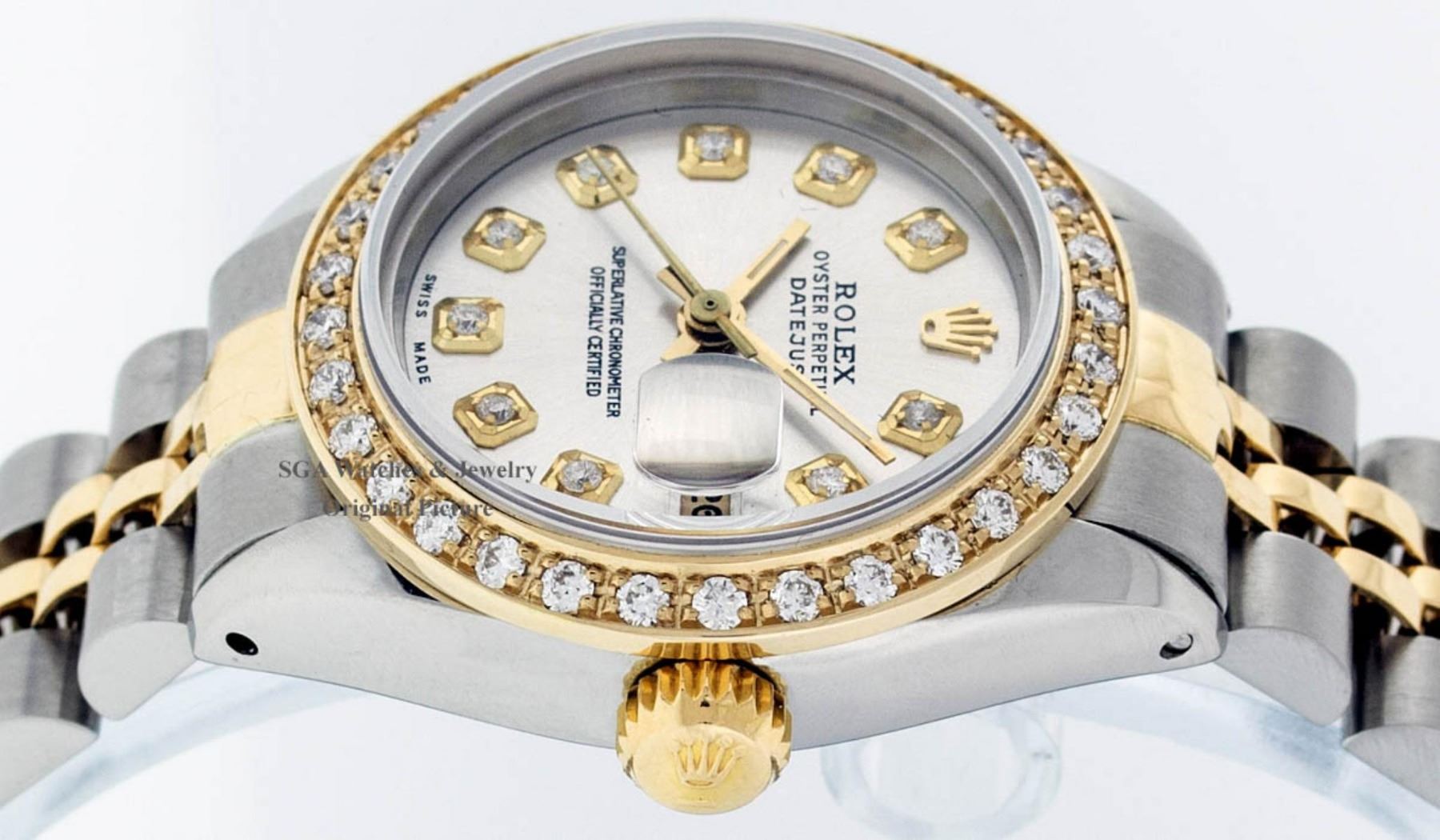One Ladies 14K Two Tone Rolex Datejust Polished, Serviced & Electronically Tested, 14K Yellow Gold & Stainless Steel Case: 26mm, 14K Yellow Gold Crown, Custom Bezel: 18K Yellow Gold Beadset Diamond Bezel, Diamond Count: 32 Diamonds Total Weight .70 Carat, Clarity: Si-VS, Color: G to H. Custom Crystal: Synthetic Sapphire Cyclops Lens. Custom Hands: New Luminescent Hands. Movement: Automatic Winding Movement Caliber 2030. Custom Dial: Silver Dial Set With Diamond Hour Markers, 10 Diamond in Dial G To H In Color, Si-VS Clarity. Date Window: 3 O'Clock Position Date Display, Model: Datejust. Condition: G-6 Extra Fine. Bracelet: Two Tone 14K Yellow Gold & Stainless Steel Jubilee. Bright Polish. 6.0 Inch Length, Adjustable. Standard Clasp, With Rolex Logo. This Watch Has Been Serviced Time Tested And Is In Excellent Condition It Is Free Of All Scratches And Dents.