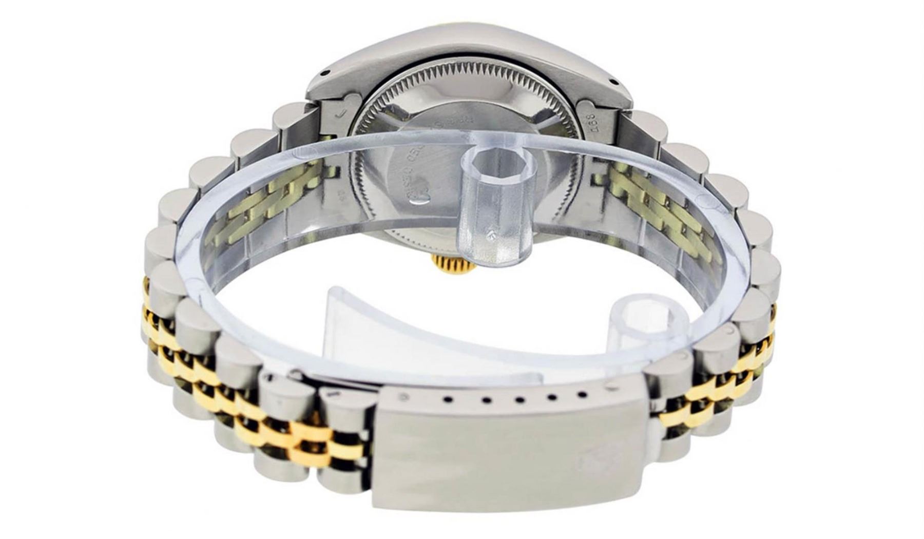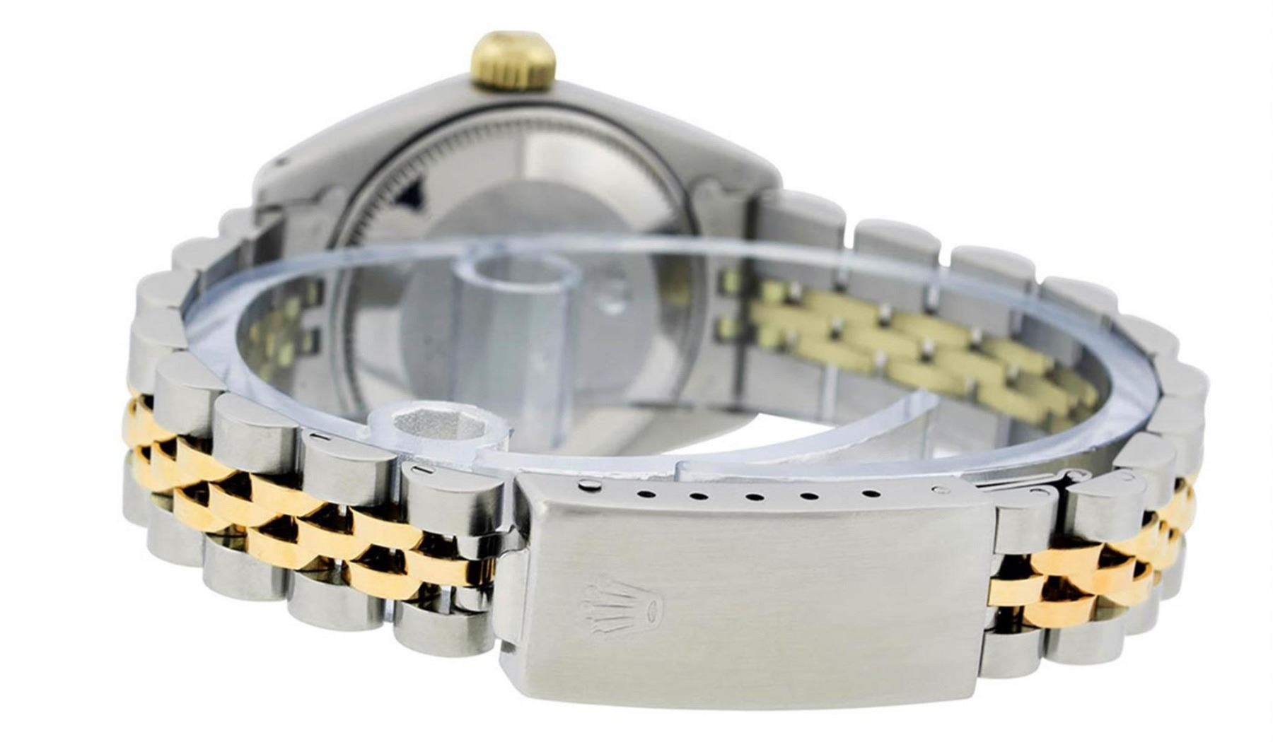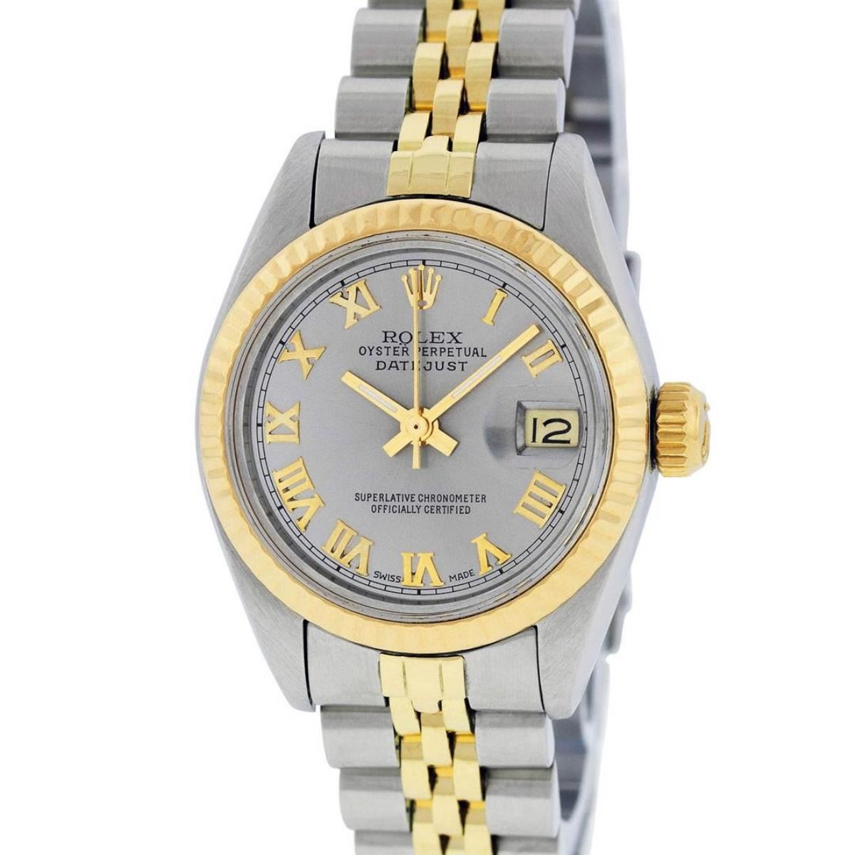 One Ladies 14K Two Tone Rolex Datejust Polished, Serviced & Electronically Tested, 14K Yellow Gold & Stainless Steel, Case Size: 26mm, 14K Yellow Gold Crown, Bezel: 14K Yellow Gold Fluted Bezel. Custom Crystal: New Acrylic Cyclops Lens. Custom Hands: New Luminescent Hands. Movement: Automatic Winding Movement Caliber 2030. Custom Dial: Slate Grey Roman Dial. Date Window: 3 O'Clock Position Date Display, Model: Datejust. Condition: G-6 Extra Fine. Bracelet: Two Tone 14K Yellow Gold & Stainless Steel Jubilee. Bright Polish. 6.0 Inch Length, Adjustable. Standard Clasp, With Rolex Logo. This Watch Has Been Serviced Time Tested And Is In Excellent Condition It Is Free Of All Scratches And Dents.