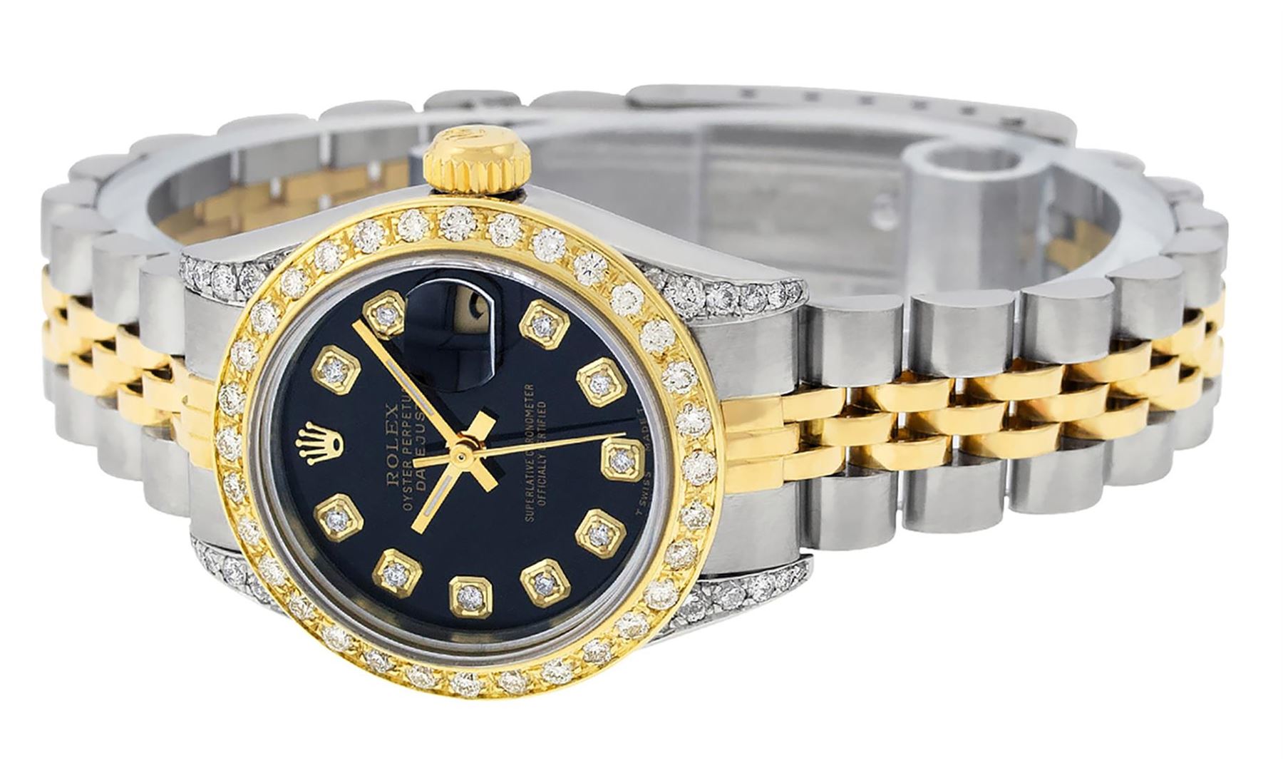 One Ladies Quickset 18K Two Tone Rolex Datejust Polished, Serviced & Electronically Tested, 18K Yellow Gold & Stainless Steel Case: 26mm, 18K Yellow Gold Crown, Diamond Lugs: 24 Diamonds On Lugs, Clarity: SI-VS, Color: G to H, Clarity SI-VS. Custom Bezel: New 18K Yellow Gold Beadset Diamond Bezel, Diamond Count: 32 Diamonds On Bezel, Total Weight .70 Carat, Clarity: SI-VS, Color: G to H. Custom Crystal: New Scratch Resistant Synthetic Sapphire Cyclops Lens. Custom Hands: New Luminescent Hands. Movement: Automatic Winding Movement Caliber 2235. Custom Dial: Refinished Black With Single Cut Diamond Hour Markers, Diamond Count: 10 Diamonds On Dial, Clarity: SI-VS, Color: G to H. Date Window: 3 O'Clock Position Date Display, Model: Quickset Datejust. Condition: G-6 Extra Fine. Bracelet: Two Tone 18K Yellow Gold & Stainless Steel Jubilee Band. Bright Polish. 6.0 Inch Length, Adjustable. Standard Clasp, With Rolex Logo. This Watch Has Been Serviced Time Tested And Is In Excellent Condition It Is Free Of All Scratches And Dents. This Watch Comes With A Rolex Box.