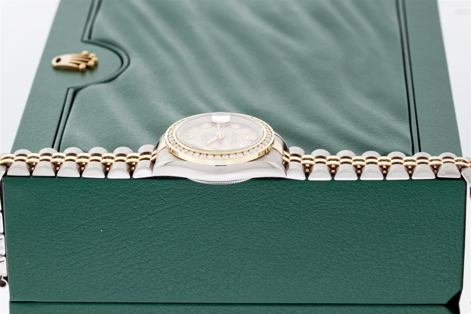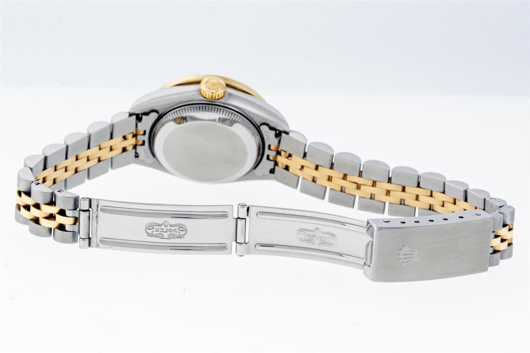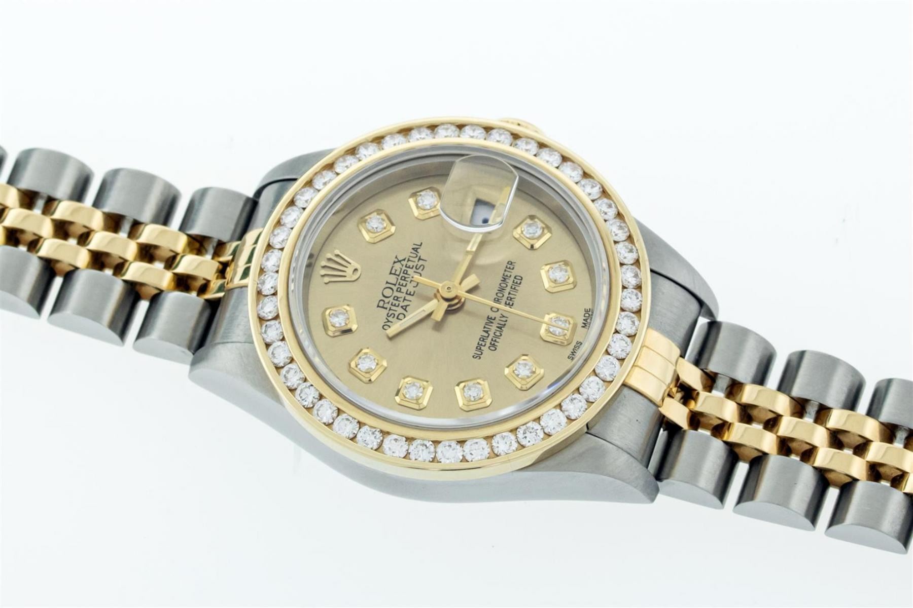One Ladies Quickset 18K Two Tone Rolex Datejust Polished, Serviced & Electronically Tested, 18K Yellow Gold & Stainless Steel Case: 26mm, 18K Yellow Gold Crown. Custom Bezel: New 18K Yellow Gold Beadset Diamond Bezel, Diamond Count: 44 Diamonds On Bezel,