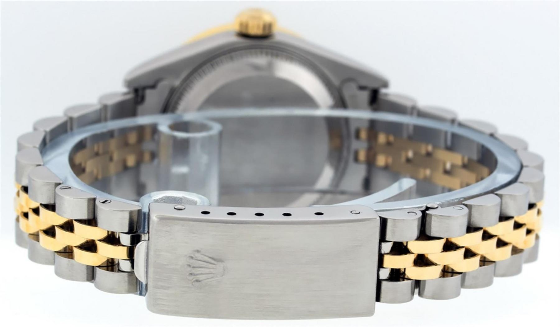 One Ladies Quickset 18K Two Tone Rolex Datejust Polished, Serviced & Electronically Tested, 18K Yellow Gold & Stainless Steel Case: 26mm, 18K Yellow Gold Crown, Diamond Lugs: 24 Diamonds On Lugs, Clarity: SI-VS, Color: G to H, Clarity SI-VS. Custom Bezel: New 18K Yellow Gold Pyramid Diamond Bezel, Diamond Count: 24 Diamonds On Bezel, Total Weight .50 Carat, Clarity: SI-VS, Color: G to H. Custom Crystal: New Scratch Resistant Synthetic Sapphire Cyclops Lens. Custom Hands: New Luminescent Hands. Movement: Automatic Winding Movement Caliber 2235. Custom Dial: Refinished Mother Of Pearl Sapphire String, Stone Count: 33 Diamonds + 10 Sapphires On Dial, Clarity: SI-VS, Color: G to H. Date Window: 3 O'Clock Position Date Display, Model: Quickset Datejust. Condition: G-6 Extra Fine. Bracelet: Two Tone 18K Yellow Gold & Stainless Steel Jubilee Band. Bright Polish. 6.0 Inch Length, Adjustable. Standard Clasp, With Rolex Logo. This Watch Has Been Serviced Time Tested And Is In Excellent Condition It Is Free Of All Scratches And Dents. This Watch Comes With A Rolex Box.