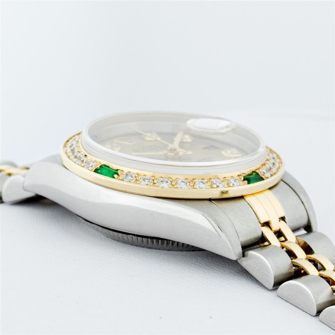 One Ladies 18K Two Tone Rolex Datejust Polished, Serviced & Electronically Tested, 18K Yellow Gold & Stainless Steel Case: 26mm, 18K Yellow Gold Crown, Custom Bezel: New 18K Yellow Gold Emerald Beadset Diamond Bezel, Diamond + Gem Count: 28 Diamonds + 4 Emeralds Total Weight .70 Carat, Clarity: SI-VS, Color: G to H. Custom Crystal: New Scratch Resistant Synthetic Sapphire Cyclops Lens. Custom Hands: New Luminescent Hands. Movement: Quickset Automatic Winding Movement. Custom Dial: Champagne Dial Set With Diamond Hour Markers, Diamond Count: 10 Single Cut VS Diamonds in Dial, G To H In Color, VS Clarity. Date Window: 3 O'Clock Position Date Display, Model: Datejust, Condition: G-6 Extra Fine. Bracelet: Two Tone 18K Yellow Gold & Stainless Steel Jubilee. Bright Polish. 6.0 Inch Length, Adjustable. Standard Clasp, With Rolex Logo. This Watch Has Been Serviced Time Tested And Is In Excellent Condition It Is Free Of All Scratches And Dents.
