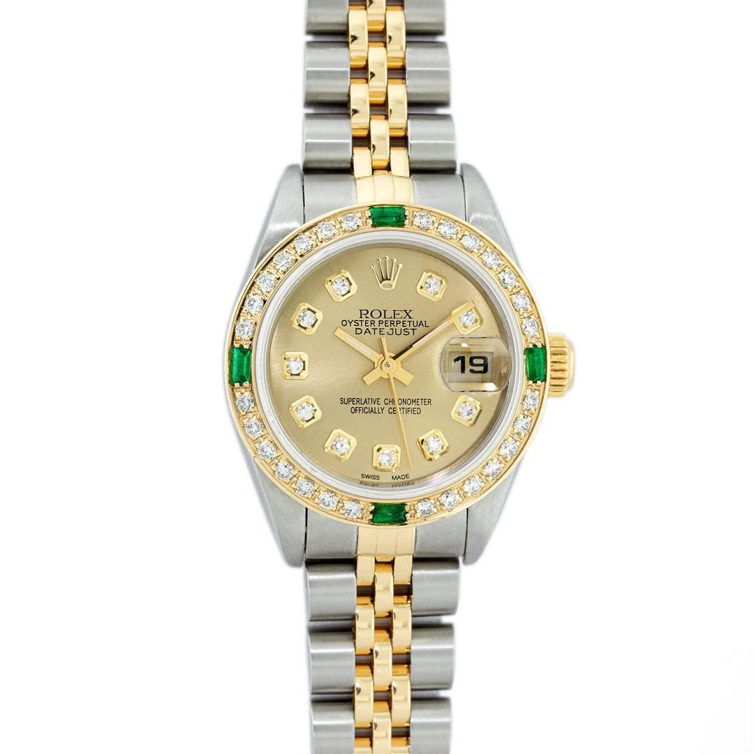 One Ladies 18K Two Tone Rolex Datejust Polished, Serviced & Electronically Tested, 18K Yellow Gold & Stainless Steel Case: 26mm, 18K Yellow Gold Crown, Custom Bezel: New 18K Yellow Gold Emerald Beadset Diamond Bezel, Diamond + Gem Count: 28 Diamonds + 4 Emeralds Total Weight .70 Carat, Clarity: SI-VS, Color: G to H. Custom Crystal: New Scratch Resistant Synthetic Sapphire Cyclops Lens. Custom Hands: New Luminescent Hands. Movement: Quickset Automatic Winding Movement. Custom Dial: Champagne Dial Set With Diamond Hour Markers, Diamond Count: 10 Single Cut VS Diamonds in Dial, G To H In Color, VS Clarity. Date Window: 3 O'Clock Position Date Display, Model: Datejust, Condition: G-6 Extra Fine. Bracelet: Two Tone 18K Yellow Gold & Stainless Steel Jubilee. Bright Polish. 6.0 Inch Length, Adjustable. Standard Clasp, With Rolex Logo. This Watch Has Been Serviced Time Tested And Is In Excellent Condition It Is Free Of All Scratches And Dents.