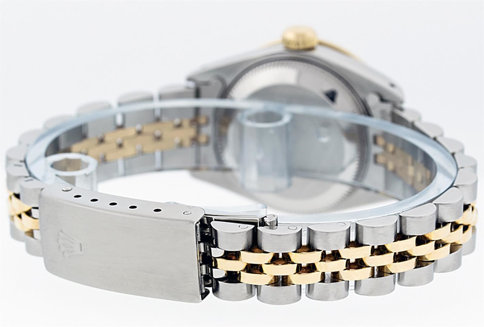 One Ladies Two Tone Rolex Datejust Polished, Serviced & Electronically Tested, Yellow Gold & Stainless Steel Case: 26mm, Yellow Gold Crown, Custom Bezel: New 18K New Yellow Gold Beadset + Sapphire Diamond Bezel, Stone Count: 28 Diamonds + 4 Sapphires In Bezel, Total Weight .70 Carat, Clarity: SI-VS, Color: G to H. Custom Crystal: New Scratch Resistant Synthetic Sapphire Cyclops Lens. Custom Hands: New Luminescent Hands. Movement: Automatic Winding Movement. Custom Dial: Blue Mother Of Pearl With String Single Cut Diamond Hour Markers, Diamond Count: 43 Diamonds In Dial, Clarity: SI-VS, Color: VS2. Date Window: 3 O'Clock Position Date Display, Model: Datejust. Condition: G-6 Extra Fine. Bracelet: Two Tone Yellow Gold & Stainless Steel Jubilee Band. Bright Polish. 6.0 Inch Length, Adjustable. Standard Clasp, With Rolex Logo. This Watch Has Been Serviced Time Tested And Is In Excellent Condition It Is Free Of All Scratches And Dents.