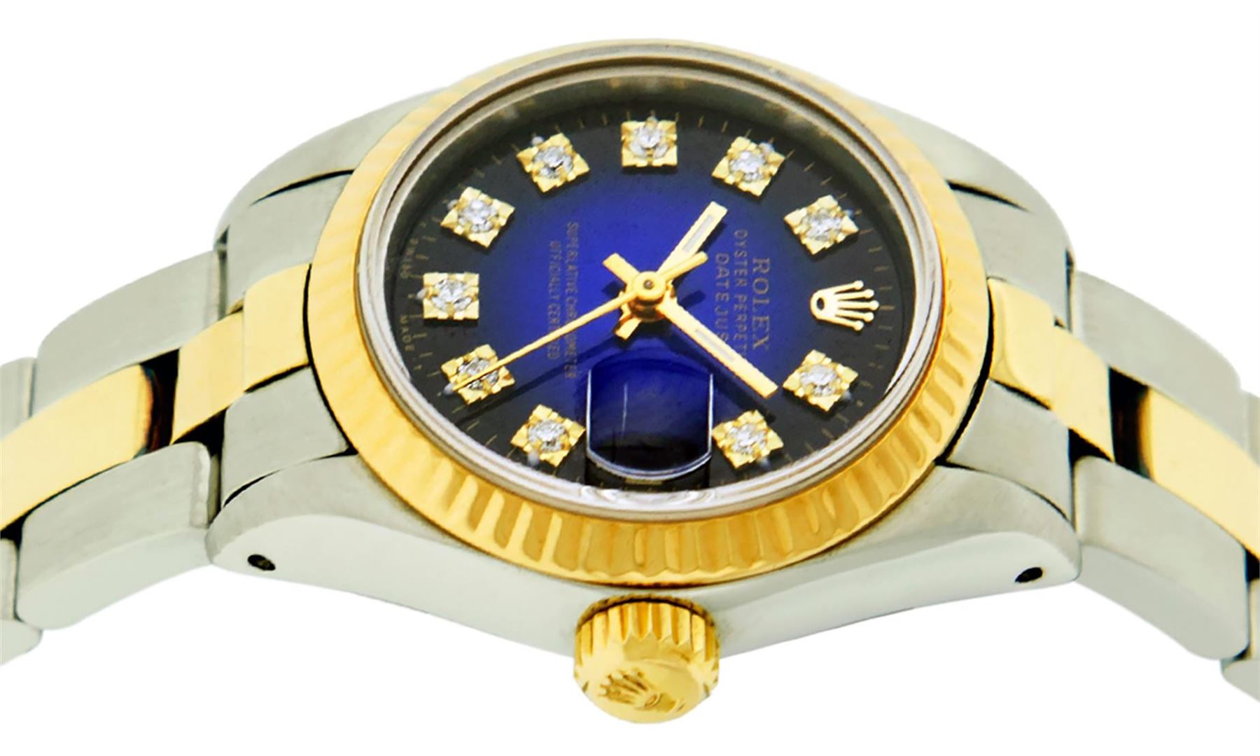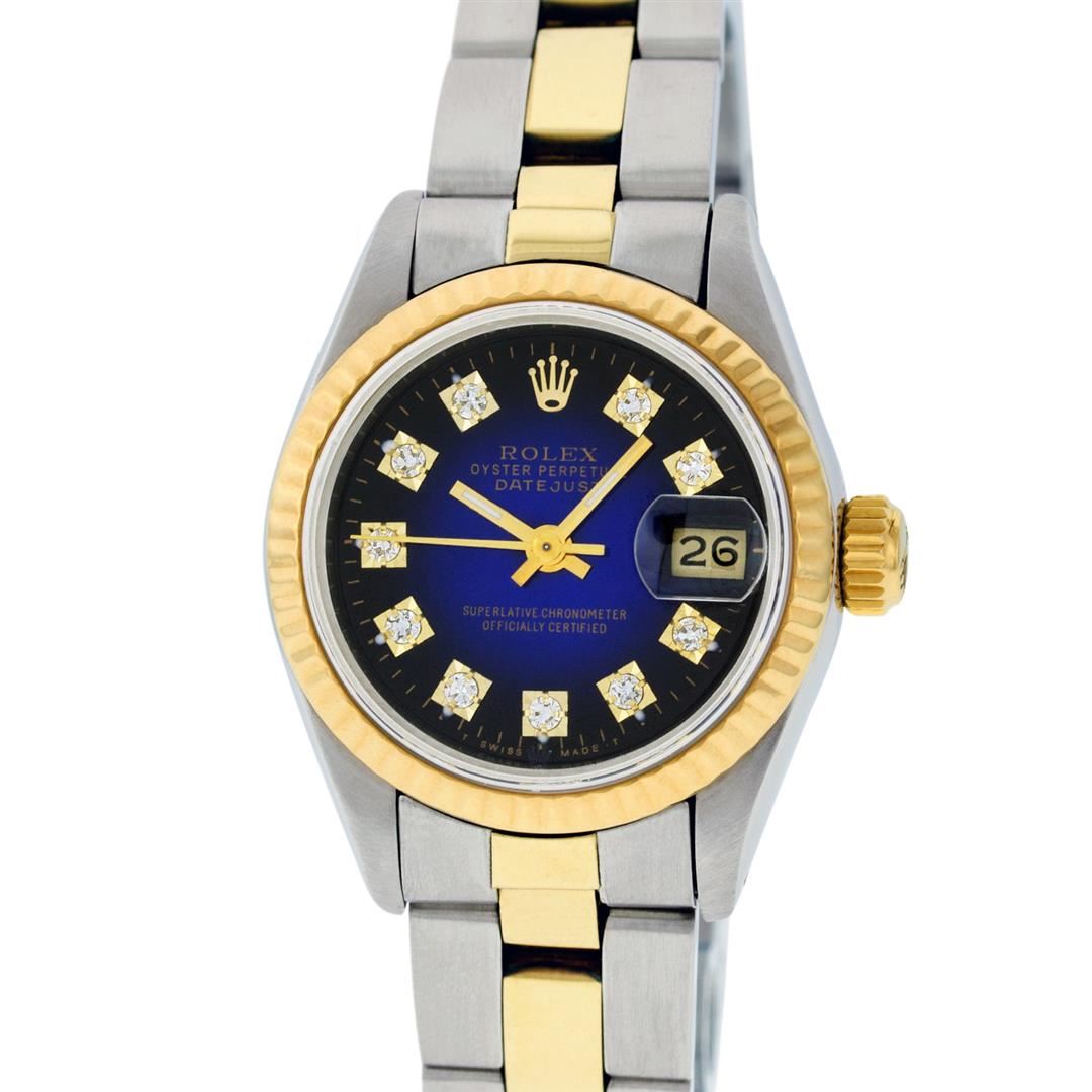 One Ladies Two Tone Rolex Datejust Polished, Serviced & Electronically Tested, Yellow Gold & Stainless Steel Case: 26mm, Yellow Gold Crown, Bezel: Yellow Gold Fluted Bezel. Custom Crystal: New Acrylic Cyclops Lens. Custom Hands: New Luminescent Hands. Movement: Automatic Winding Movement. Custom Dial: Blue Vignette With Diamond Hour Markers, Diamond Count: 10 Single Cut Diamonds, Color: G to H, Clarity: VS. Date Window: 3 O'Clock Position Date Display, Model: Datejust. Condition: G-6 Extra Fine. Bracelet: Two Tone Yellow Gold & Stainless Steel Jubilee. Bright Polish. 6.0 Inch Length, Adjustable. Standard Clasp, With Rolex Logo. This Watch Has Been Serviced Time Tested And Is In Excellent Condition It Is Free Of All Scratches And Dents.