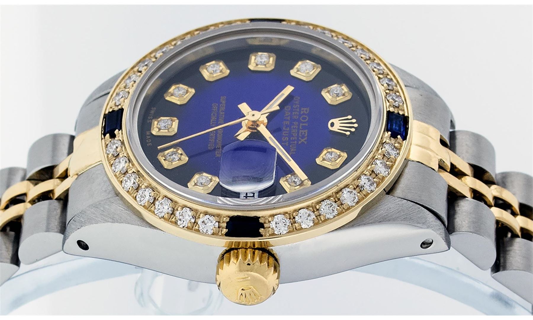 One Ladies Two Tone Rolex Datejust Polished, Serviced & Electronically Tested, Yellow Gold & Stainless Steel Case: 26mm, Yellow Gold Crown, Custom Bezel: New 18K Yellow Gold Sapphire Beadset Diamond Bezel, Diamond + Gem Count: 28 Diamonds + 4 Sapphires Total Weight .70 Carat, Clarity: Si-VS, Color: G to H. Custom Crystal: New Synthetic Sapphire Cyclops Lens. Custom Hands: New Luminescent Hands. Movement: Automatic Winding Movement. Custom Dial: Blue Vignette Dial Set With Diamond Hour Markers, Diamond Count: 10 Diamond in Dial, G To H In Color, SI-VS Clarity. Date Window: 3 O'Clock Position Date Display, Model: Datejust, Condition: G-6 Extra Fine. Bracelet: Two Tone Yellow Gold & Stainless Steel Jubilee. Bright Polish. 6.0 Inch Length, Adjustable. Standard Clasp, With Rolex Logo. This Watch Has Been Serviced Time Tested And Is In Excellent Condition It Is Free Of All Scratches And Dents.